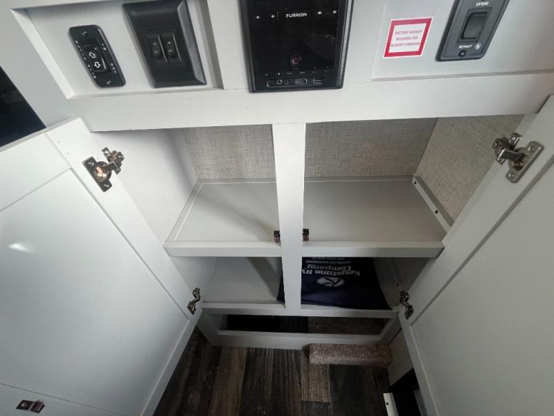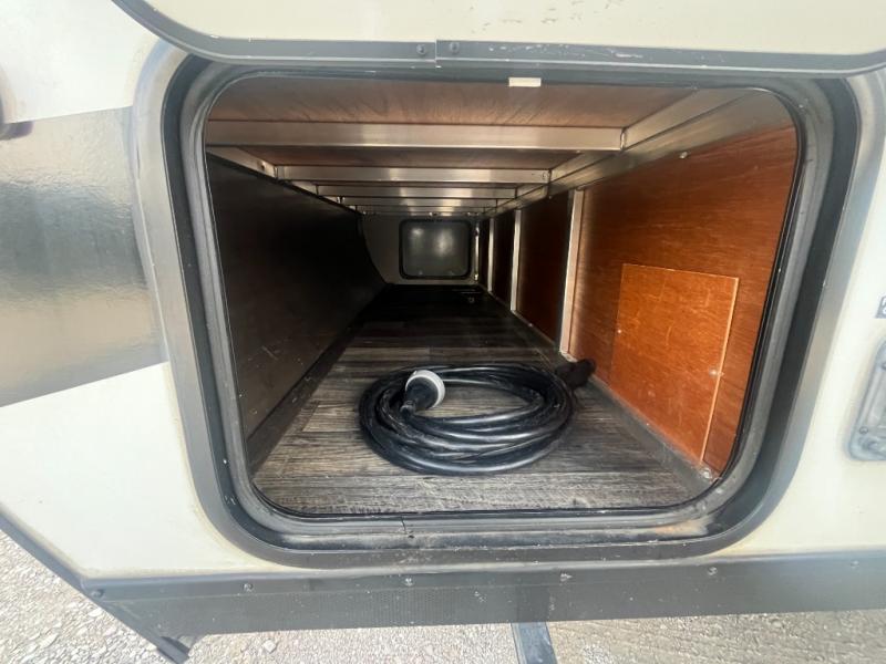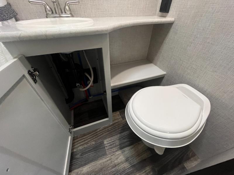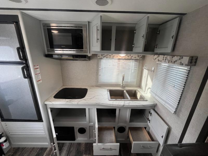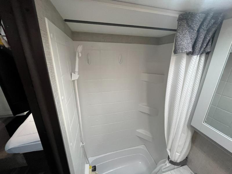 If camping on the weekends with your friends and family sounds fun, then this Bullet Crossfire travel trailer is the perfect unit for you. After a fun day of hiking, biking, and swimming, you can dine together on the U-shaped dinette or take a quick nap on the queen-size bed. If you don't feel like preparing a full meal for dinner, you can grab the left overs that you have stored in the 6 cubic foot double-door refrigerator and heat them up in the microwave for an easy meal. The kitchen pantry will be where you head to late at night when you are looking for that last box of cookies or a bag of popcorn.