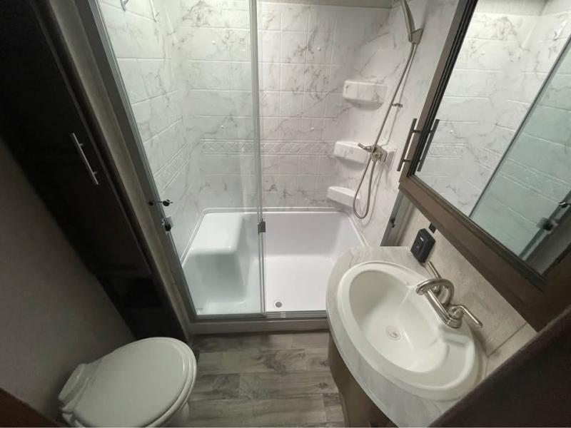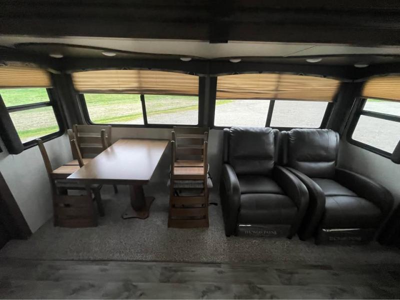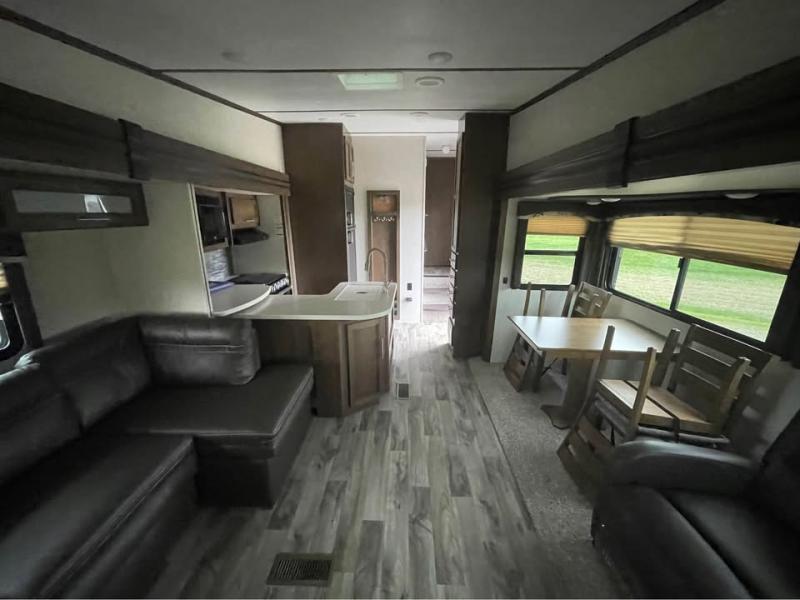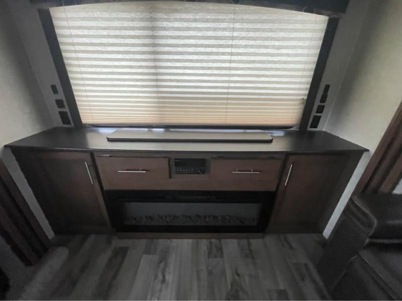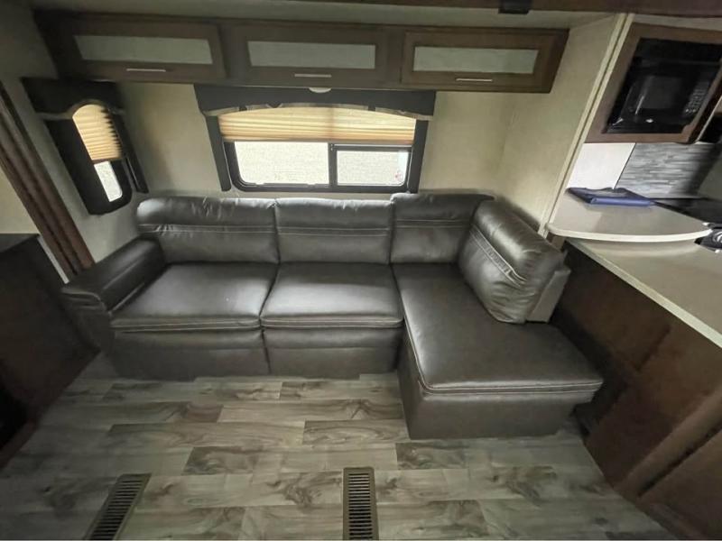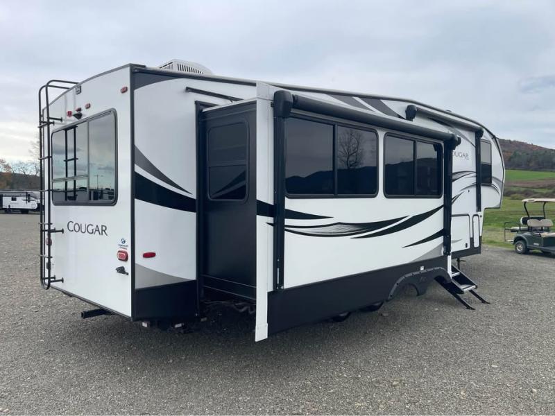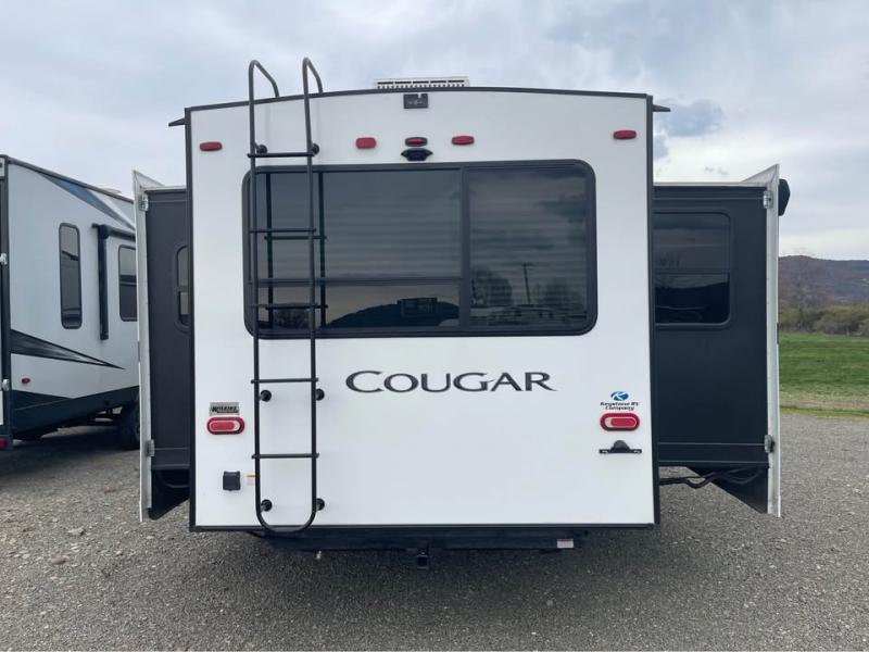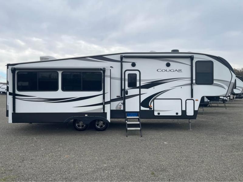 If you enjoy entertaining and prefer a fifth wheel over other RVs, take a look at this Cougar Half-Ton. From the Hitch Vision backup mirror providing a safe and easy way to hitch up, to the two slide outs in the main living area providing more interior floor space for visiting with other campers, you are sure to love this layout. Just imagine watching the pop-up TV and the entertainment center along the rear wall after a fun day outside. You have multiple seating choices including two recliners and a unique L-shaped sofa. The wardrobe slide in the bedroom offers additional storage and more floor space as well, plus there is more to find like the L-shaped peninsula kitchen countertop, and the convenient pivot hinge bath door. You even have a few options as well. Take a look, you will be glad you did!