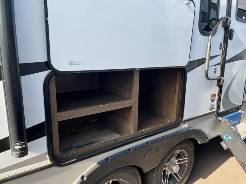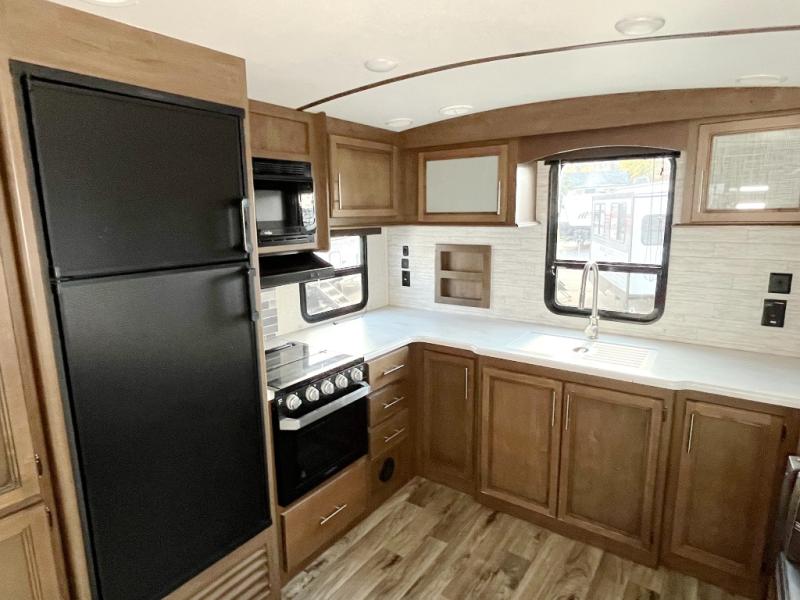 How does a king bed slide within a master suite sound? With this Cougar Half-Ton travel trailer, you'll have extra floor space and a full-length wardrobe allowing you to stay at your favorite campsite for long periods of time. The second slide located in the main living and kitchen area opens up this space for you to enjoy time spent inside just as much as outdoor adventures. The furniture even doubles as sleeping space for the kids or overnight guests. The rear kitchen layout is a convenience, and you will appreciate all the counter space for preparing and serving meals. You will find hidden storage behind the entertainment center, and next to the entertainment center is a pantry where you can store your favorite snacks.