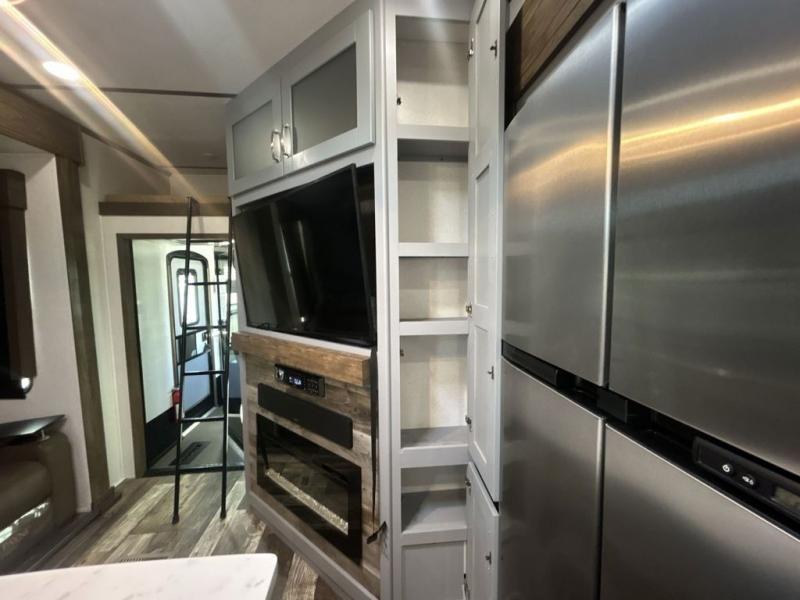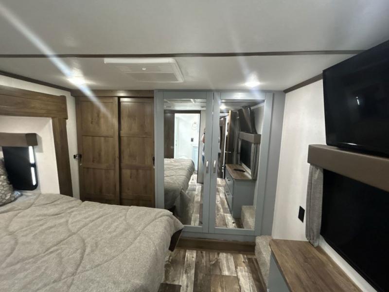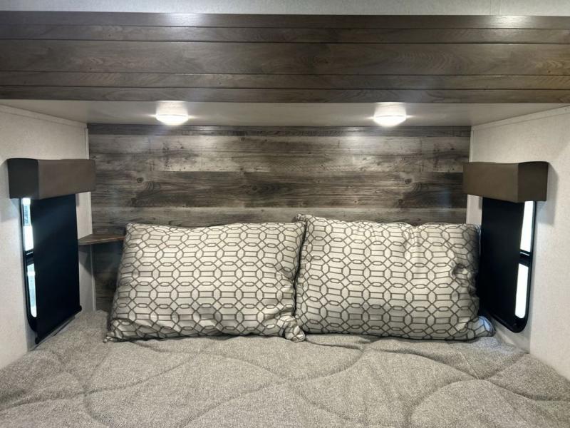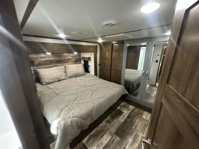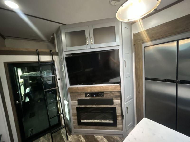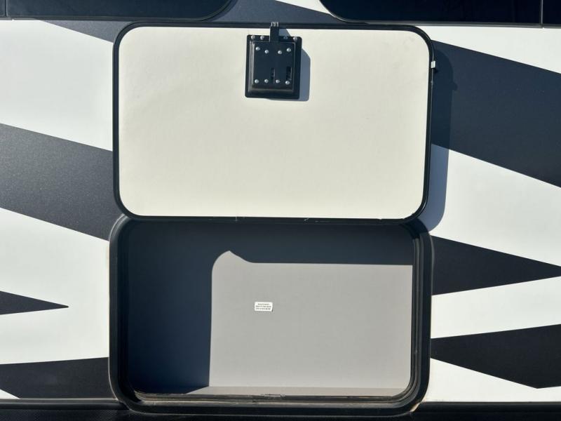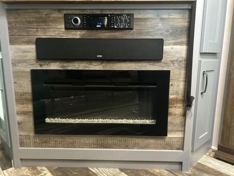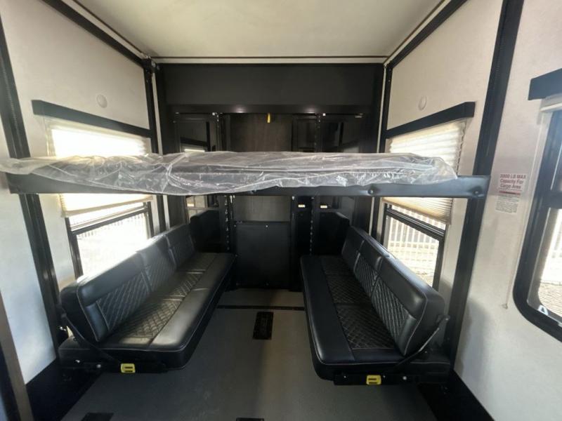 You can't go wrong camping in this toy hauler! There won't be any excuse not to stay clean with the bath and a half. Eating your meals will be comfortable and fun at the center table with four swing out stools to sit on and the slide out sofa is big enough to seat four people or for one to spread out and take a quick afternoon nap. You will also enjoy all of the entertainment inside with the two LED TV's and the fireplace. This model features a front master suite with a slide out queen bed, a master closet, and a space prepped to add a washer and dryer if you choose.