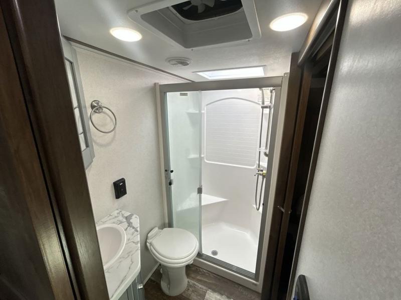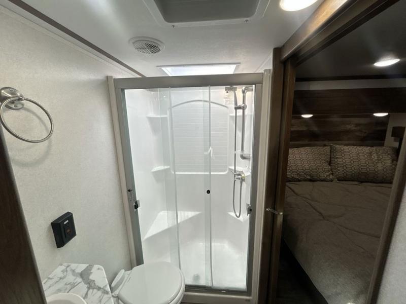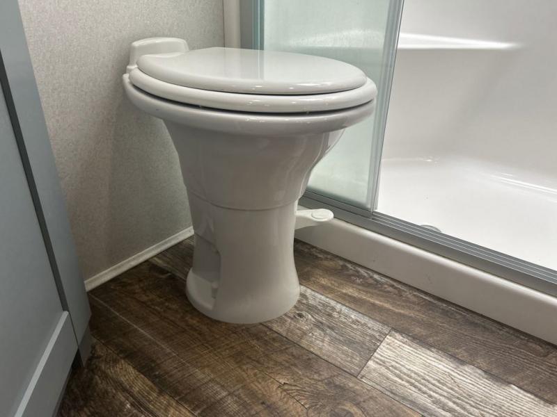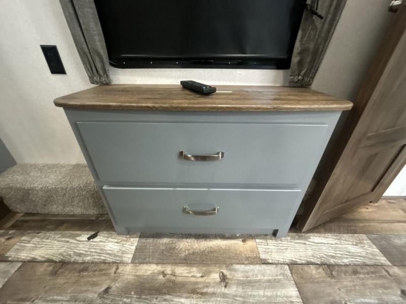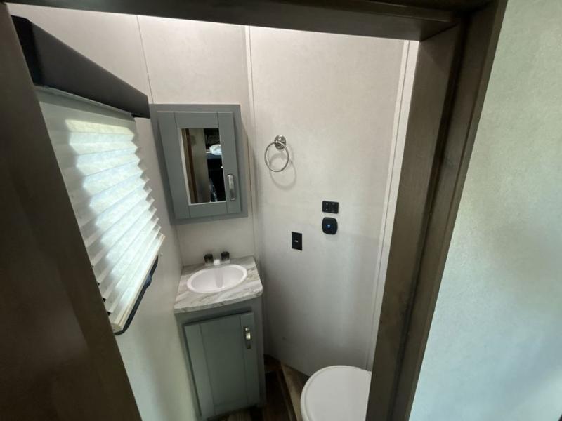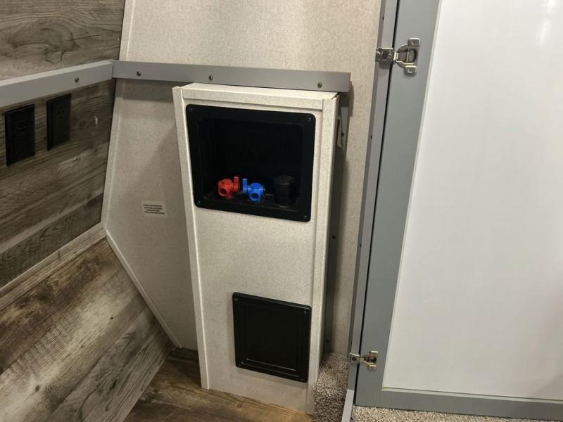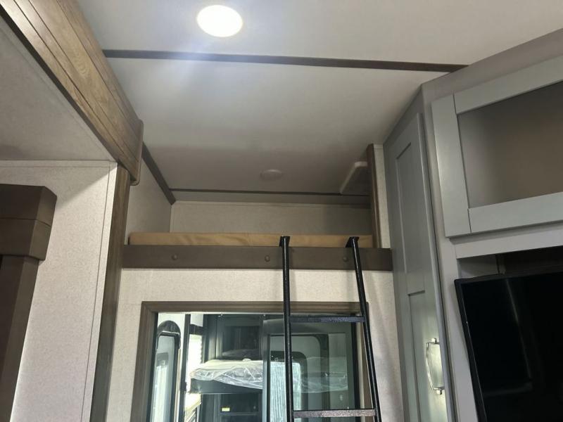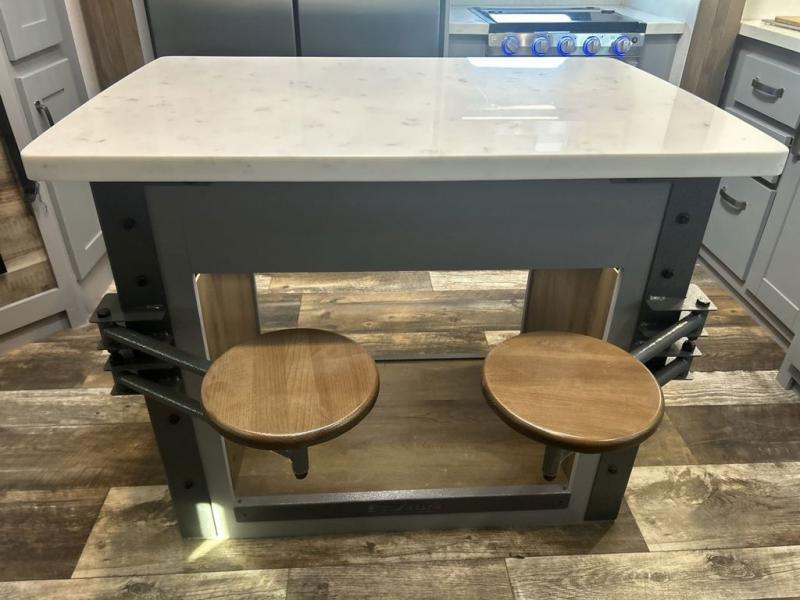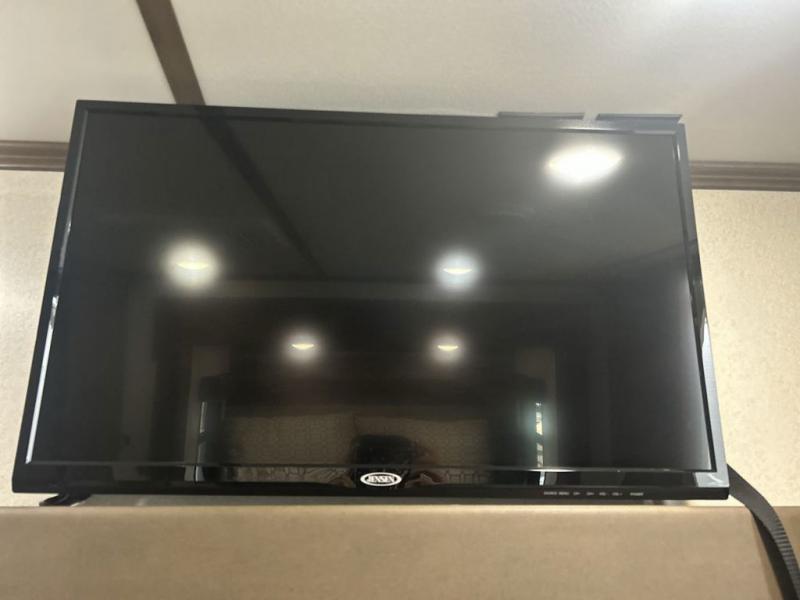 You can't go wrong camping in this toy hauler! There won't be any excuse not to stay clean with the bath and a half. Eating your meals will be comfortable and fun at the center table with four swing out stools to sit on and the slide out sofa is big enough to seat four people or for one to spread out and take a quick afternoon nap. You will also enjoy all of the entertainment inside with the two LED TV's and the fireplace. This model features a front master suite with a slide out queen bed, a master closet, and a space prepped to add a washer and dryer if you choose.