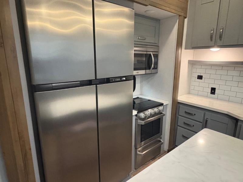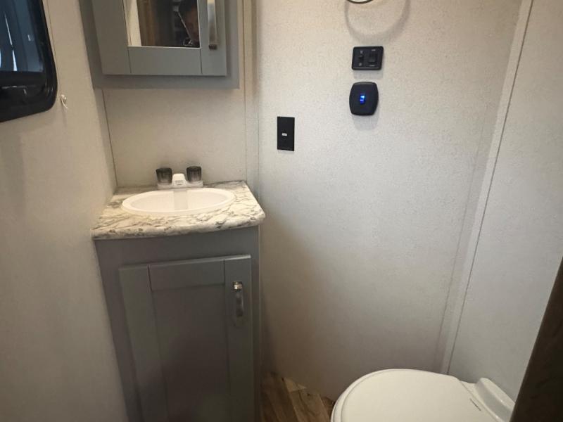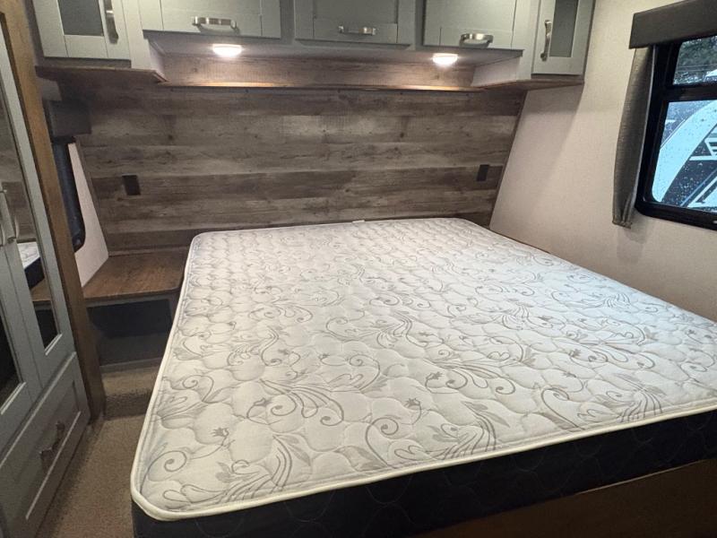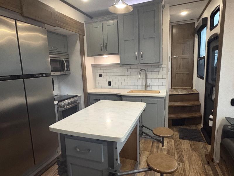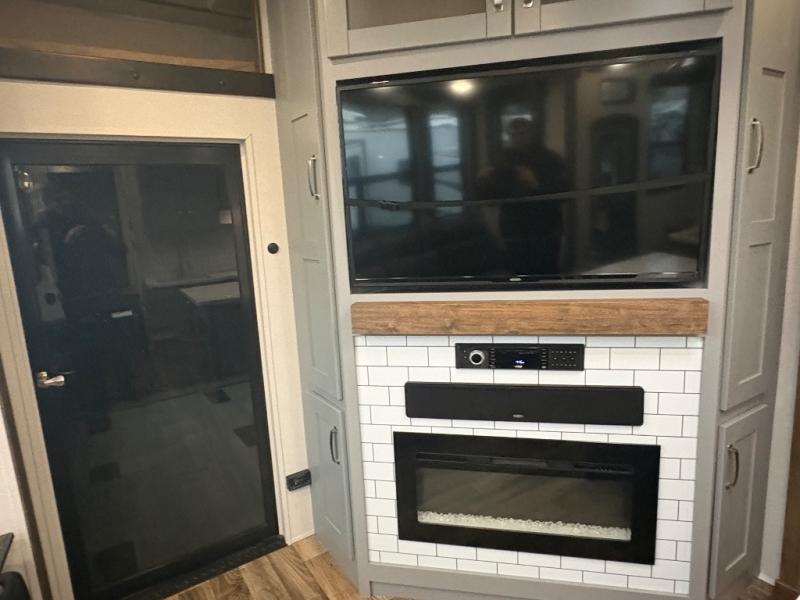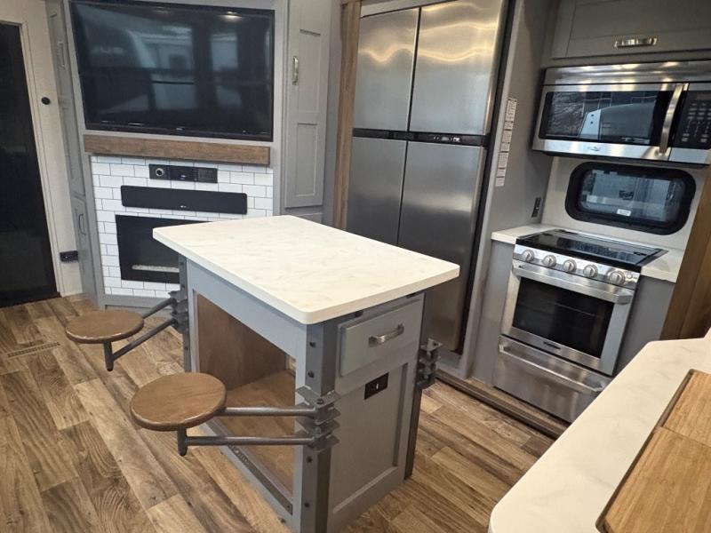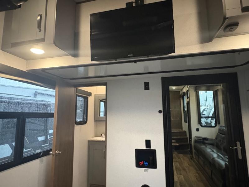 You can't go wrong camping in this toy hauler! There won't be any excuse not to stay clean with the bath and a half. Eating your meals will be comfortable and fun at the center table with four swing out stools to sit on and the slide out sofa is big enough to seat four people or for one to spread out and take a quick afternoon nap. You will also enjoy all of the entertainment inside with the two LED TV's and the fireplace. This model features a front master suite with a slide out queen bed, a master closet, and a space prepped to add a washer and dryer if you choose.