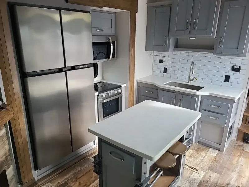 Once you step inside this toy hauler you won't want to camp any other way! The front private bedroom has a residential queen bed that can be switched out for the optional Fuzion king bed instead, a large wardrobe slide out to keep your hang up clothes, and your very own access into the dual entry bathroom. Inside the bathroom, you will find everything you need to get squeaky clean each morning including a skylight above the residential shower with a seat for added natural lighting. The center table with four swing out stools is sure to be a hit and the four person sofa slide out is the perfect place to relax while you enjoy watching your favorite movie on the LED TV!
