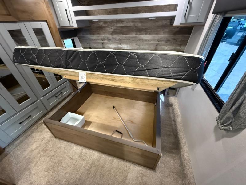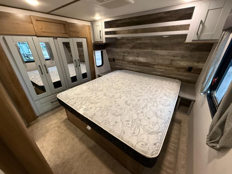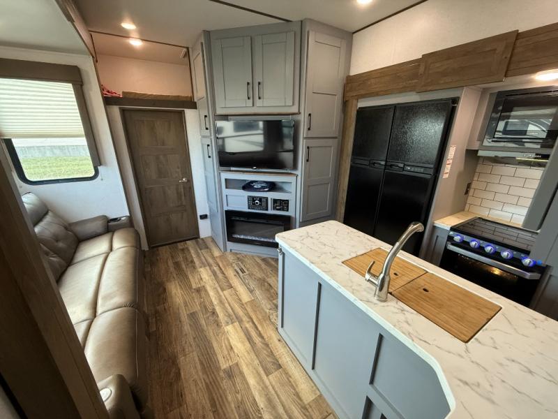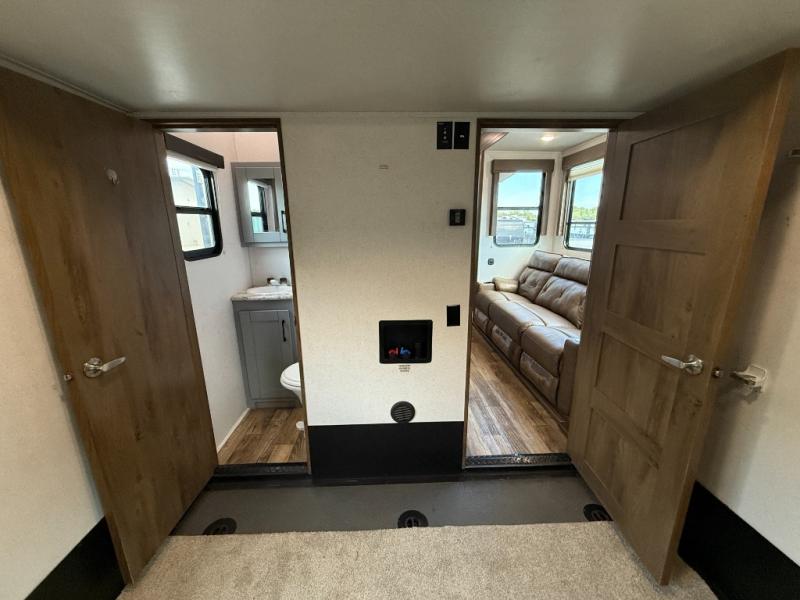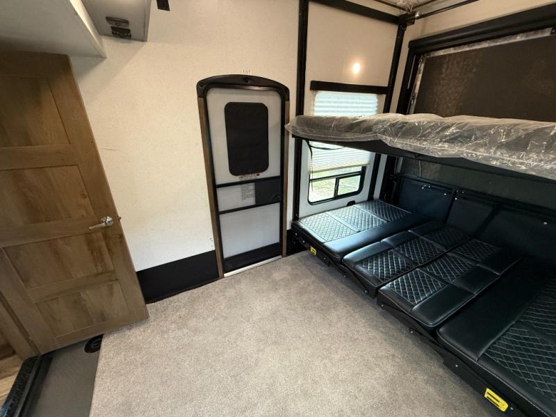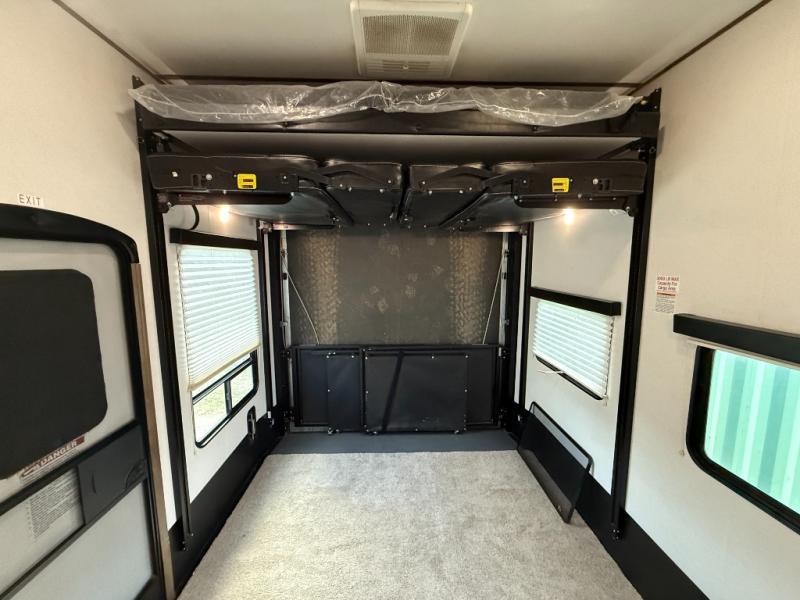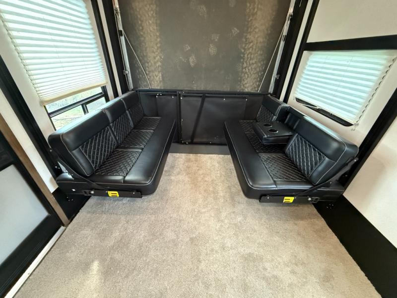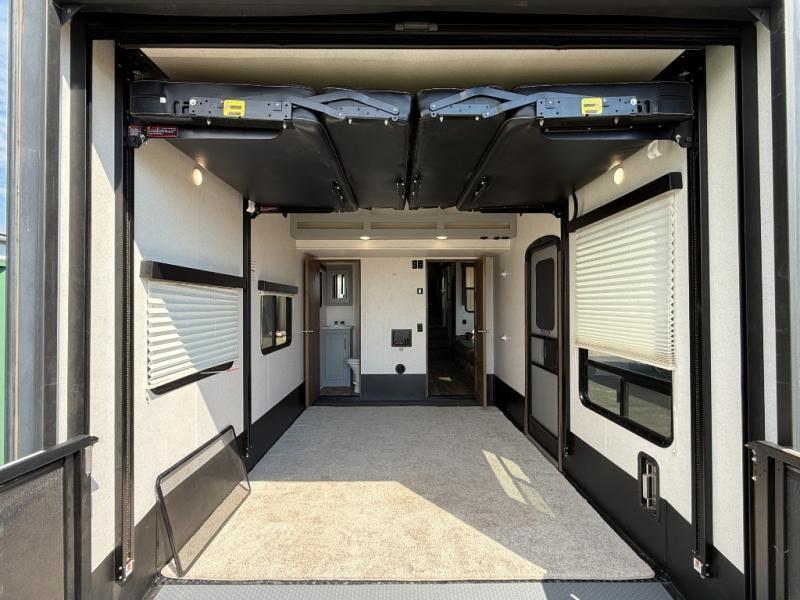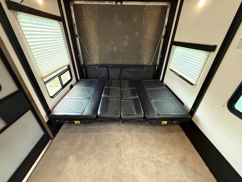 Keystone specifically keeps you, the customer, in mind as they construct and build each Fuzion Impact Edition toy hauler. The 100" wide body and 5k interlock system with frame-welded tie-downs ensure convenient and secure shipment of your favorite ride-on toys. You will appreciate the Keystone Exclusives, such as the Tru-fit slide construction, the in-floor heating ducts, 4G LTE and Wi-Fi prep, plus many more hassle-free features. Each model includes a 30-gal. fuel station with a 12V pump and a static line and the Omni-Chill A/C system, which is the highest-performing energy-efficient system available. Inside, you will love the hardwood cabinetry, pressed countertops in the kitchen, and large tinted safety-glass panoramic windows to let natural light in. These toy haulers also feature plenty of storage space for all your belongings, including under-bed storage and a lighted pass-through compartment!