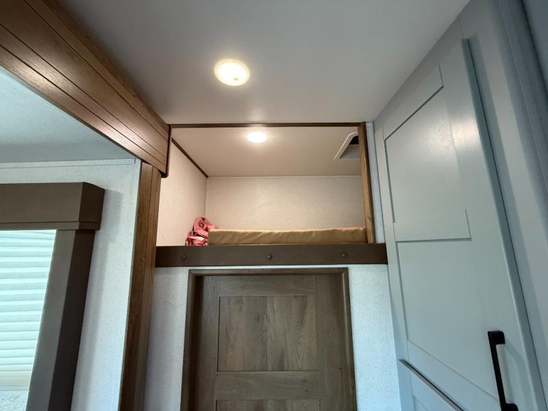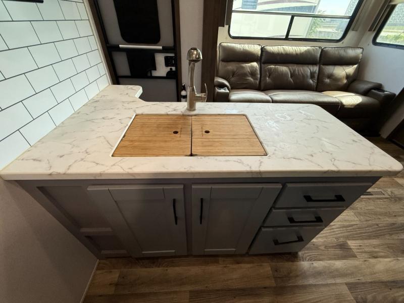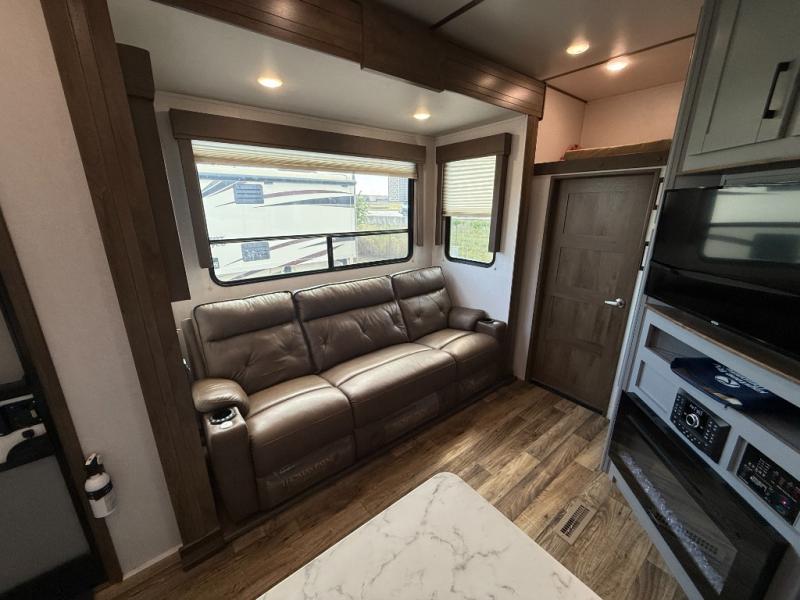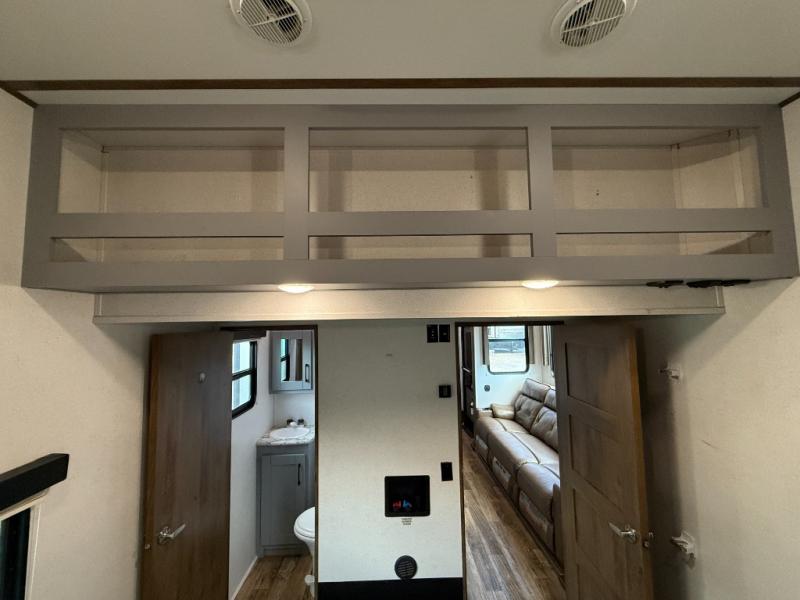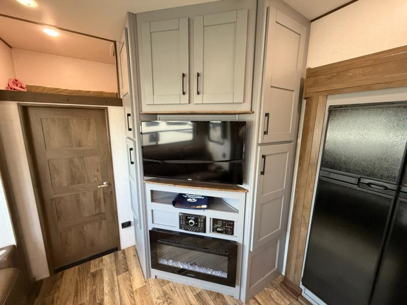 Step inside this Fuzion Impact Edition fifth wheel toy hauler for a fun trail-riding weekend. You can easily unload your toys from the 13' separate garage using the 8' garage door. Once the toys are unloaded, relax on the dual opposing sofas, or take a rest on the electric queen bed. The kids or guests can climb up into the loft that includes a bunk mat, and there is a half bath in the garage for added convenience. This model includes a peninsula countertop with plenty of space to prep meals and clean up, and there is a 12-cu. ft. refrigerator for perishables. You'll find a residential shower with a seat in the dual-entry bath, and the front bedroom will feel just like home with its residential queen bed and wardrobe slide for all your clothes.