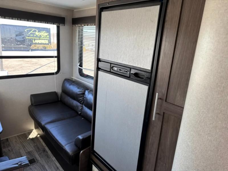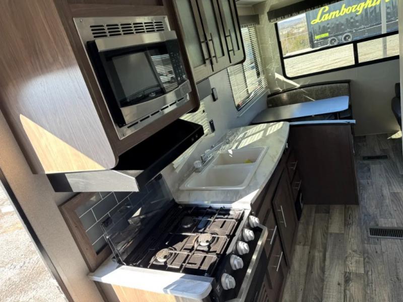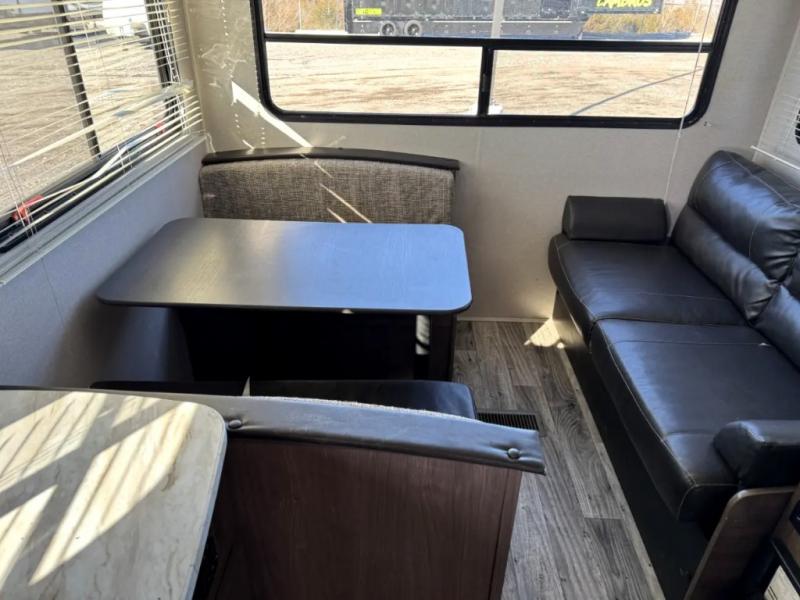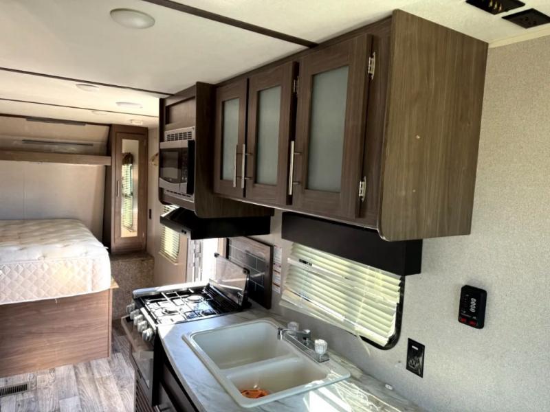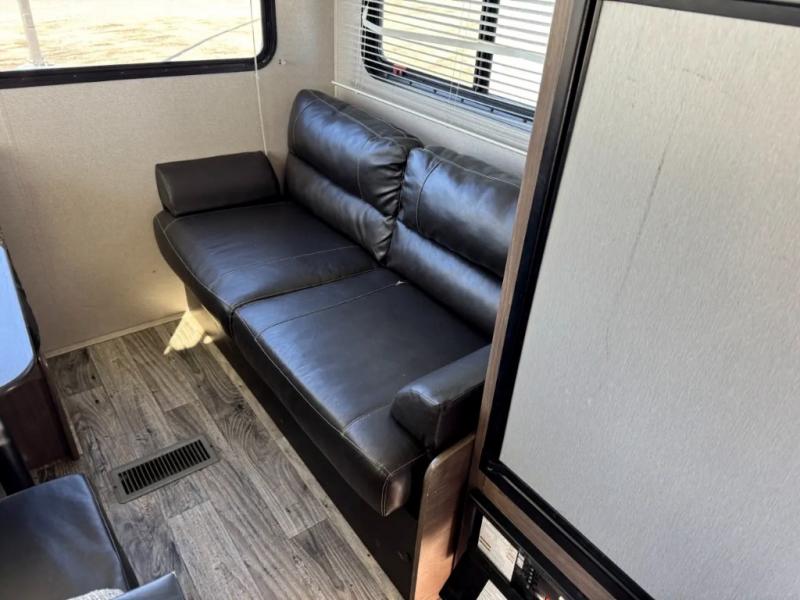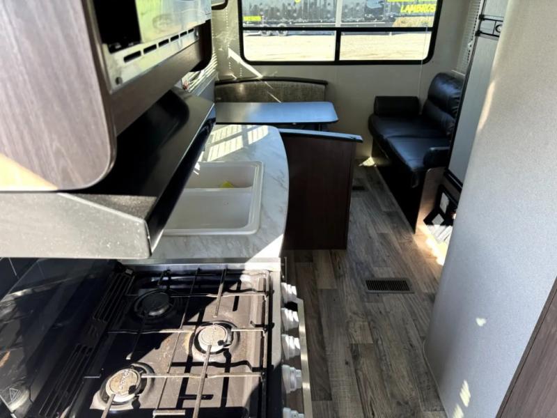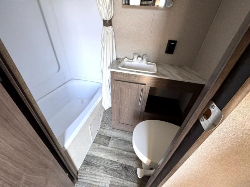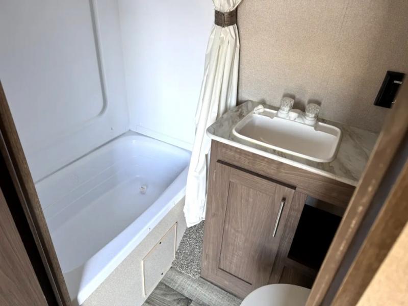 Your family of five will enjoy camping in this Hideout travel trailer as you tour the countryside or take a weekend getaway. The front bedroom area has two closets and overhead cabinets that provide plenty of storage solutions for your extra garments and toiletries, and the queen-size bed delivers complete relaxation throughout the night. You will find it easy to get ready for the day with all of the amenities in the full bathroom, and you will love being able to toss your dirty clothes into the hidden laundry chute.
