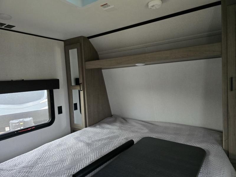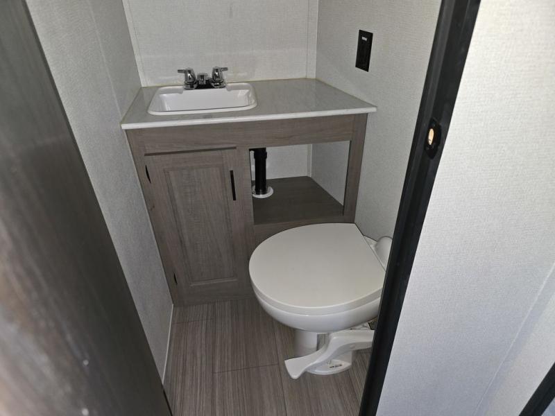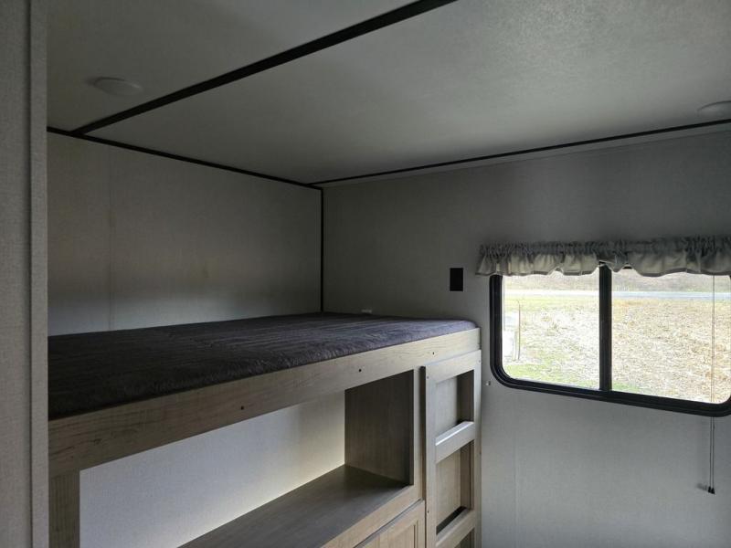 You will love every trip you take in this Hideout travel trailer! Because of its ability to sleep eight people during every excursion, this trailer is an essential part of every large family's travel plans. Because the rear bunkhouse suite also contains its own half bathroom, it is the perfect place to house children or guests, and the front private bedroom also provides security and seclusion as you sleep peacefully on the queen-size bed. You will also appreciate the extra interior space that comes from the addition of two slides.