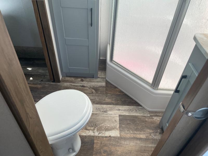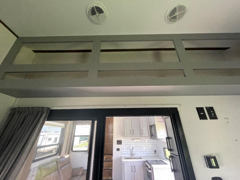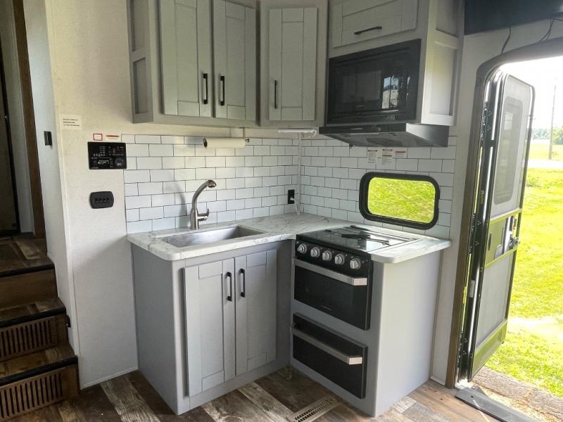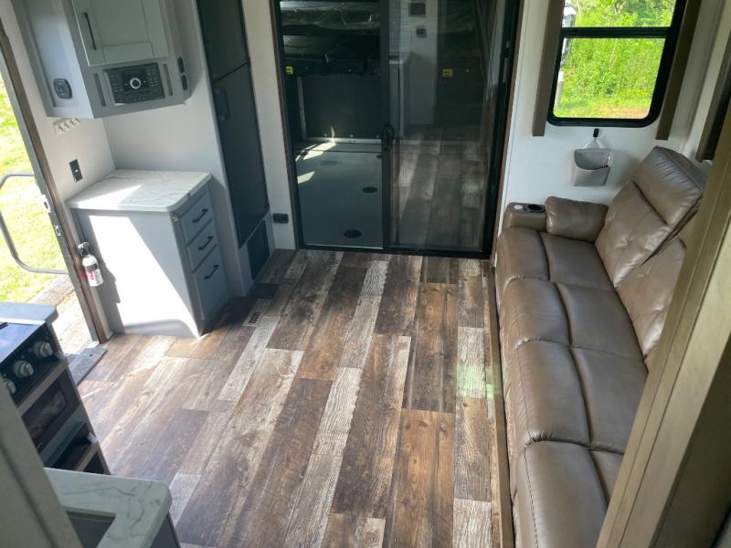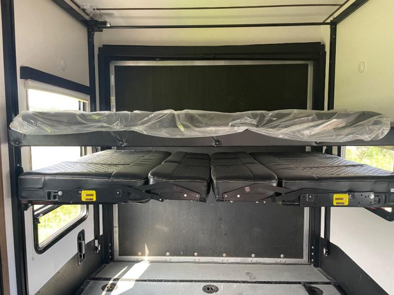 Imagine yourself and your family packing up your toys and heading to the campground of your choice in complete confidence and style with this toy hauler. With 10' of separate garage space and an 8' rear ramp door, loading and unloading won't take much time at all. Once the toys are unloaded, you can setup the dual opposing sofas and/or the top queen-size bed for more living and sleeping space whenever you have extra guests traveling along with you. The separate kitchen and living area provides some privacy from the cargo area, offers an L-shaped counter with a stainless steel single bowl sink that makes cleaning up after dinner a breeze, and you will find a double entry bathroom and master bedroom to retreat to after a hard day on the trails!
