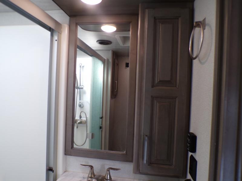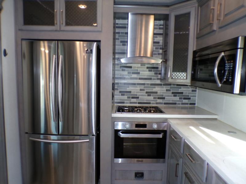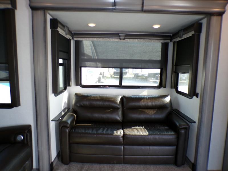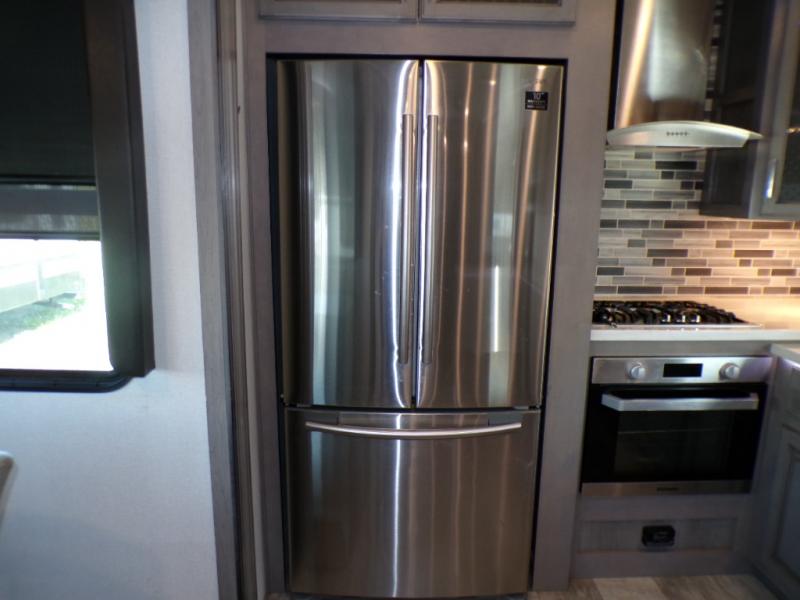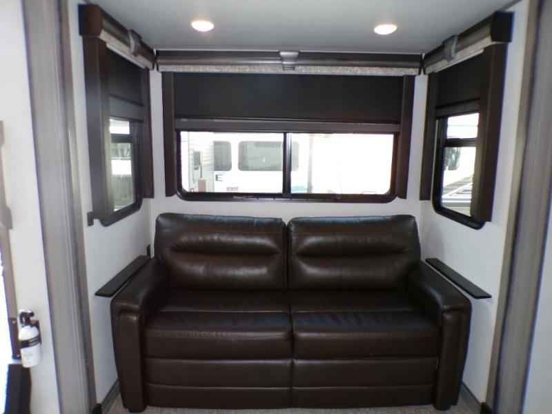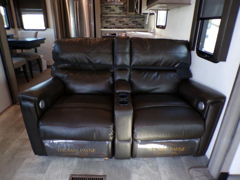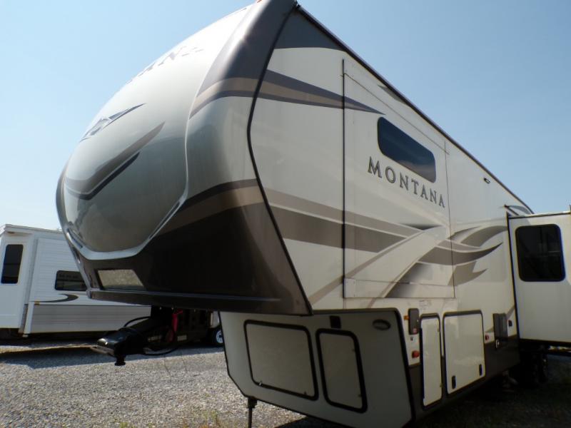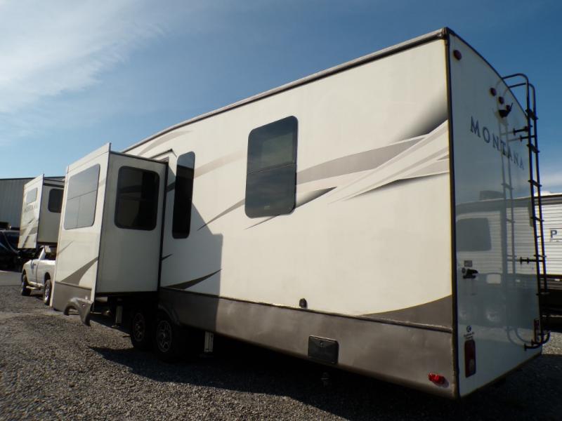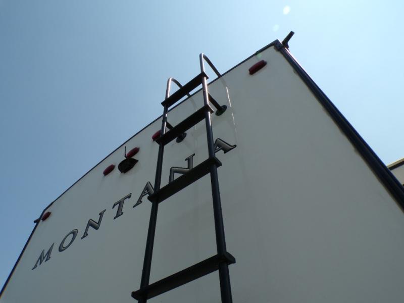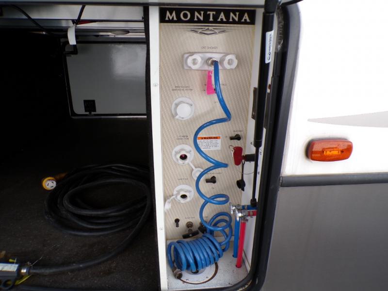 Just imagine you and your spouse and maybe your children camping at a state park or local RV spot in this Montana fifth wheel. Everyone will enjoy the floor space throughout provided by four slide outs. The rear kitchen layout offers plenty of counter space and all the appliances necessary to make meals the whole trip including an 18 cu. ft. residential refrigerator and convection microwave. Now imagine yourself relaxing on one of the two opposing hide-a-bed sofas after hiking, biking, or fishing earlier that day. There is a 50" HDTV, a fireplace, and theatre seats with power recliners as well. It's time to stop dreaming about your next get-a-way trip, and start living it.