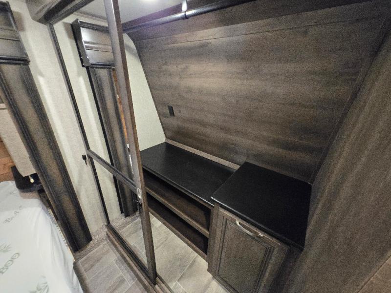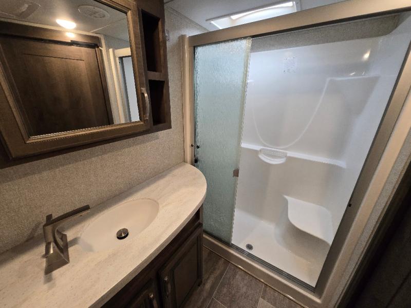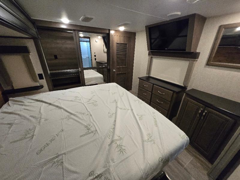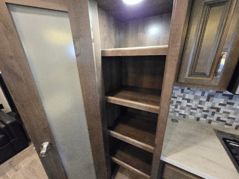 It's time to start planning your next campout with family and friends in this Montana fifth wheel. Just imagine a wide open living and kitchen area thanks to the dual opposing slide outs. You are sure to enjoy the theatre seats with power recliners and additional furniture when watching the HDTV and keeping warm from the fireplace. The cook can prepare meals and the guests can wash the dishes on the kitchen island. There is an 18 cu. ft. RV refrigerator and pantry to keep all your food stowed away, plus a convection microwave and three burner range to make a warm meal. The master bedroom includes a slide out that stretches into the hallway giving you more space to add a washer and dryer if you like that option. You also have dual entry into the bath as an added convenience especially at night.