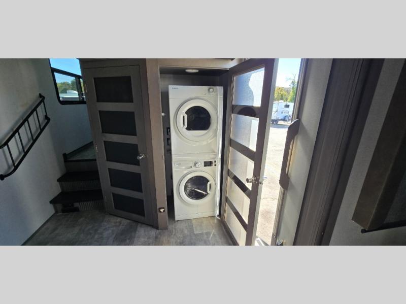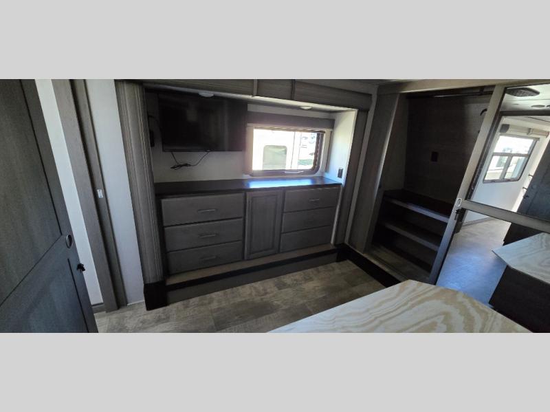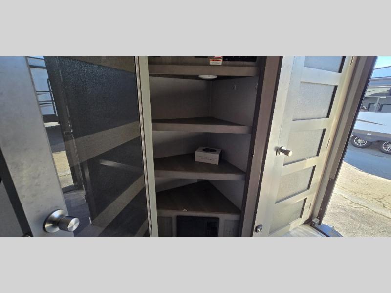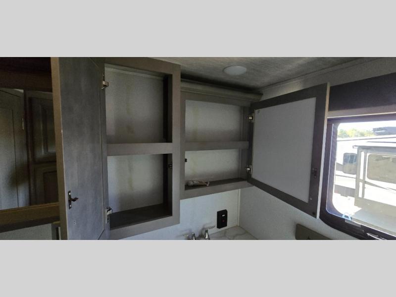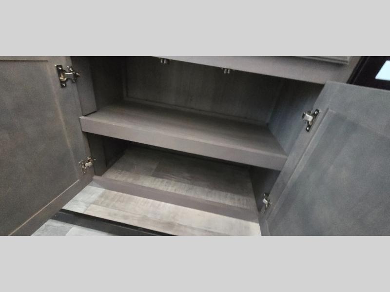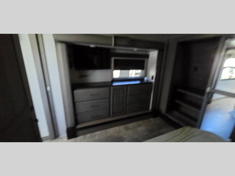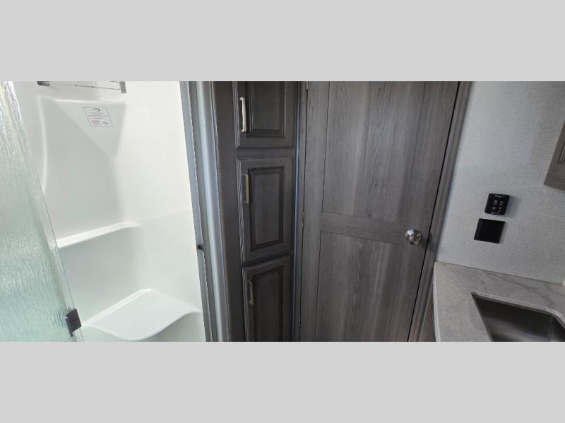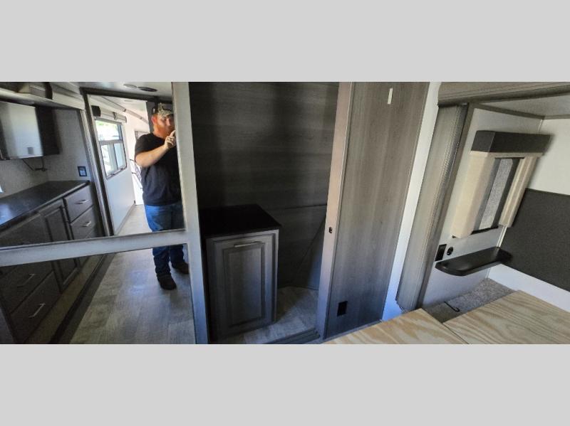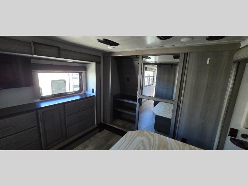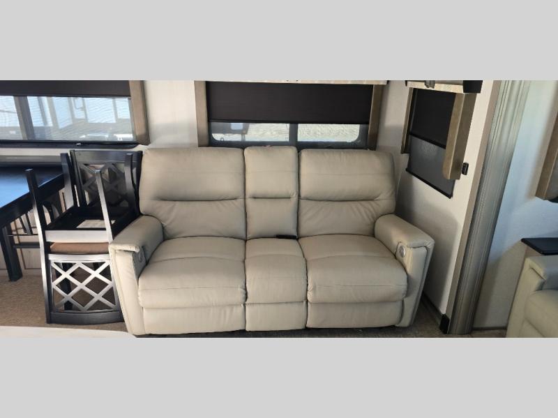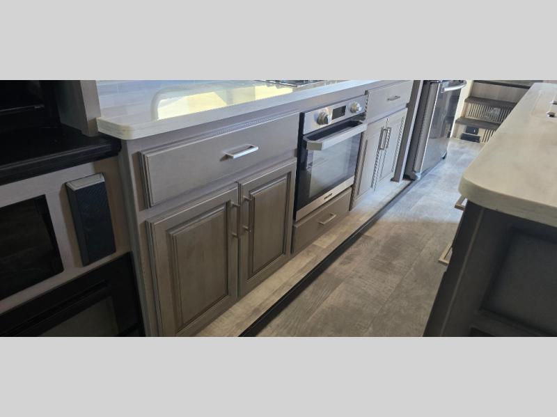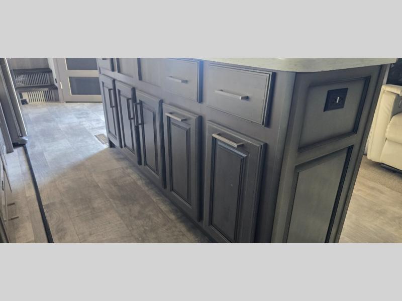 The chef is going to love the kitchen layout with a center island, dual slides in this area offering lots of prep space, a convection microwave, an 18 cu. ft. residential refrigerator, and a large pantry. You will find a handy entry closet nearby that you can add a washer/dryer option if you like to keep everything clean while away from home. The rear living area offers a hide-a-bed sofa giving you more sleeping space for guests, and the theatre seats with power recliners might be your favorite spot. If you aren't outside under one of the two awnings, you can work or dine at the free standing dinette. The master bedroom offers a slide out queen bed or choose a king bed option, a barn door for style, and a large closet, plus more storage. And the full bathroom gives you two sinks to get ready quicker for what ever is next.
