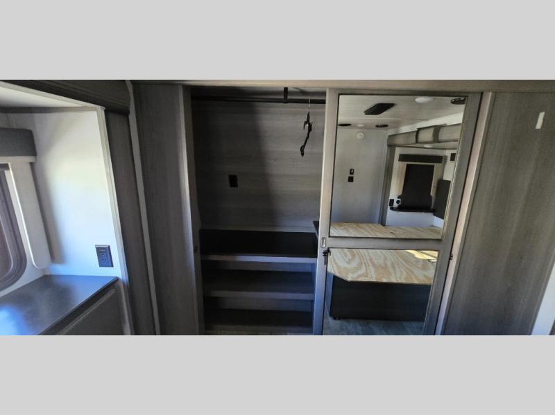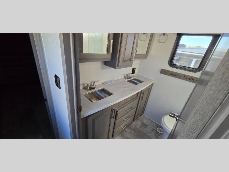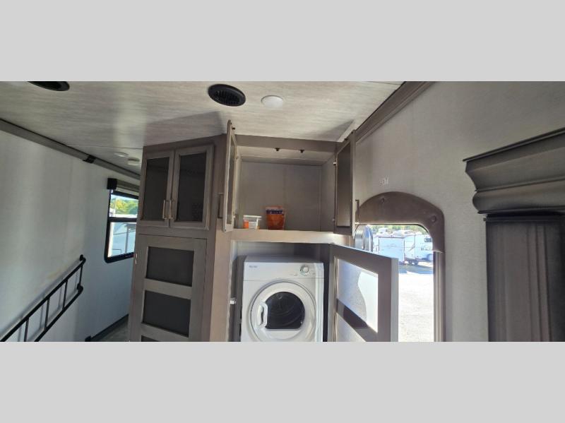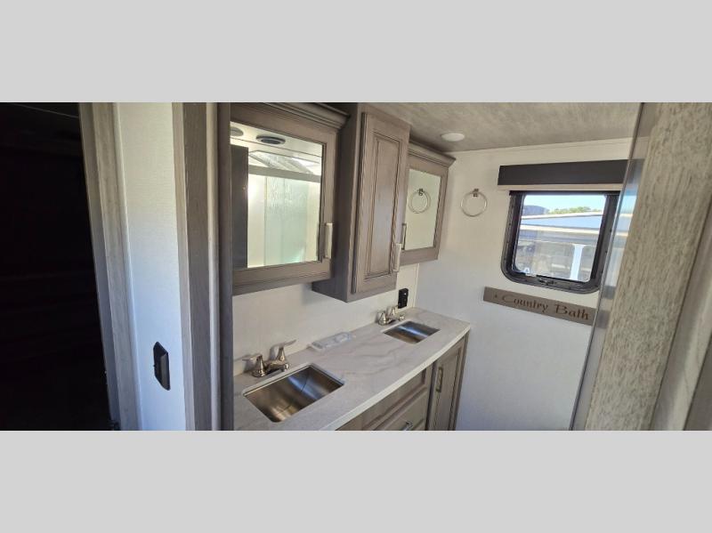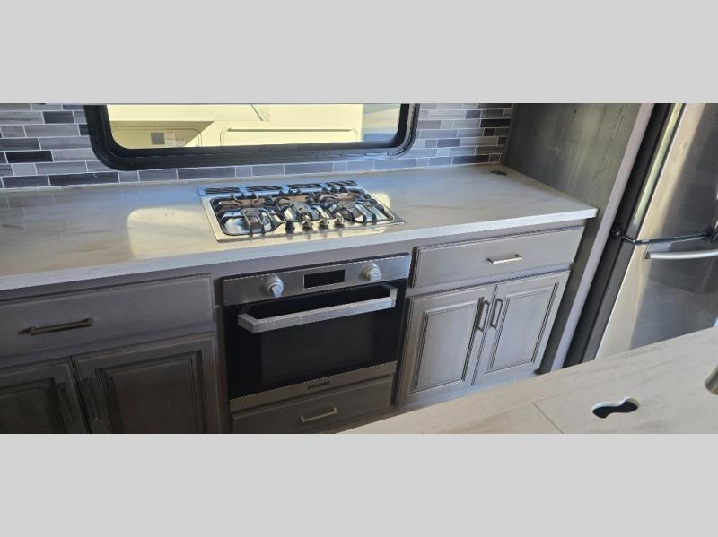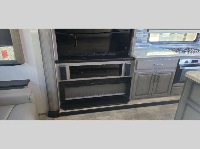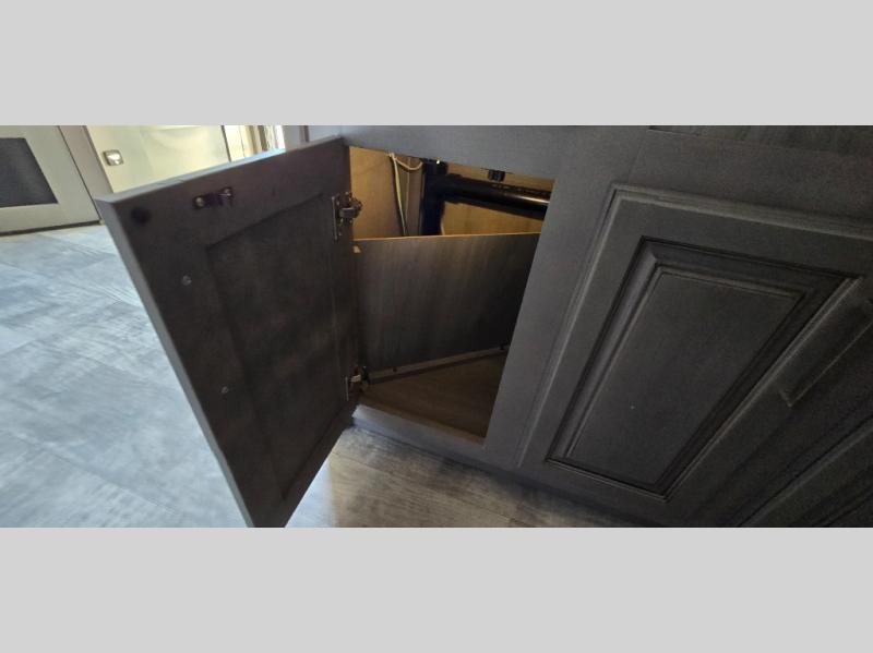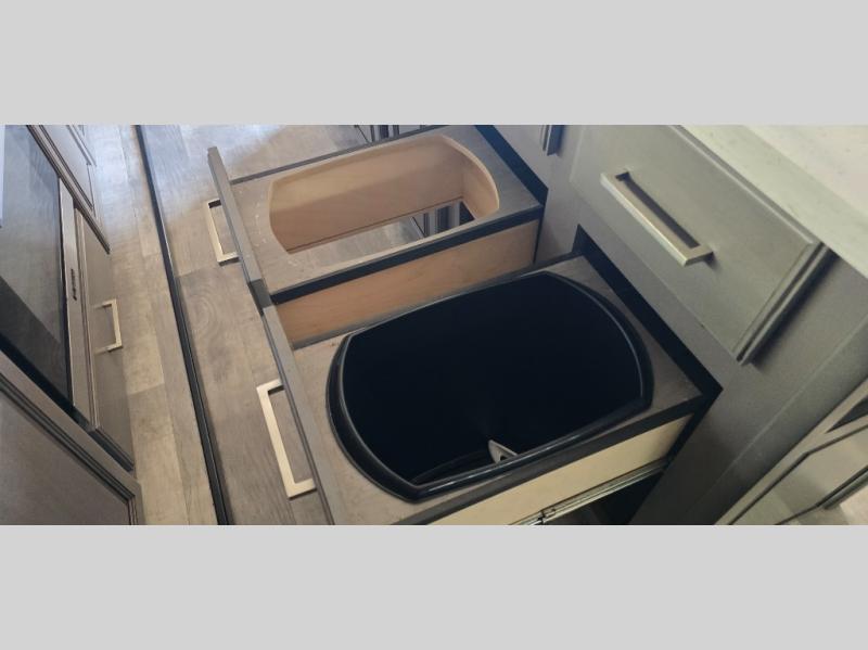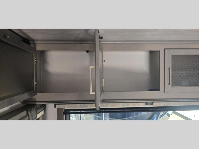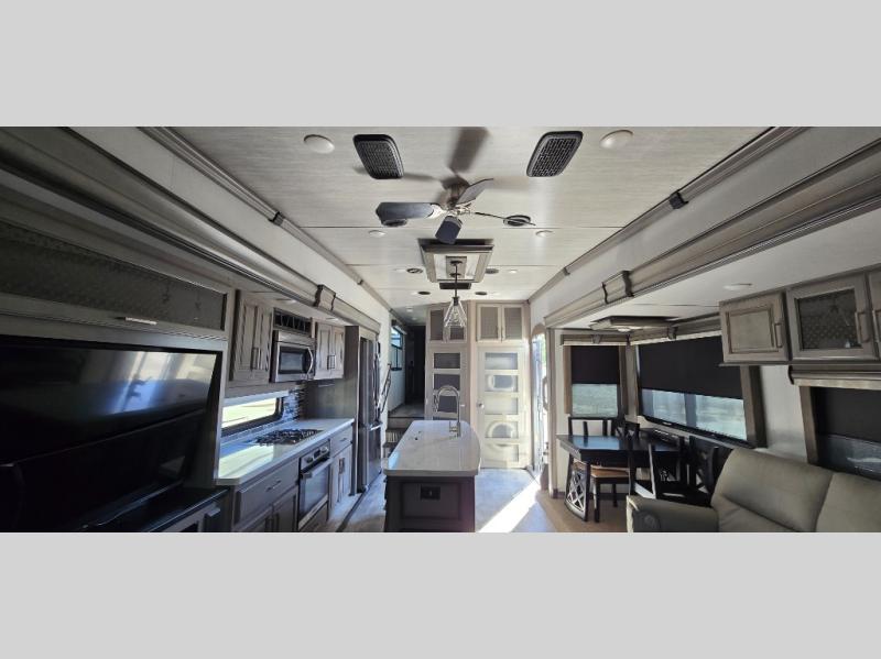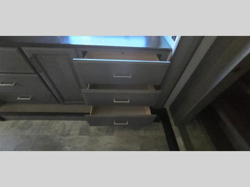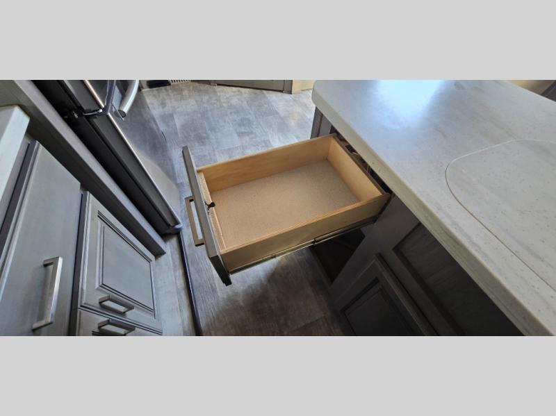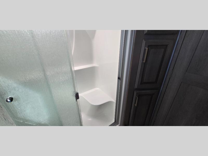 The chef is going to love the kitchen layout with a center island, dual slides in this area offering lots of prep space, a convection microwave, an 18 cu. ft. residential refrigerator, and a large pantry. You will find a handy entry closet nearby that you can add a washer/dryer option if you like to keep everything clean while away from home. The rear living area offers a hide-a-bed sofa giving you more sleeping space for guests, and the theatre seats with power recliners might be your favorite spot. If you aren't outside under one of the two awnings, you can work or dine at the free standing dinette. The master bedroom offers a slide out queen bed or choose a king bed option, a barn door for style, and a large closet, plus more storage. And the full bathroom gives you two sinks to get ready quicker for what ever is next.