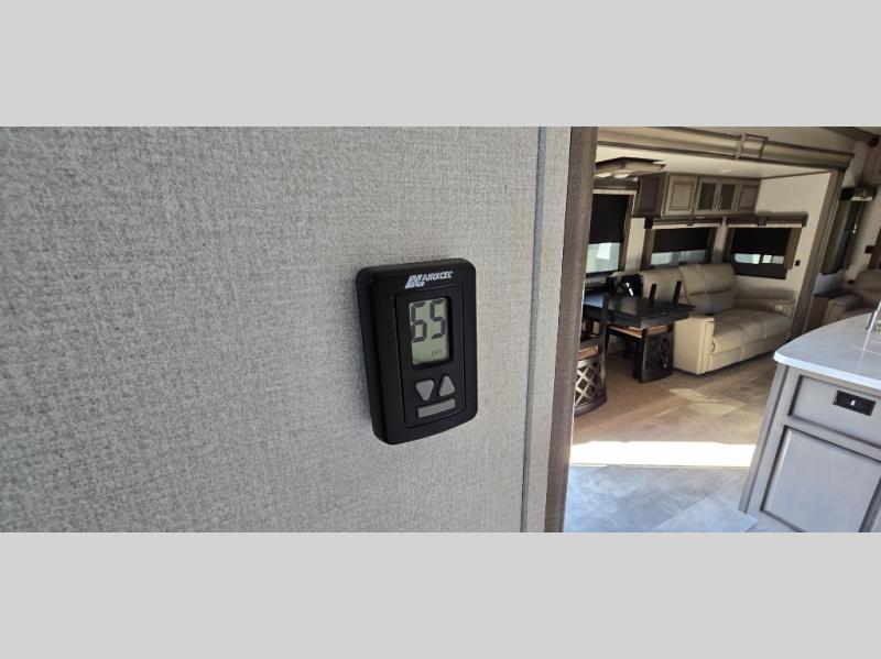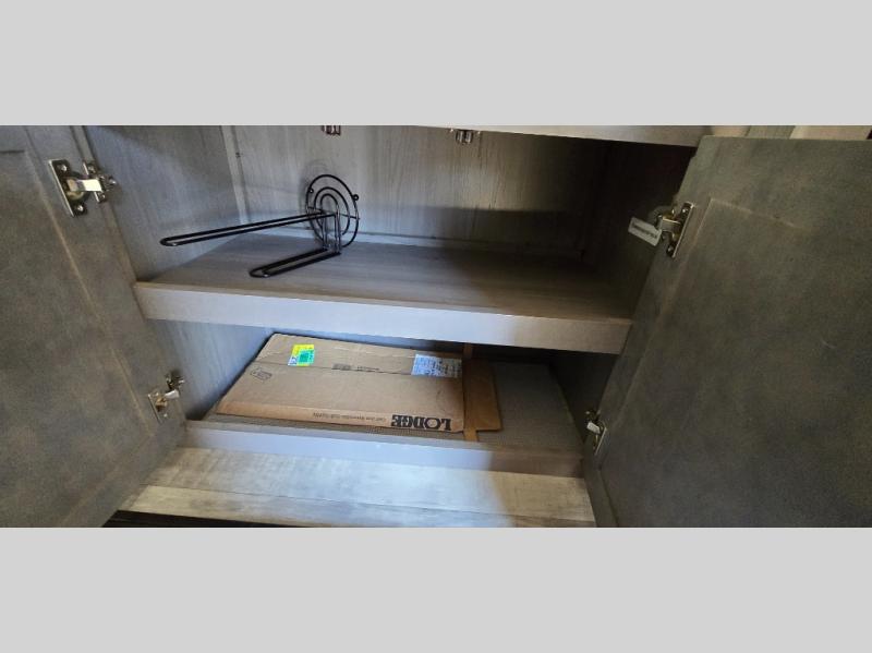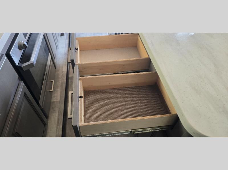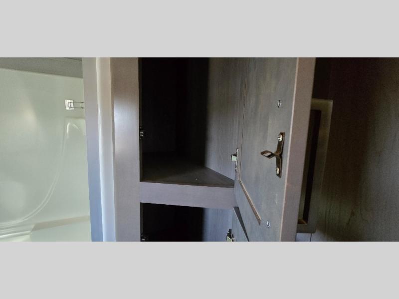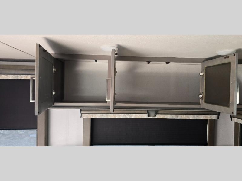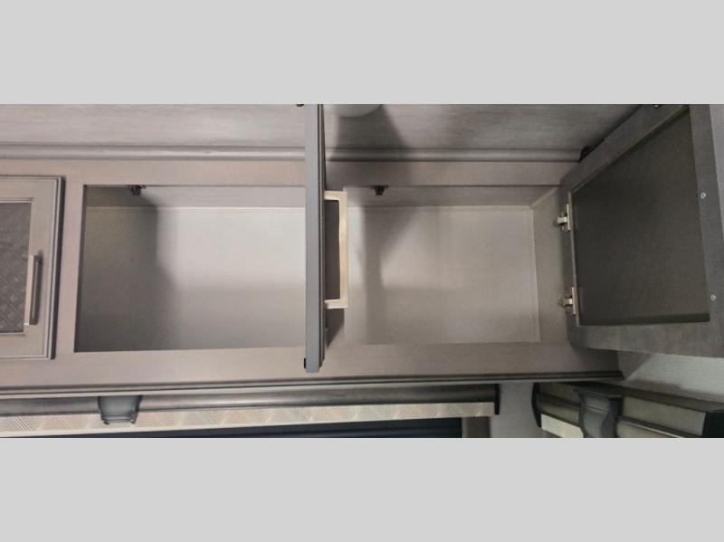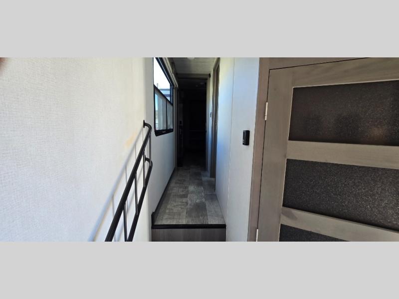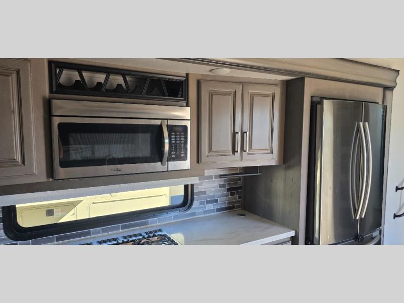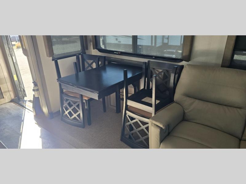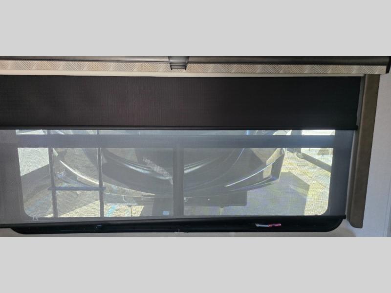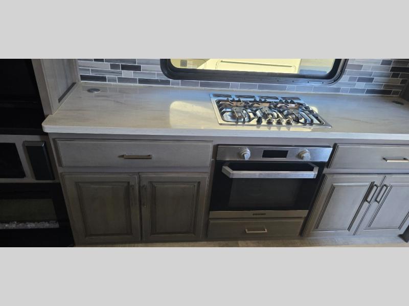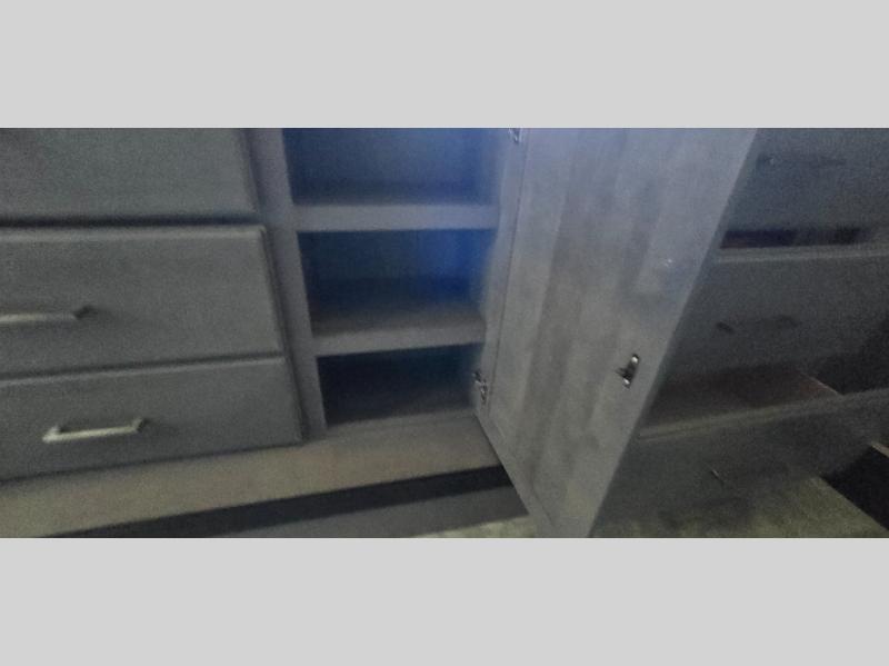 The chef is going to love the kitchen layout with a center island, dual slides in this area offering lots of prep space, a convection microwave, an 18 cu. ft. residential refrigerator, and a large pantry. You will find a handy entry closet nearby that you can add a washer/dryer option if you like to keep everything clean while away from home. The rear living area offers a hide-a-bed sofa giving you more sleeping space for guests, and the theatre seats with power recliners might be your favorite spot. If you aren't outside under one of the two awnings, you can work or dine at the free standing dinette. The master bedroom offers a slide out queen bed or choose a king bed option, a barn door for style, and a large closet, plus more storage. And the full bathroom gives you two sinks to get ready quicker for what ever is next.