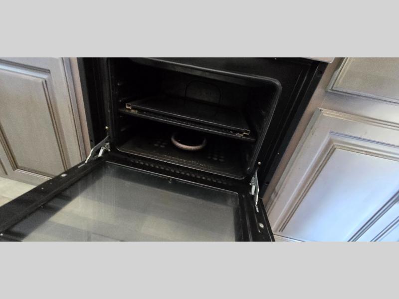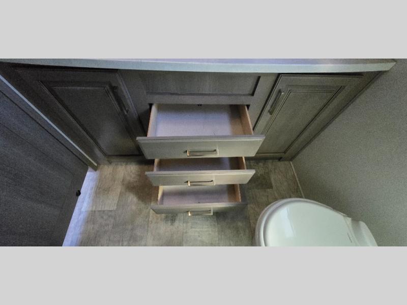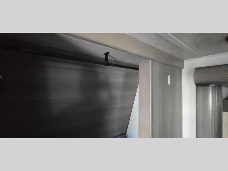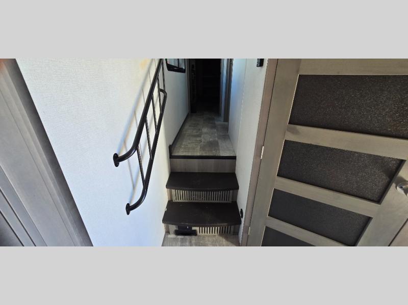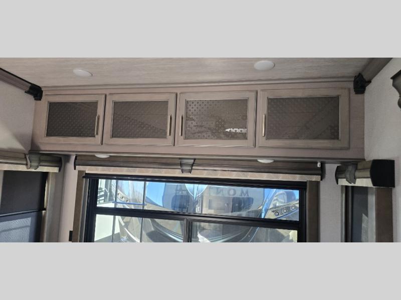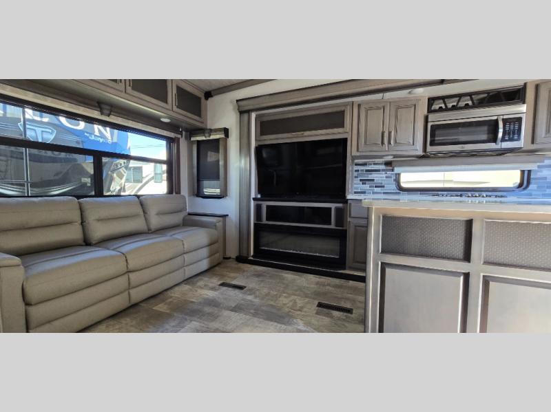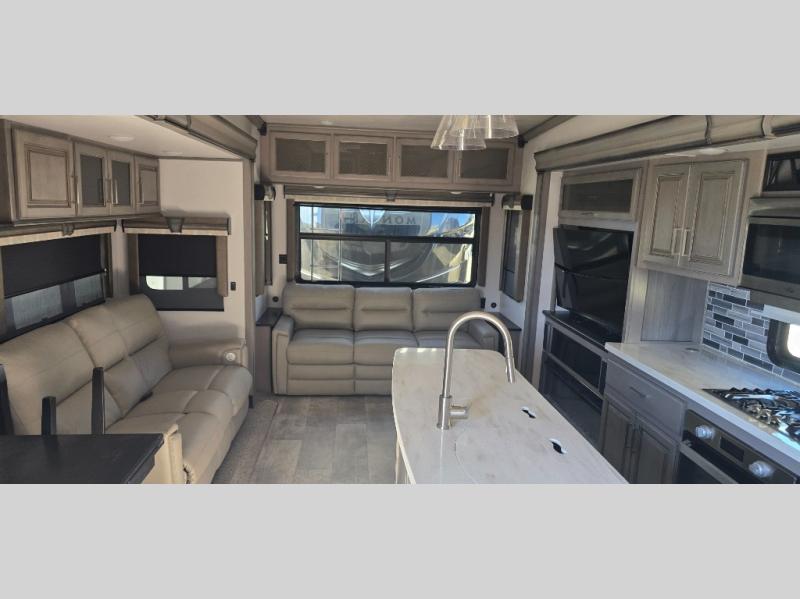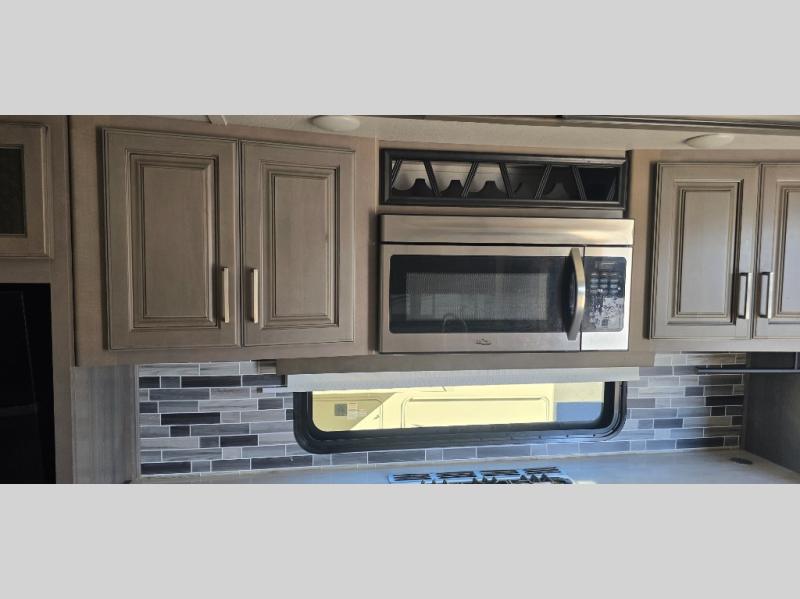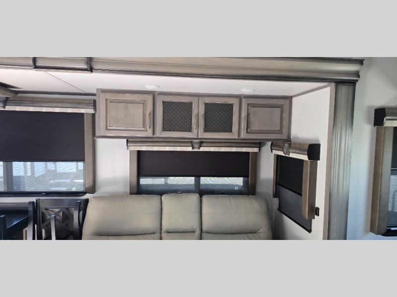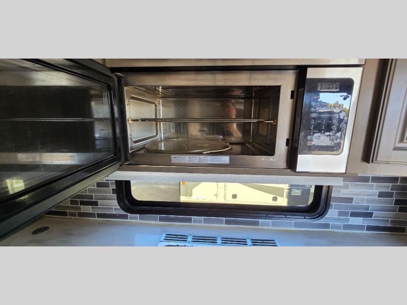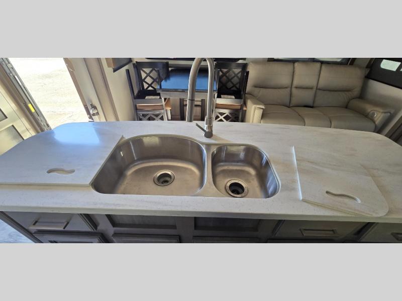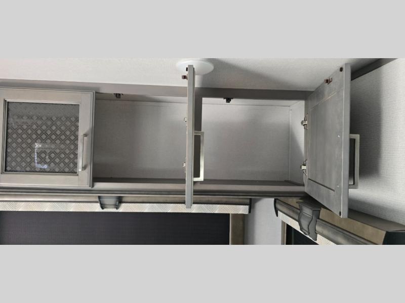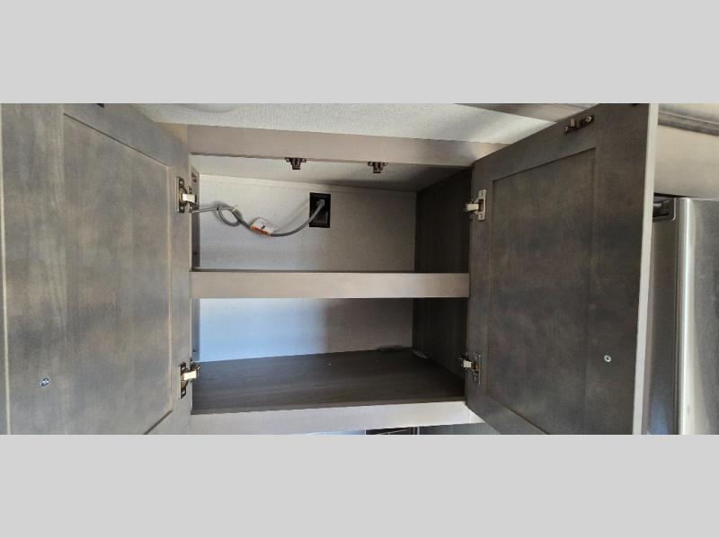 The chef is going to love the kitchen layout with a center island, dual slides in this area offering lots of prep space, a convection microwave, an 18 cu. ft. residential refrigerator, and a large pantry. You will find a handy entry closet nearby that you can add a washer/dryer option if you like to keep everything clean while away from home. The rear living area offers a hide-a-bed sofa giving you more sleeping space for guests, and the theatre seats with power recliners might be your favorite spot. If you aren't outside under one of the two awnings, you can work or dine at the free standing dinette. The master bedroom offers a slide out queen bed or choose a king bed option, a barn door for style, and a large closet, plus more storage. And the full bathroom gives you two sinks to get ready quicker for what ever is next.