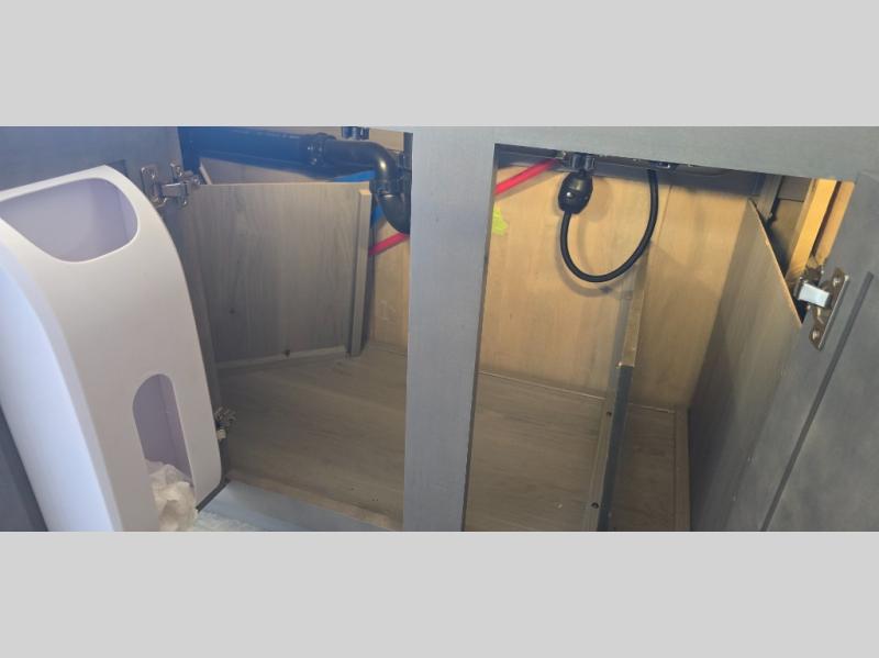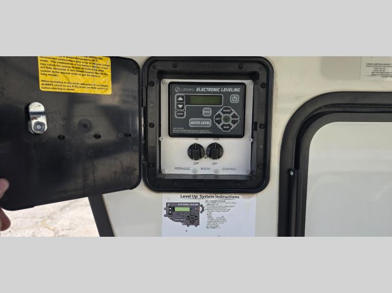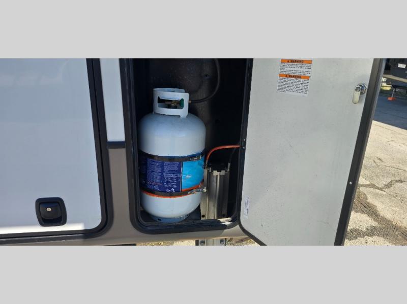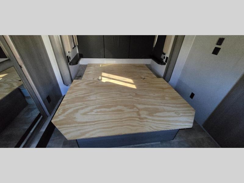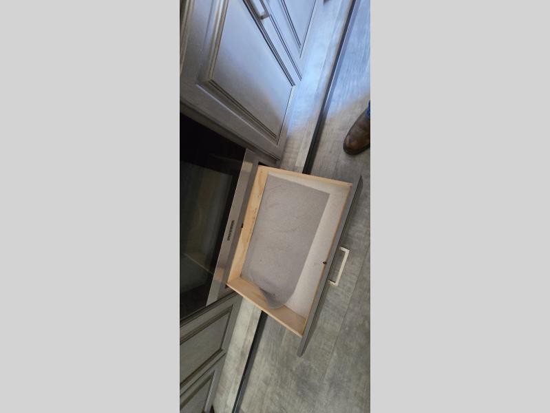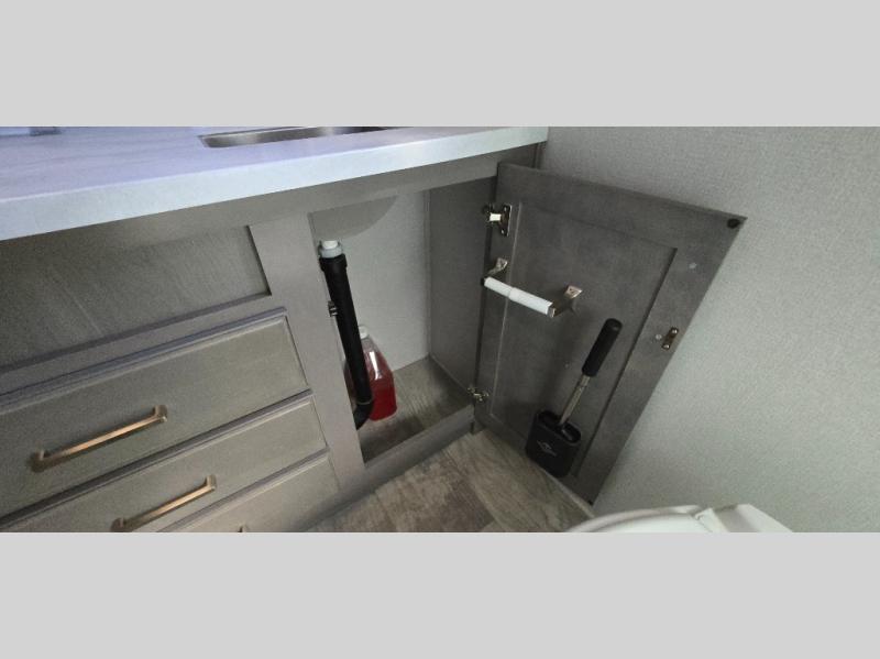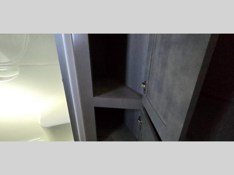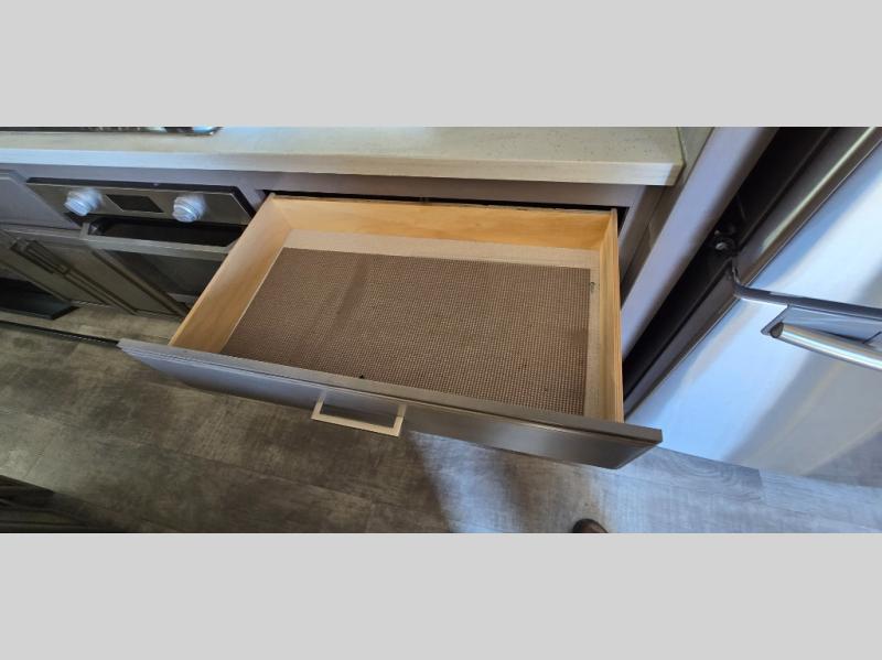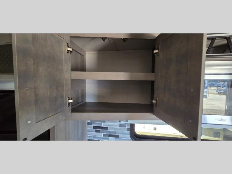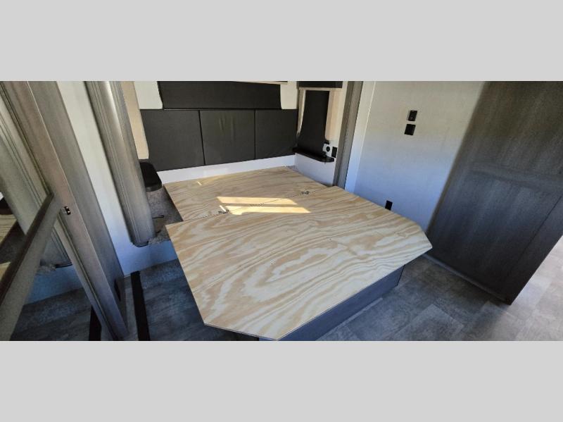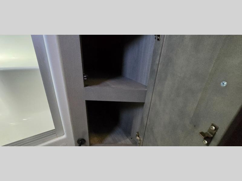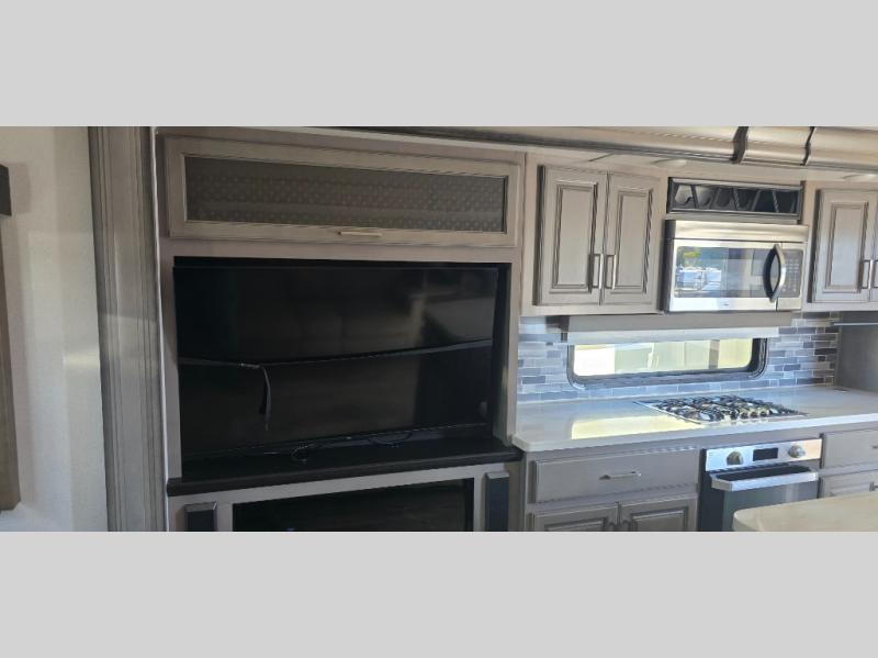 The chef is going to love the kitchen layout with a center island, dual slides in this area offering lots of prep space, a convection microwave, an 18 cu. ft. residential refrigerator, and a large pantry. You will find a handy entry closet nearby that you can add a washer/dryer option if you like to keep everything clean while away from home. The rear living area offers a hide-a-bed sofa giving you more sleeping space for guests, and the theatre seats with power recliners might be your favorite spot. If you aren't outside under one of the two awnings, you can work or dine at the free standing dinette. The master bedroom offers a slide out queen bed or choose a king bed option, a barn door for style, and a large closet, plus more storage. And the full bathroom gives you two sinks to get ready quicker for what ever is next.
