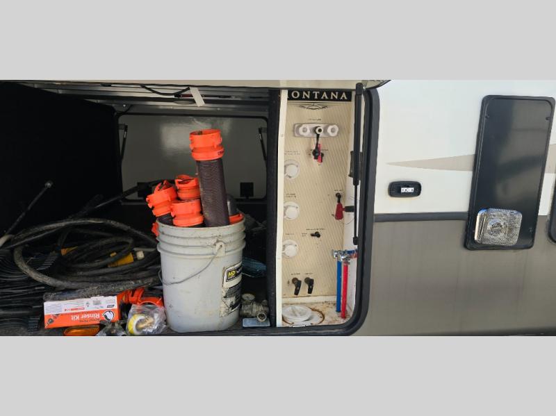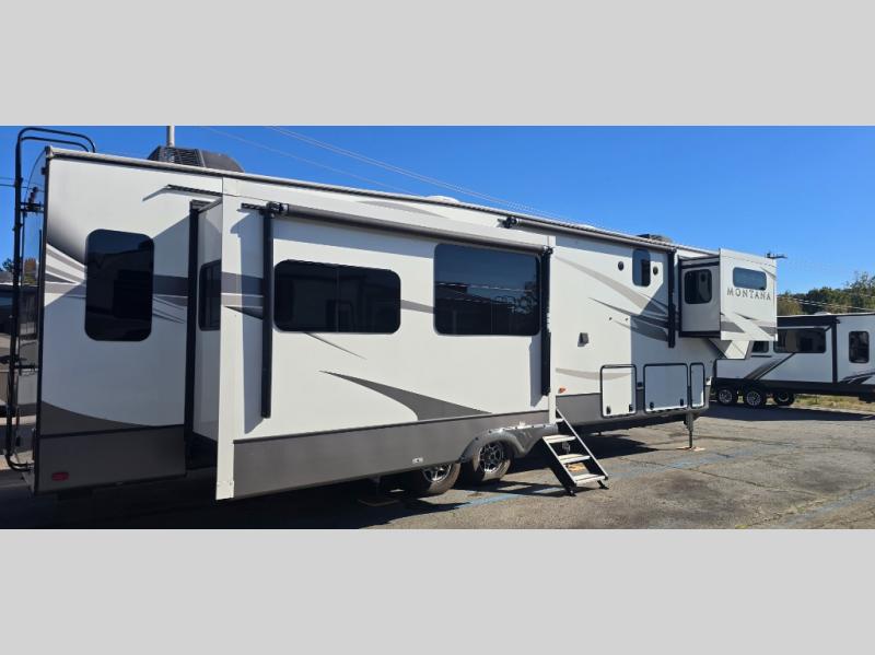 When packing for your next trip in a Keystone Montana luxury fifth wheel you will appreciate the enormous drop frame pass-through storage compartment, the full extension drawer guides, the MORyde "Step Above" entry steps with strut assist, and the LED motion sensor light at the inside steps. The Residential Living package adds more upgraded features such as the motion sensor LED light in the bedroom closet, the easy sweep vinyl flooring, the exclusive KeyTV satellite prep, and the in-floor straight line heat duct system. The Four Season Living package provides insulated in-floor water lines, two attic vents for cross-ventilation, insulated and heated holding tanks and dump valves, and more so you can travel any season you like. It's time to find the luxury fifth wheel you can enjoy for years to come, choose a Montana by Keystone today!