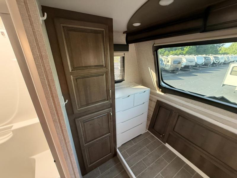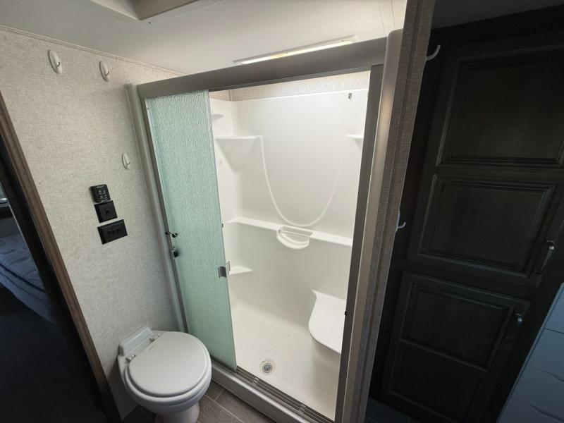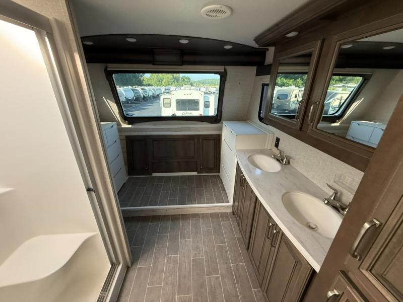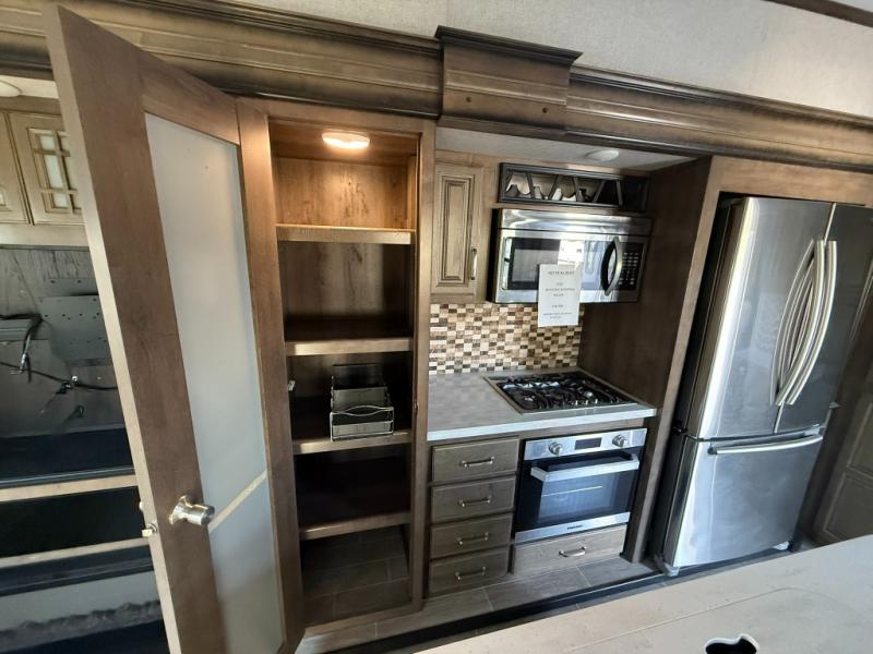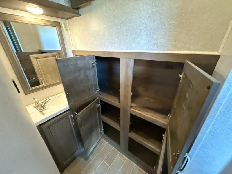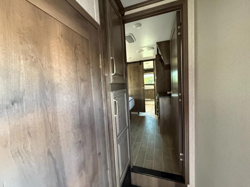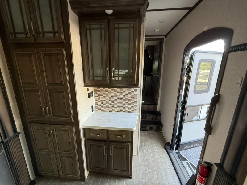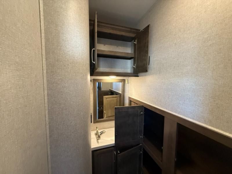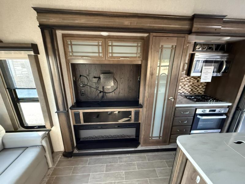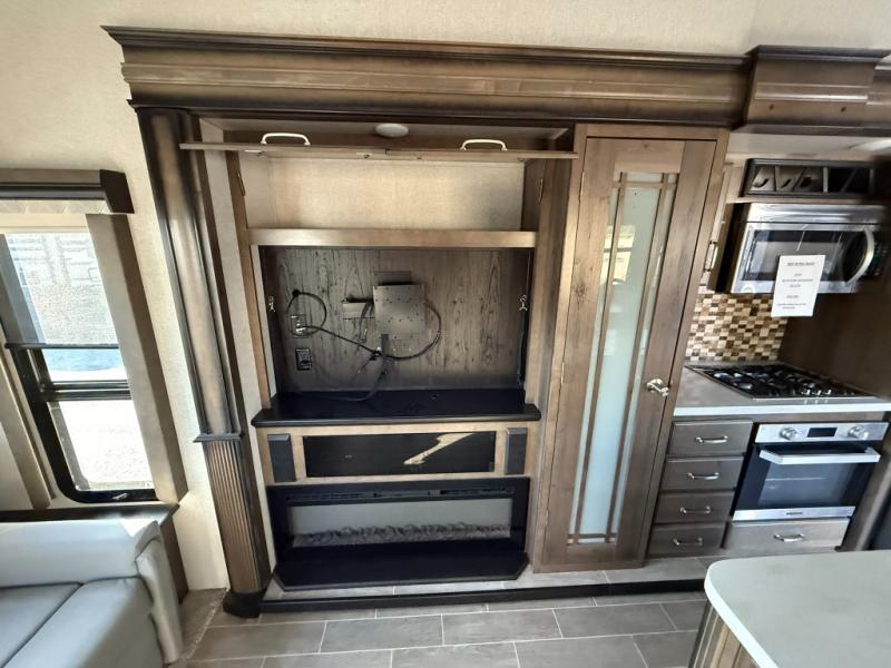 Imagine a master suite featuring a walk-through bedroom to the front full bathroom with a unique soaking bath tub, dual sinks, and a shower with a seat. You will also find a handy half bath for your guests across from the main entry. The combined rear living and kitchen area allows you to make meals, visit with family, and relax while watching the 50" HDTV all while being comfortable on the furniture with the warmth of the fireplace. The cook will enjoy using the kitchen island, storing cold food and drinks in the 18 cu. ft. residential refrigerator, heating up leftovers in the convection microwave, and making a cup of Joe at the coffee station. You might even decide to add a washer and dryer option to the kitchen closet that is prepped and ready for the full-timer life or weekend warrior that enjoys clean linens and clothes.