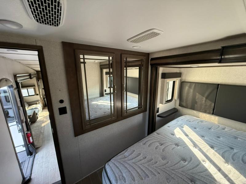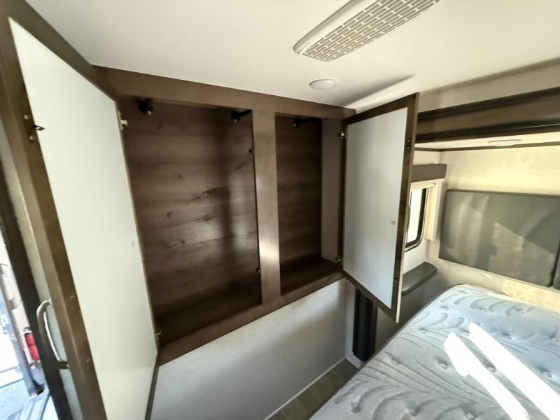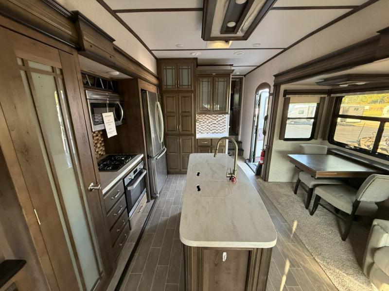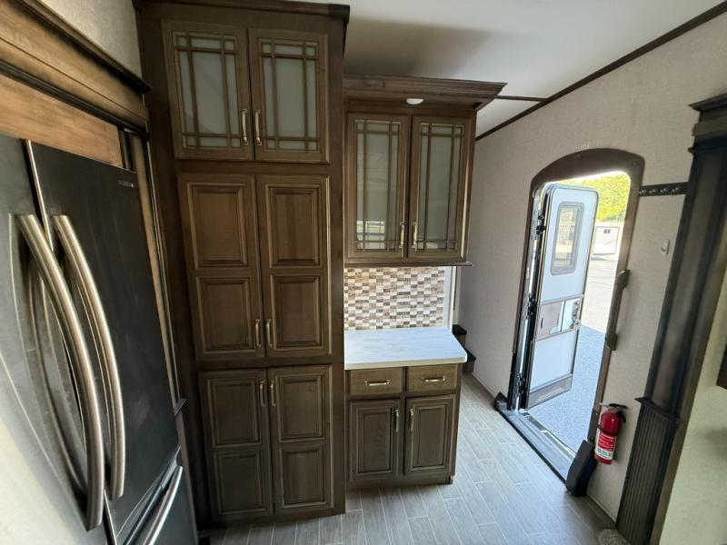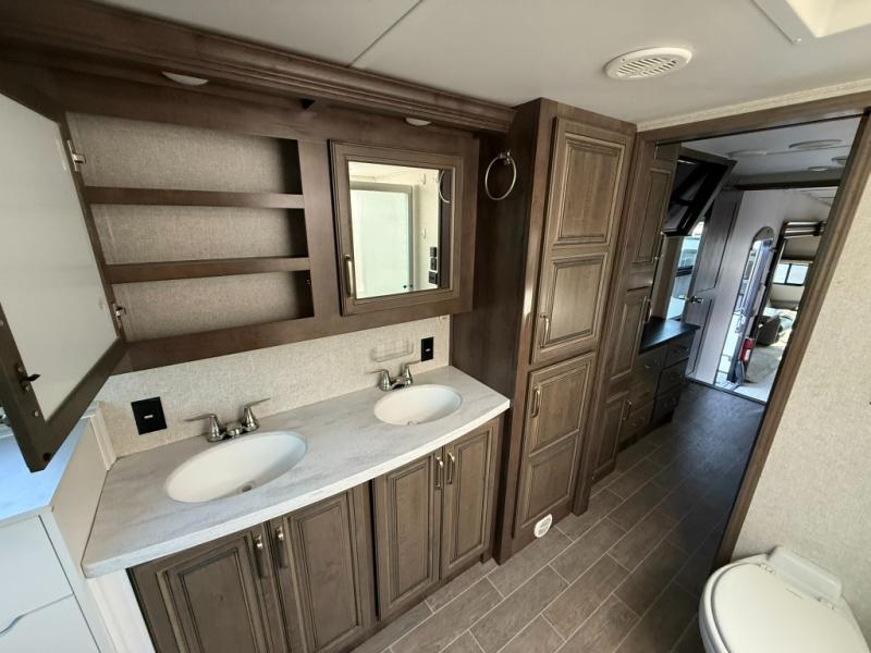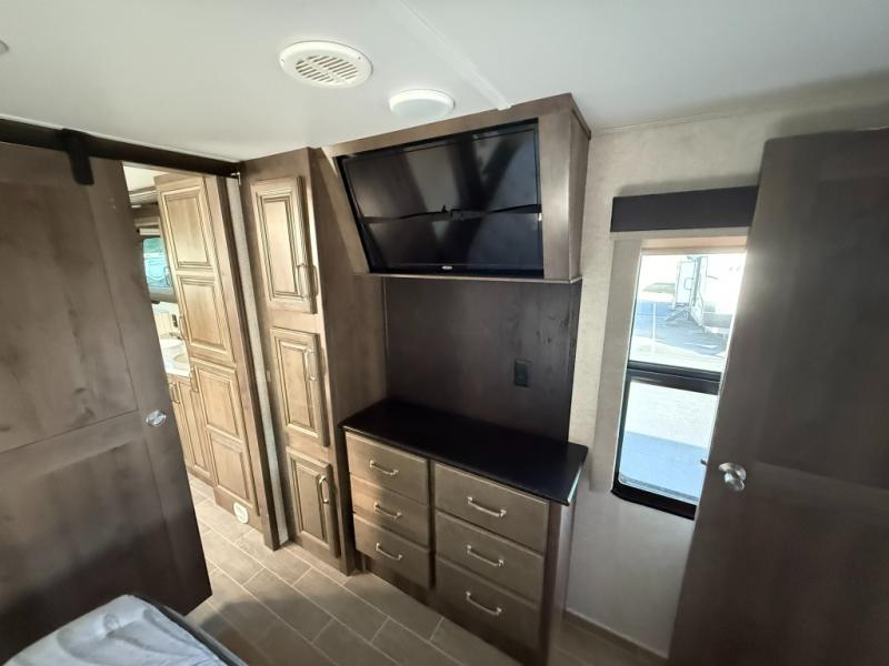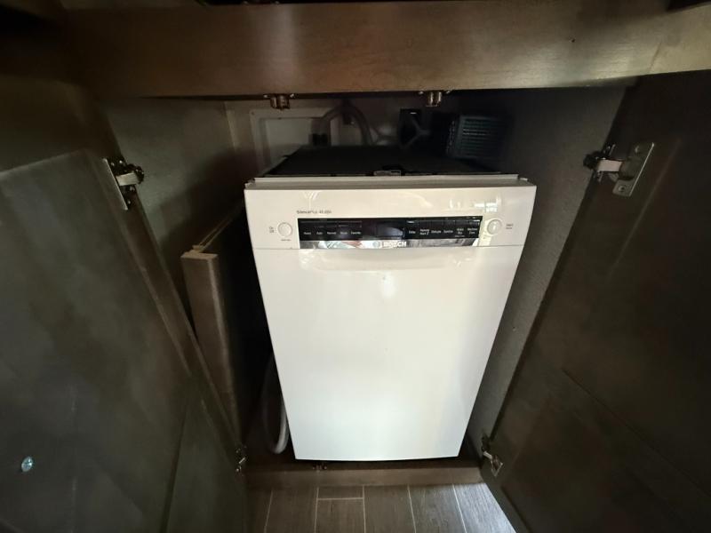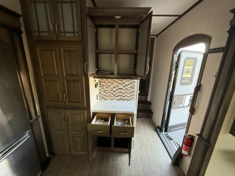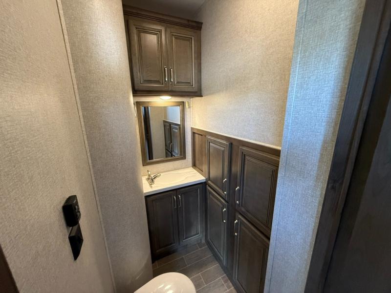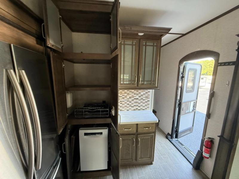 Imagine a master suite featuring a walk-through bedroom to the front full bathroom with a unique soaking bath tub, dual sinks, and a shower with a seat. You will also find a handy half bath for your guests across from the main entry. The combined rear living and kitchen area allows you to make meals, visit with family, and relax while watching the 50" HDTV all while being comfortable on the furniture with the warmth of the fireplace. The cook will enjoy using the kitchen island, storing cold food and drinks in the 18 cu. ft. residential refrigerator, heating up leftovers in the convection microwave, and making a cup of Joe at the coffee station. You might even decide to add a washer and dryer option to the kitchen closet that is prepped and ready for the full-timer life or weekend warrior that enjoys clean linens and clothes.
