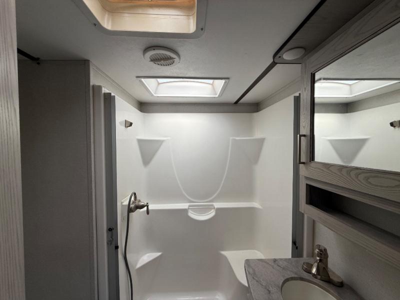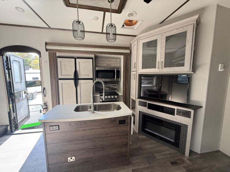 When heading out and setting up in a Keystone Montana High Country fifth wheel you will appreciate the Dexter E-Z Lube axles, Max Turn front cap and radius frame with Hitch Vision, and an enormous drop frame pass-through storage compartment to name a few features. Inside you will find luxury and comfort with the 78" tall main slide outs and flush mounted LED interior lights. The bath features a skylight over the shower, seamless countertops, and a vanity with three drawers for extra storage space!. The chef of the family is going to love the Montana High Country's kitchen with its Furrion 21" two in one stainless steel cooktop and oven, a 30" over-the-range microwave, solid surface countertops, and a high-rise faucet with an integrated pull-out sprayer, plus so much more!