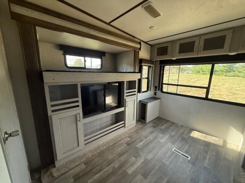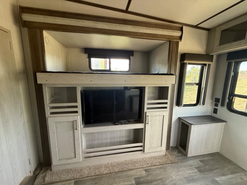 You and your family including your friends will enjoy all the space inside this FIVE slide out Montana High Country. This fifth wheel offers a second living area with seating and two bunk beds, an HD TV, and access to the half bath. The cook will enjoy the kitchen island with counter extension for extra prep space, a hutch for displaying decor, and a 12 cu. ft. RV refrigerator for plenty of storage for ingredients and food. The main living area combined with the kitchen offers power theater seats, an HD LED TV above an LED fireplace, and all the appliances needed to make meals. Mom and dad will love to retreat each night to the front master suite with a slide out queen bed and a large wardrobe. Outside you can make meals on the outdoor kitchen with a two burner cooktop, microwave, and a refrigerator. You will also find a water station, awning, and a 2" receiver hitch on the rear, plus more!