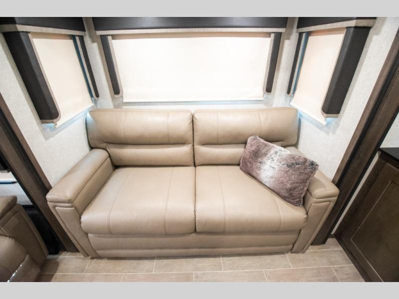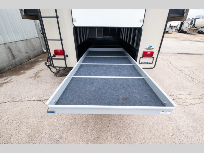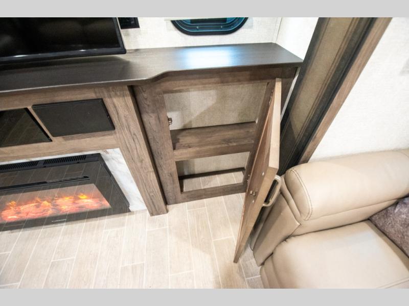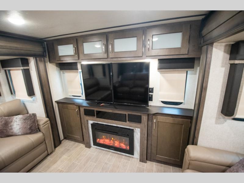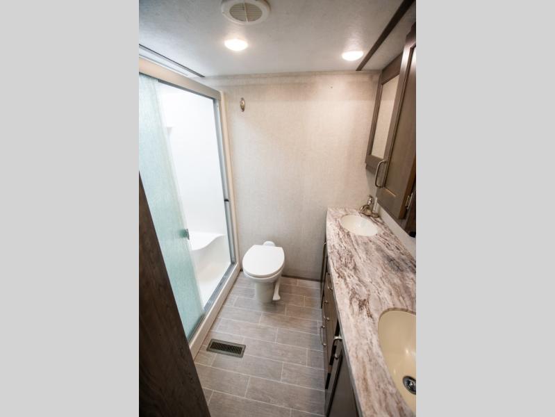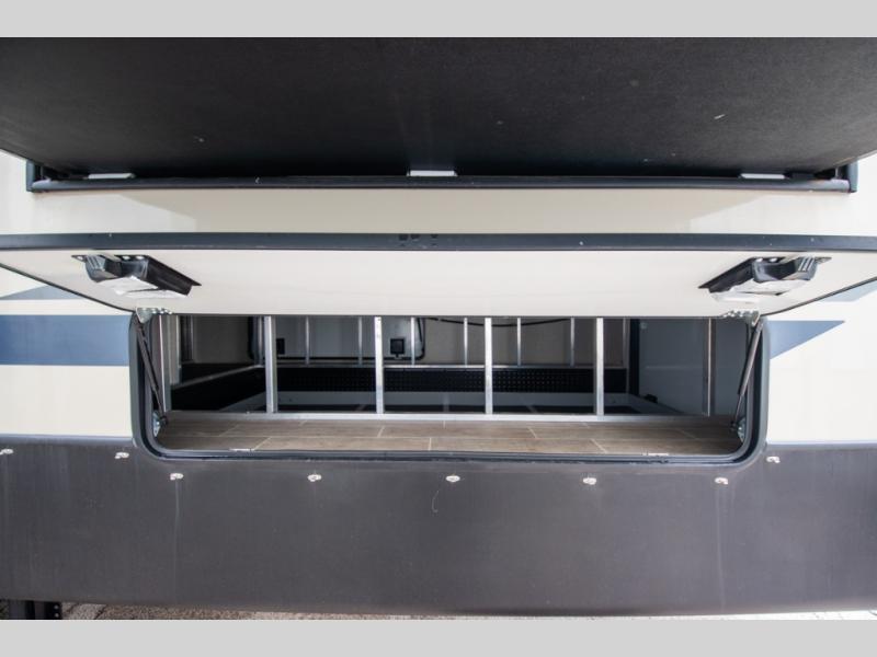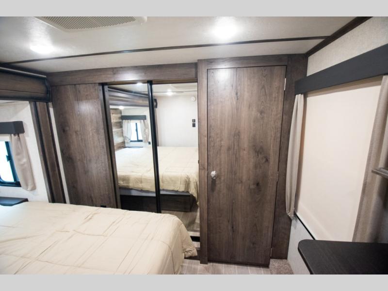 Super popular layout featuring raised rear den with dual tri fold sofas along with reclining theatre seating. Tires are dated 2025 and the exterior includes a skirt package that attaches to the lower portion of the RV. Great shape and plenty of space. King bed with abundant wardrobe space and washer / dryer prep all in the bedroom. The bathroom boasts dual vanity countertop and one piece fiberglass shower module with sliding glass doors. See it today in Rockford.