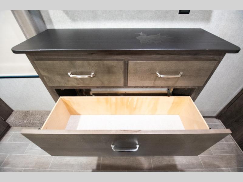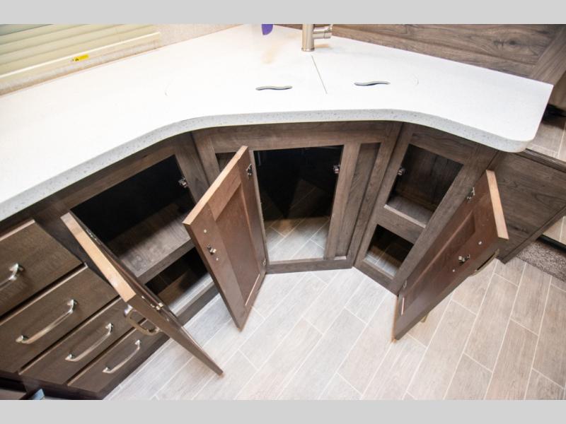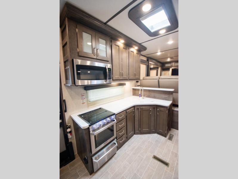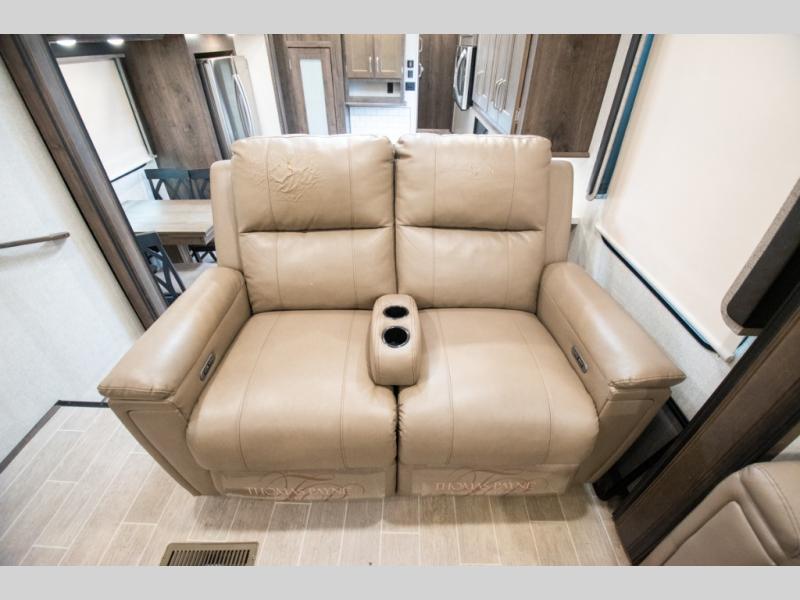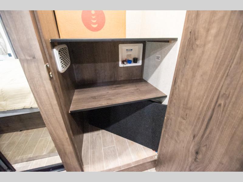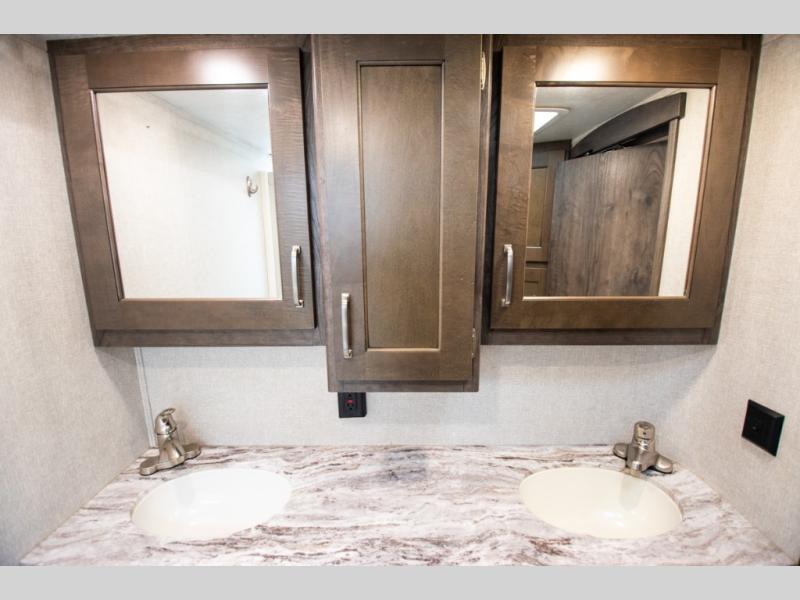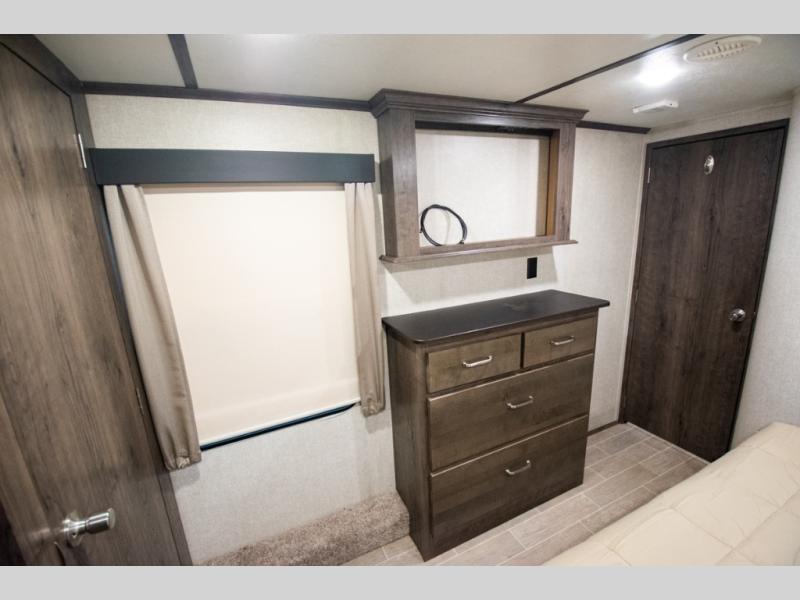 Super popular layout featuring raised rear den with dual tri fold sofas along with reclining theatre seating. Tires are dated 2025 and the exterior includes a skirt package that attaches to the lower portion of the RV. Great shape and plenty of space. King bed with abundant wardrobe space and washer / dryer prep all in the bedroom. The bathroom boasts dual vanity countertop and one piece fiberglass shower module with sliding glass doors. See it today in Rockford.