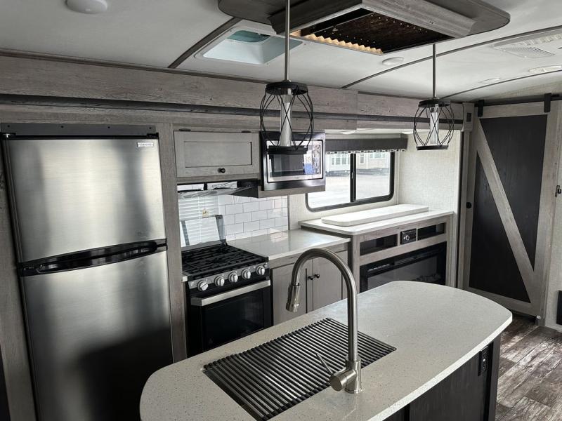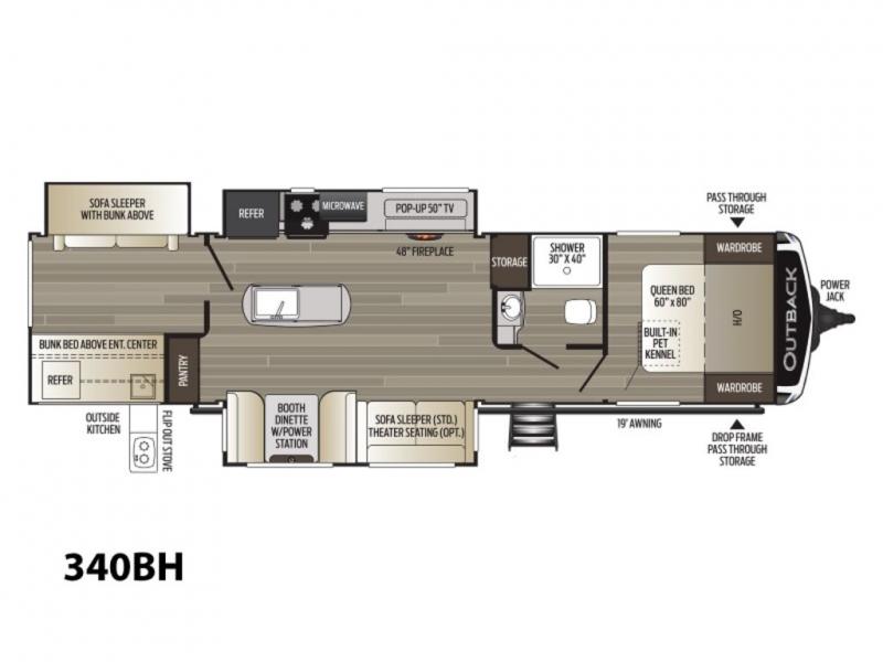 Let this Outback travel trailer be your family's new favorite vacation destination! Whether it is in the rear private bunkhouse or in the front private bedroom, you will find plenty of space to sleep nine people throughout this trailer, and because this unit comes with a built-in kennel, you will also have plenty of space for your pets to feel comfortable while you travel. With the three slides that have been included in this model, you will be able to rest easily in the central living area on the sofa sleeper or booth dinette while you charge your computer or cell phone at the power station.