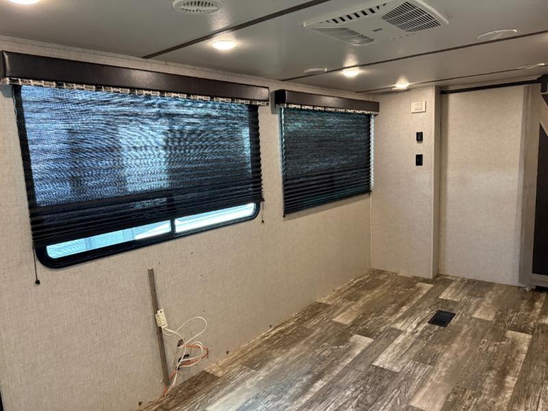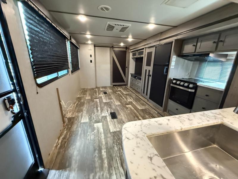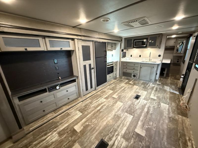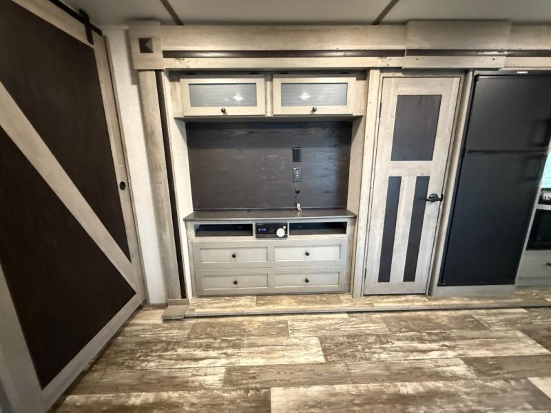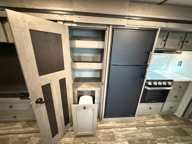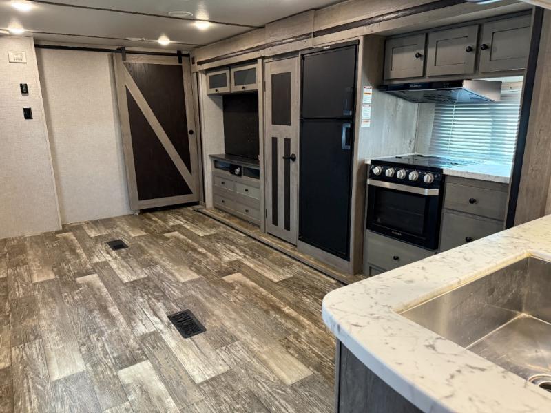 This Outback Ultra Lite travel trailer is perfect for couples who enjoy getting away to the great outdoors. You will be the envy of every campground because of all of the exceptional amenities that come included in this trailer, like the full rear bath with a sliding barn door, the built-in pet kennel underneath the queen-size bed in the private bedroom, and the pull-out trash can in the kitchen. You will also enjoy relaxing together each night on the sofa sleeper or choose the optional theater seating in its place, as you watch a show on the 50" TV.