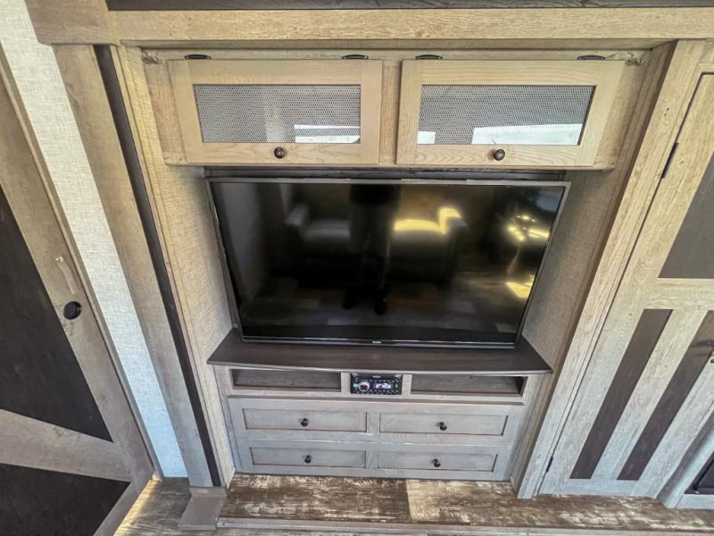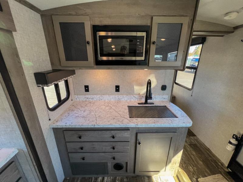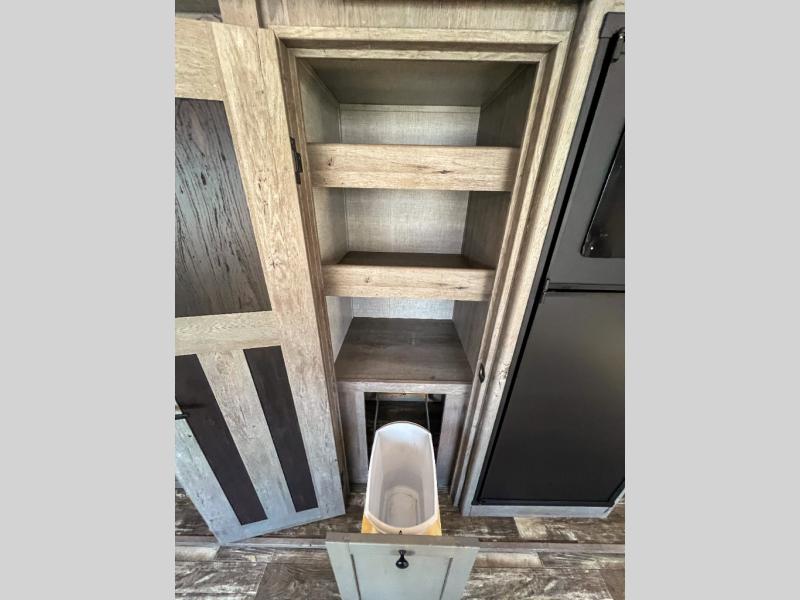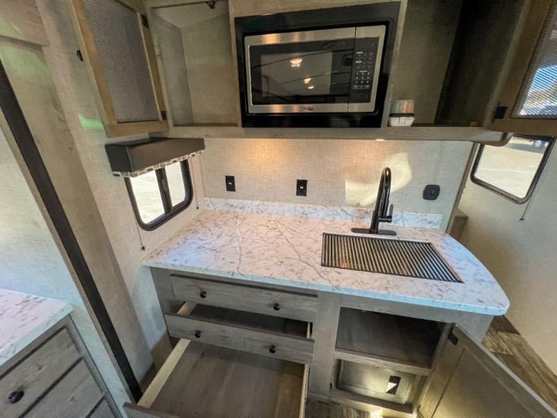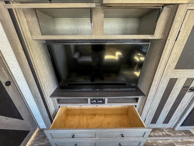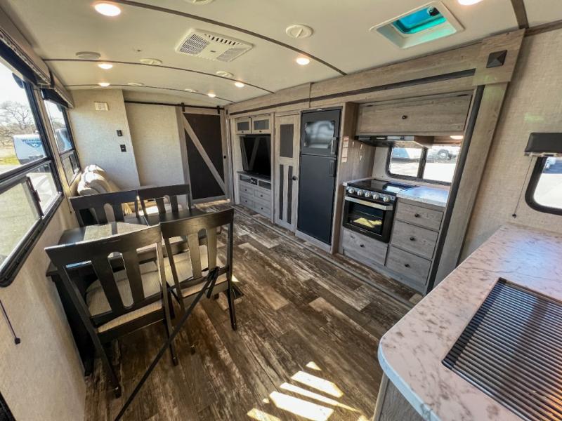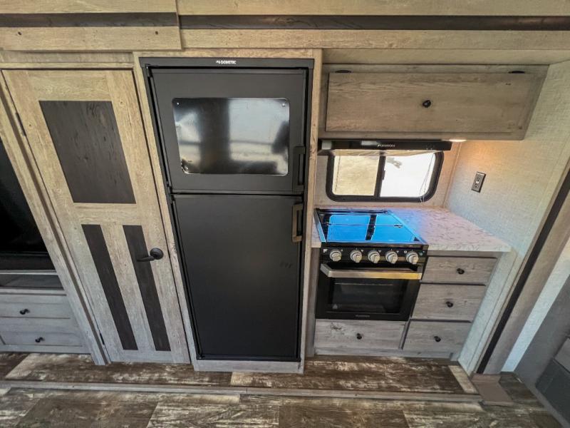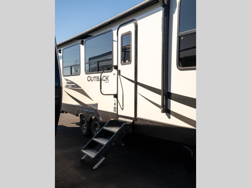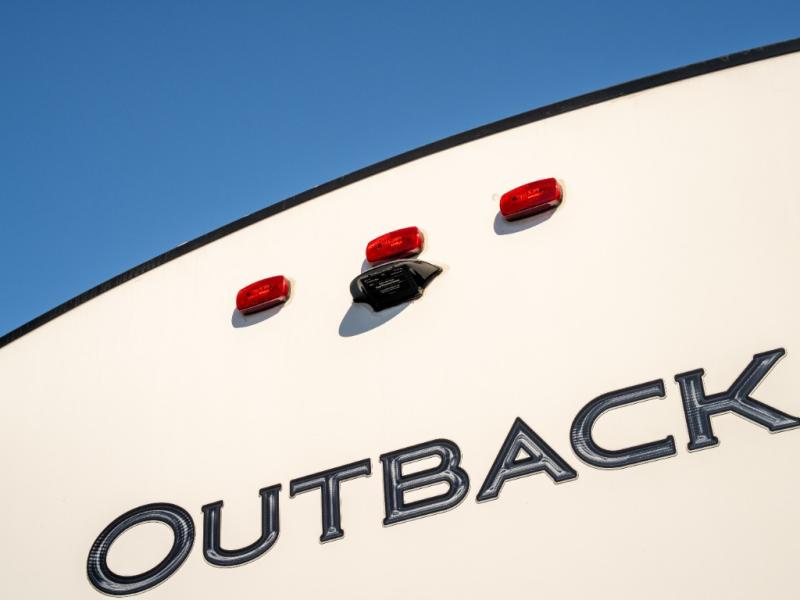 This Outback Ultra Lite travel trailer is perfect for couples who enjoy getting away to the great outdoors. You will be the envy of every campground because of all of the exceptional amenities that come included in this trailer, like the full rear bath with a sliding barn door, the built-in pet kennel underneath the queen-size bed in the private bedroom, and the pull-out trash can in the kitchen. You will also enjoy relaxing together each night on the sofa sleeper or choose the optional theater seating in its place, as you watch a show on the 50" TV.