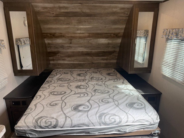 Imagine you and your spouse relaxing on the front sofa while visiting with other campers who are sitting at the booth dinette in this Passport travel trailer. Now imagine that you all are hiking the trails, walking your dogs around the campground, or even relaxing by the lake. This Passport provides comfortable seating and sleeping arrangements, as well as USB charging ports. The front portion of this trailer offers a living area during the daytime and a sleeping area at night once the Murphy bed has been folded down which means that there will be no more looking at your unmade bed during the day. The full bathroom allows you to skip the public facilities, the three-burner range allows you to make meals, and the outside kitchen provides an added convenience.