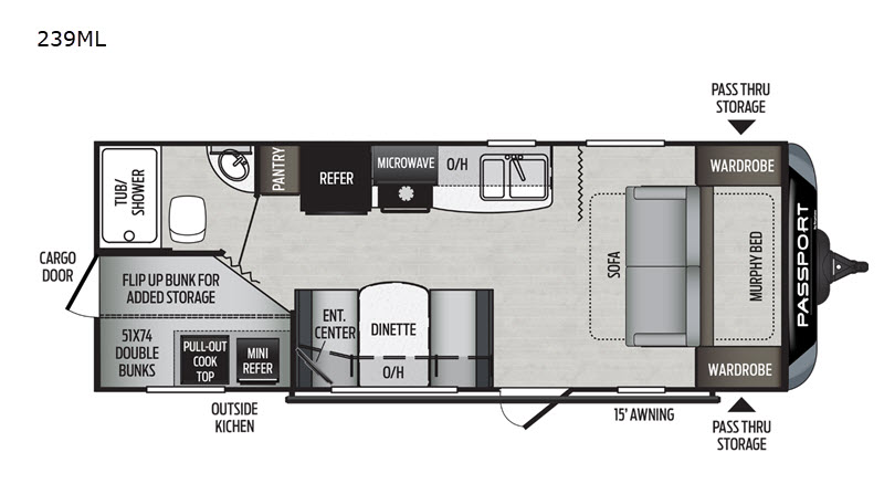 Have you been envisioning your family sitting around the campfire after riding bikes all day, or daydreaming about visiting all the state parks with the comforts of home hitched up to your tow vehicle? This Passport travel trailer just makes sense when you need sleeping space for six to seven, bathroom accommodations for everyone, and space to cook outside in the fresh air. From the Murphy bed and sofa up front to the rear set of double-size bunks, you will be able to enjoy this model for years. Don't forget about the outside kitchen and the exterior pass-through storage compartment. Family fun and loads of memories will happen when you travel with this Passport!