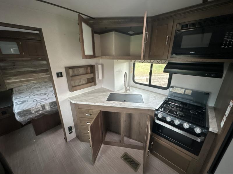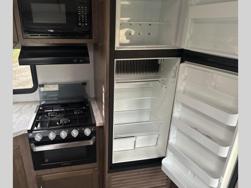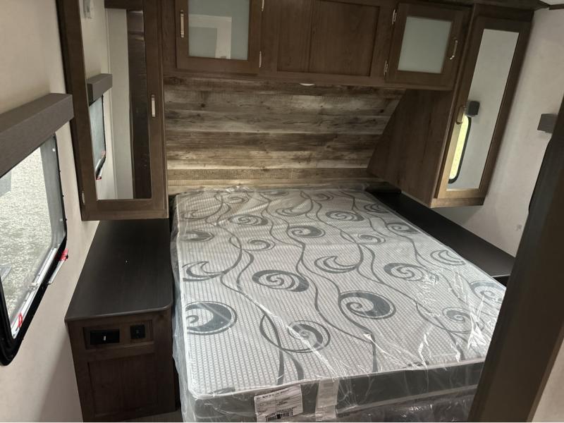 Daydreams can come true in this Passport travel trailer! As you enter this model, you can have a seat on the mud room bench, hang your jacket on the coat hooks, and then grab a drink from the refrigerator. After relaxing on the tri-fold sofa sleeper or U-shaped dinette, be sure to get cleaned up in the rear bathroom with a radius shower. When it's time for bed, the private front bedroom will be calling your name, and the kids or your overnight guests can fold down the furniture to use for their sleeping space. In the morning, you can choose to cook inside with full kitchen amenities, or you can go outside to use the outdoor kitchen.