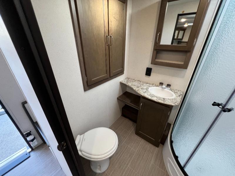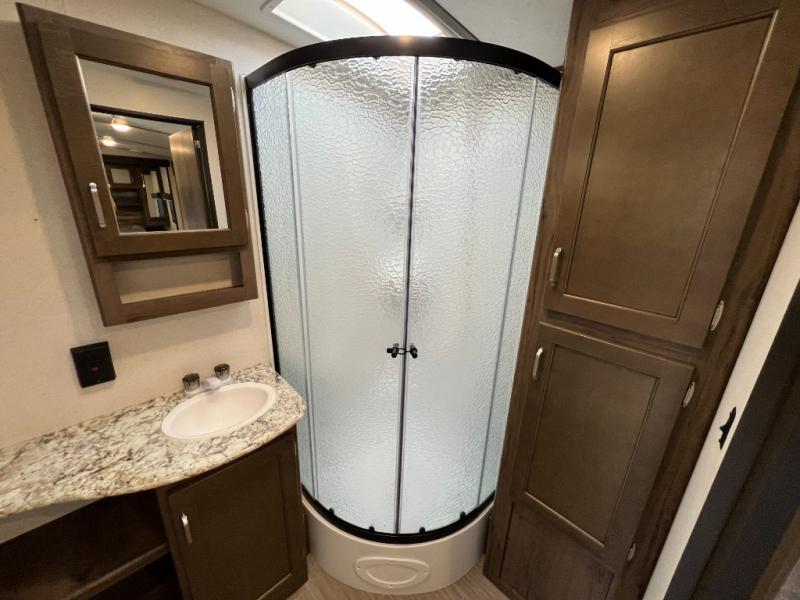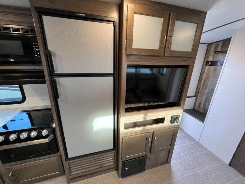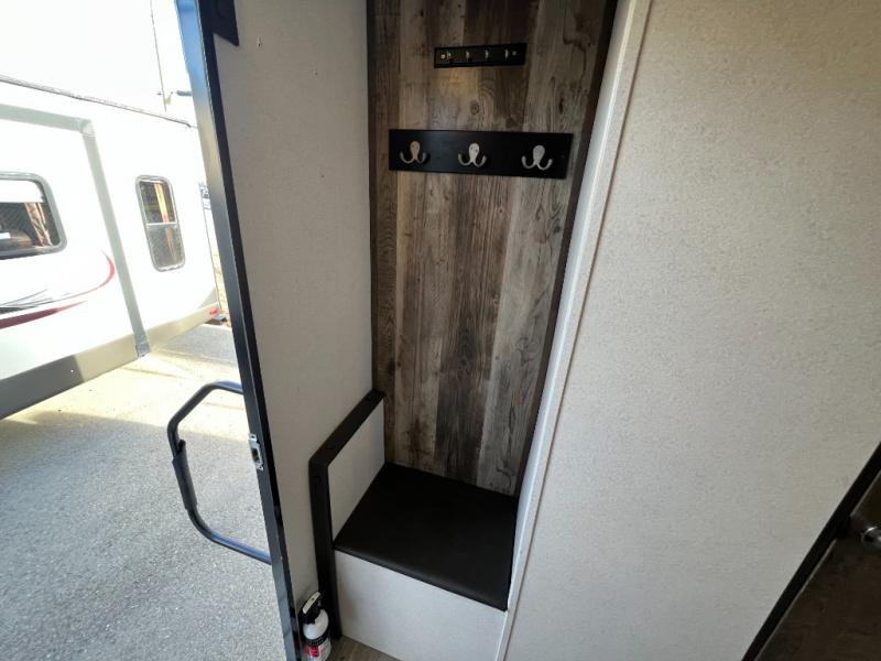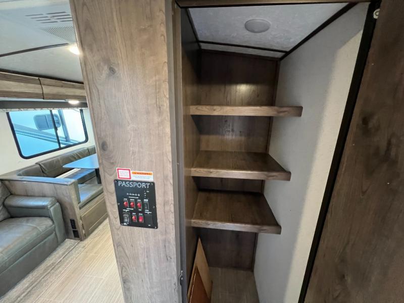 Daydreams can come true in this Passport travel trailer! As you enter this model, you can have a seat on the mud room bench, hang your jacket on the coat hooks, and then grab a drink from the refrigerator. After relaxing on the tri-fold sofa sleeper or U-shaped dinette, be sure to get cleaned up in the rear bathroom with a radius shower. When it's time for bed, the private front bedroom will be calling your name, and the kids or your overnight guests can fold down the furniture to use for their sleeping space. In the morning, you can choose to cook inside with full kitchen amenities, or you can go outside to use the outdoor kitchen.