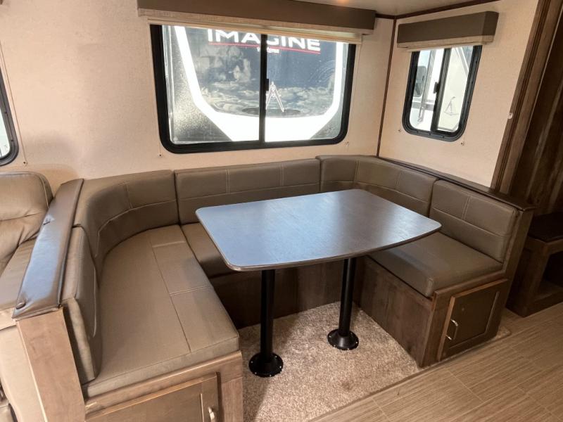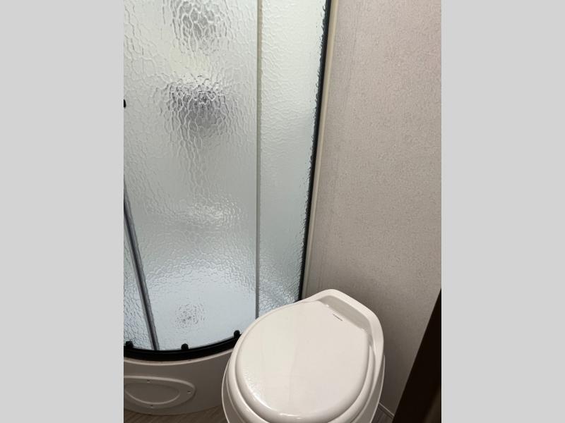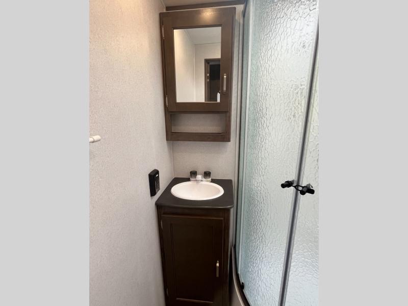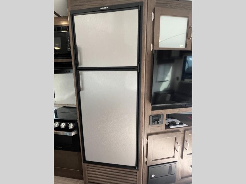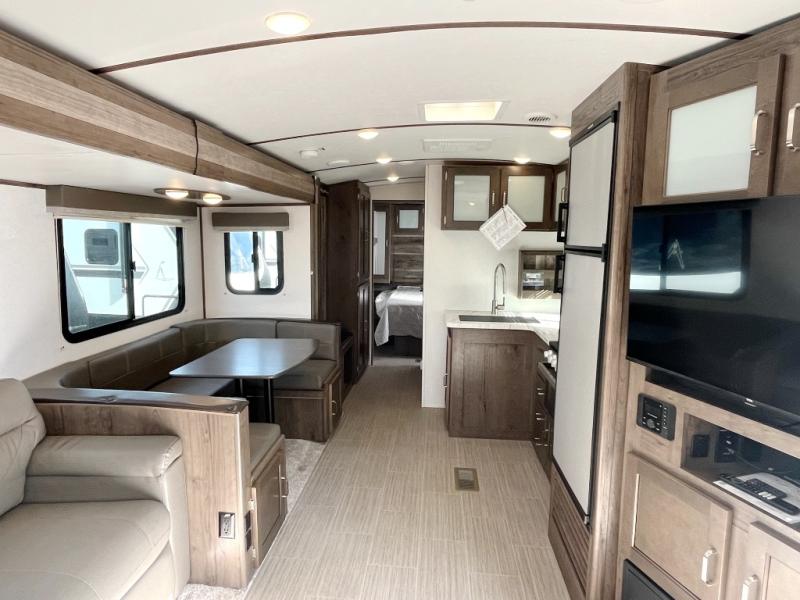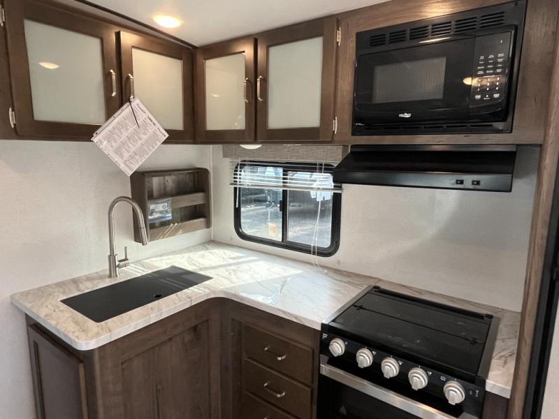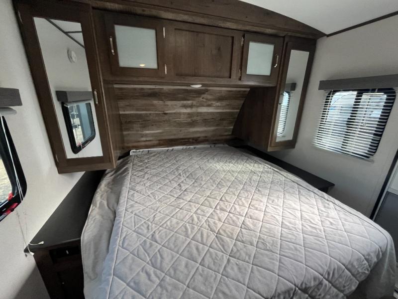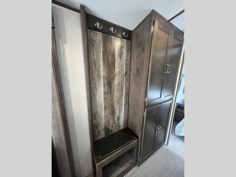 After you hike, bike, or fish, you can return to this Passport travel trailer to relax on a tri-fold sofa sleeper, one of the two recliners, or the U-shaped dinette. The furniture also doubles as extra sleeping space when you invite the grandkids. You will surely love the handy mudroom bench with coat hooks across from the bathroom, and you might even sneak out the second entry door in the morning to fish before your spouse or guests wake up. This trailer also allows you to store larger camping items in the exterior pass-through storage compartment away from the indoor items.