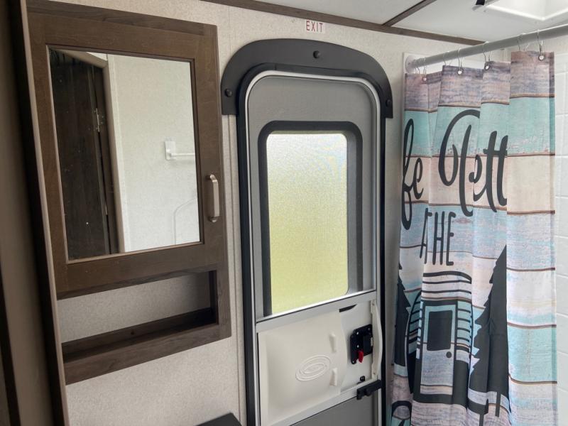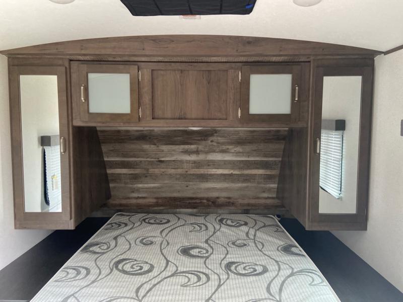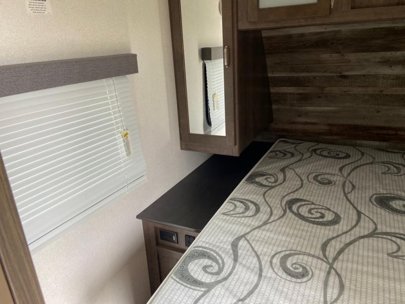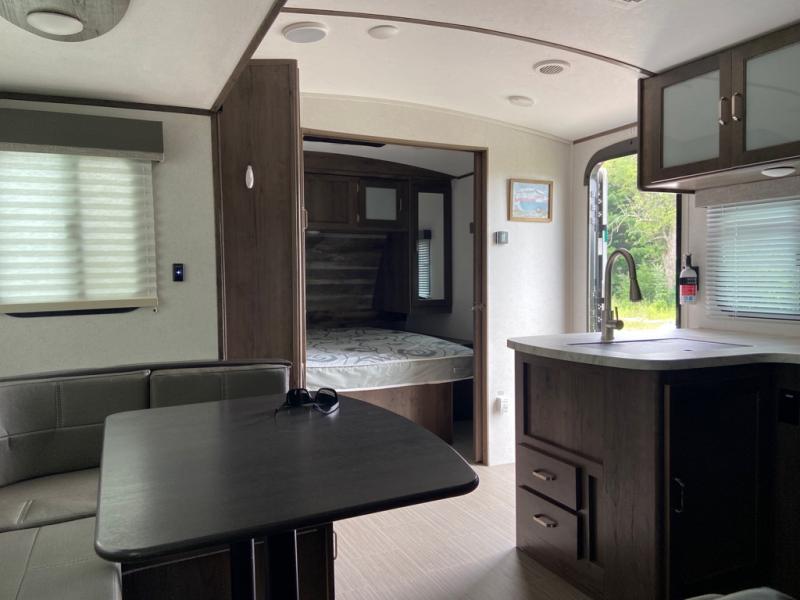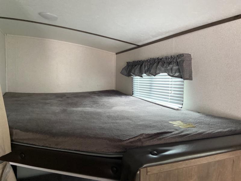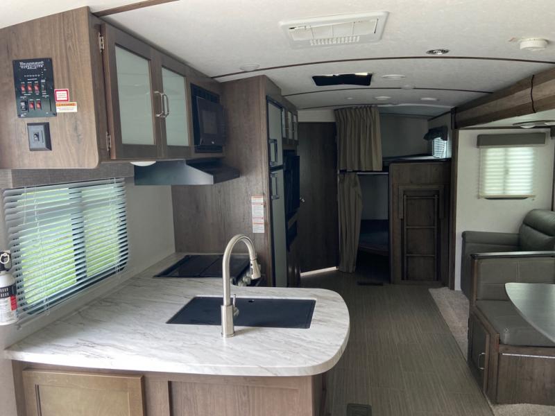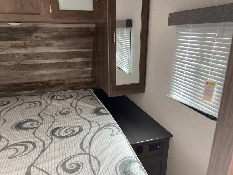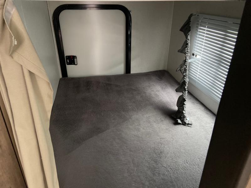 Can you envision your kids playing outside around the campsite while you cook meals at the outdoor kitchen on this Passport travel trailer? Your spouse will probably be sitting in a camp chair relaxing under the adjustable electric awning. This trailer will be perfect for your cooking preference, your spouse's relaxing idea, and your kids' sleeping arrangements. When it's time for bedtime, you can retire to your own master bedroom up front via the main entrance, and the kids can head to their own bunk beds in the rear through the exterior bathroom entrance. The bottom flip-up bunk allows you to store extra items when traveling down the road.