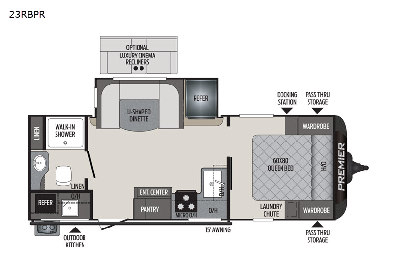 Throughout all of your adventures, this Premier will be your very best friend! Bring along your family or friends to sleep on the U-shaped dinette while you have your own queen-size bed in the front bedroom. And the rear bathroom will add extra privacy as you get ready in the morning. You can also prepare a delicious breakfast for the group with the three-burner range in the kitchen, and the 8 cubic foot stainless steel double-door refrigerator will give you the space you need to keep your cold items fresh. You might like to make a few meals outdoors at the outside kitchen and relax under the 15' awning. The oversized pass-through storage includes lighting and allows you to stow away the larger camping items such as chairs, tables, and fishing poles.