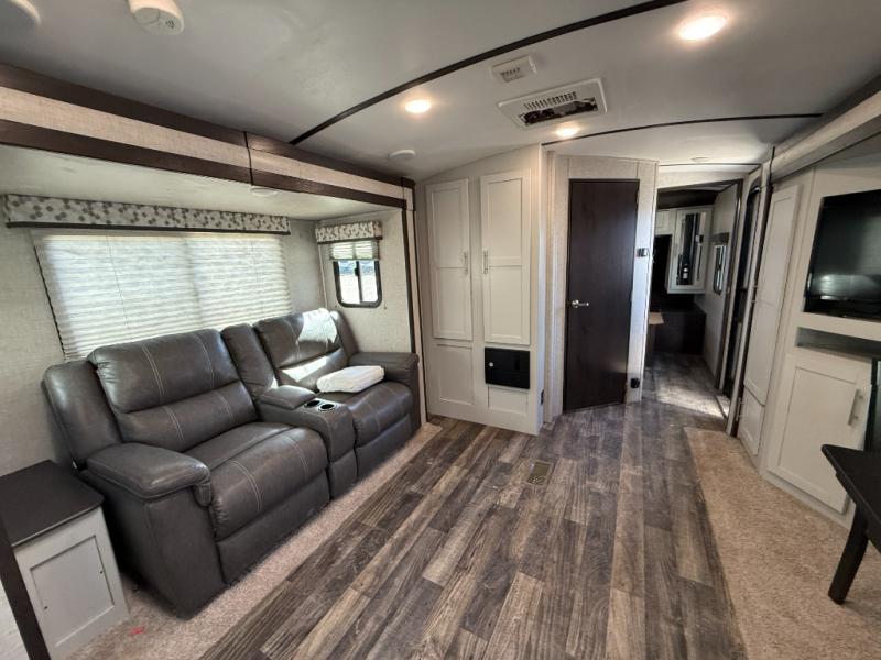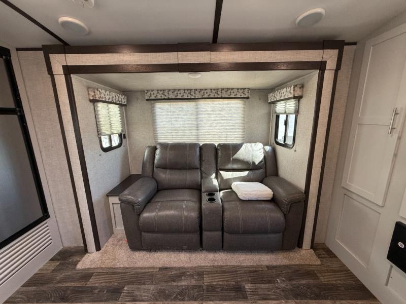 Whether you are relaxing on the queen-size bed in the front bedroom with access to the full bathroom, lounging on the tri-fold sofa, or baking an afternoon snack in the oven in the rear kitchen, this trailer gives you the amenities you need where you need them. And if you prefer your dirty laundry not be be cluttered up on the floor, then you will thoroughly enjoy using the laundry chute that passes your garments down to the exterior pass-through storage that includes lighting. You might like to add the luxury cinema recliners option in place of the tri-fold sofa, either way you will love the furniture.