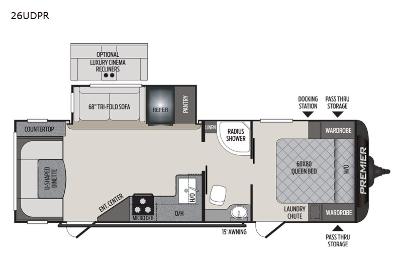 Don't waste time on mediocre vacationing when you can step it up a notch with this Premier! Whether you're whipping up a delicious and hearty meal on the three-burner range or you are indulging in that meal on the U-shaped dinette, each moment that you spend in this trailer will truly be exceptional. After you've taken in the beautiful outdoor scenery each day through the windows or actually outdoors and exhausted yourself by hiking to each mountain's peak, you will thoroughly enjoy resting for the evening on the 68" tri-fold sofa as you watch a movie on the 42" LED TV. You might even like to choose the luxury cinema recliners option in place of the tri-fold sofa, either way you will be comfortable.