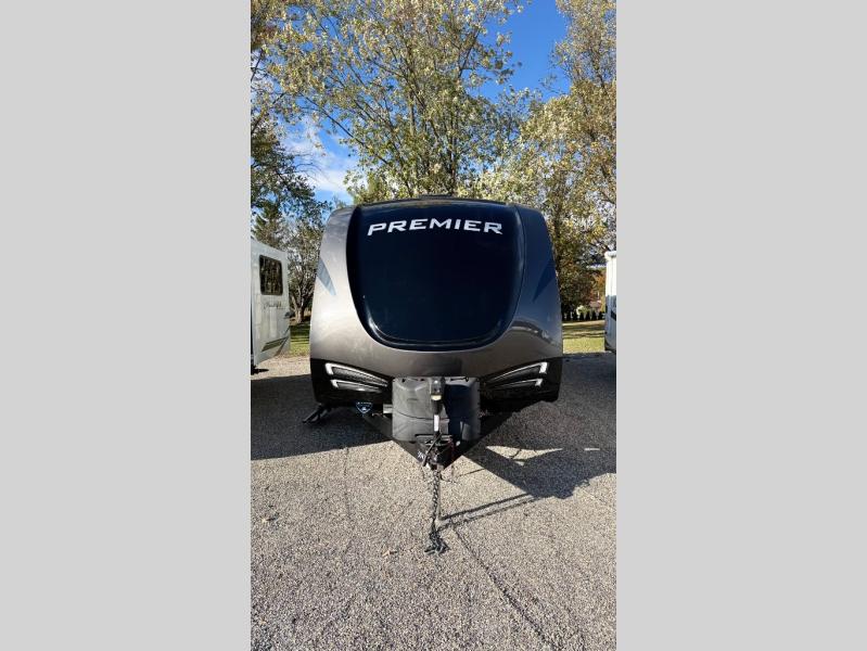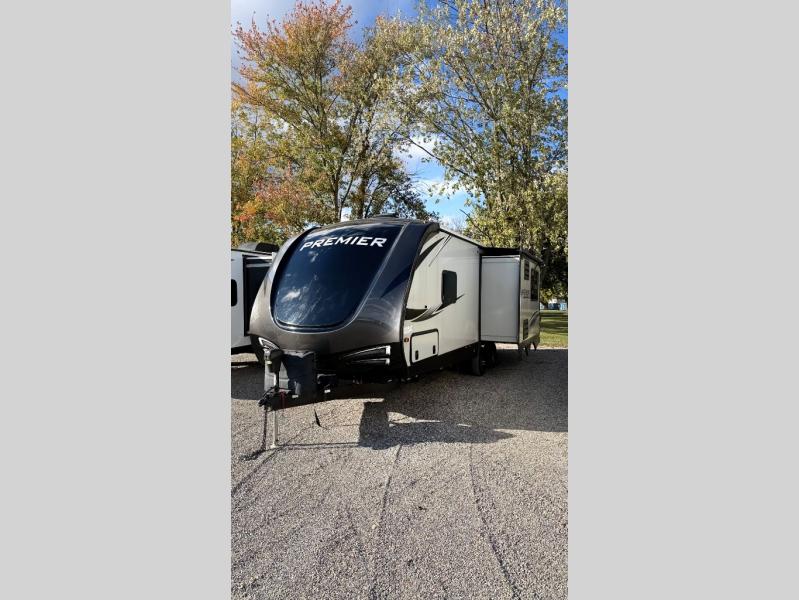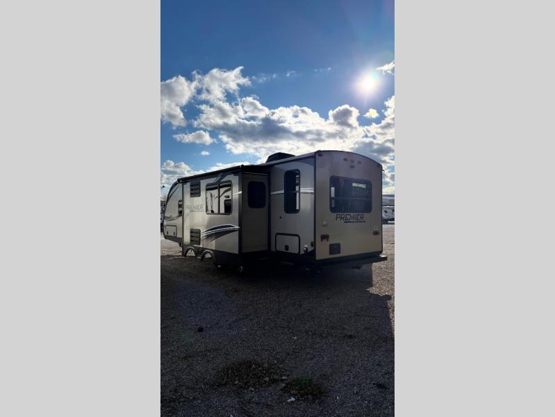 With each Premier Ultra Lite travel trailer by Keystone you will appreciate the detail to construction including the aggressive front profile for increased towability, the aluminum-frame side, front and rear walls and slide outs, the walkable roof, and the Darco moisture barrier plus the enclosed and heated underbelly to be able to travel during any season. Inside, you'll be pleased with the hand-painted solid wood cabinet doors, the vaulted ceiling, the USB charging ports in the bedroom, and the porcelain foot flush toilet. Don't wait to get away in style, choose a Premier today!