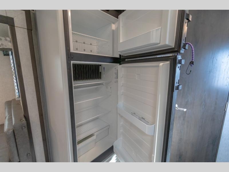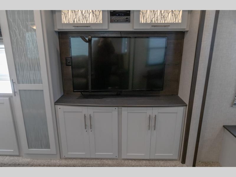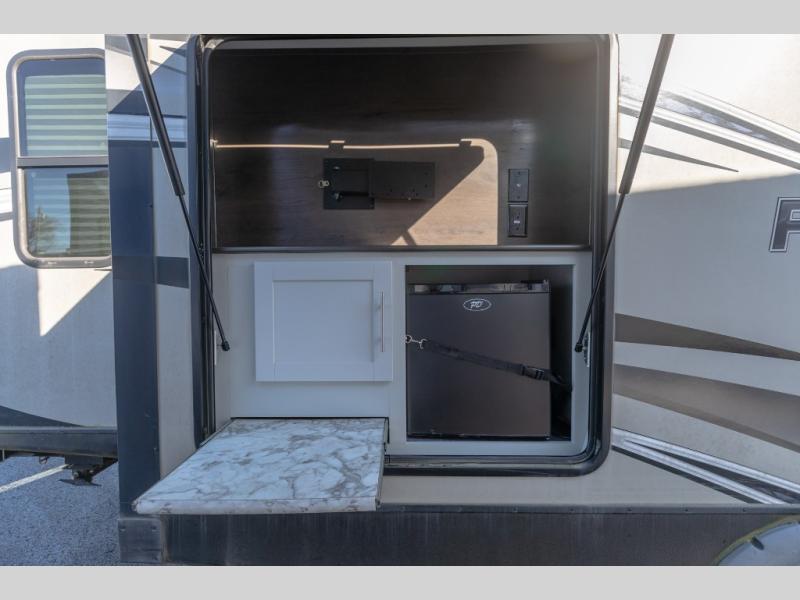If you enjoy traveling in luxury then choose this Premier as your next travel trailer. From its fully stocked kitchen with an 8 cubic foot stainless steel double-door refrigerator and a kitchen island, to its relaxing private bedroom with a queen-size bed and private bathroom entrance, this trailer will wow you at every turn. The luxury cinema recliners and tri-fold sofa offer comfortable seating to visit with family and friends while enjoying the fireplace, and the Dream dinette allows you to eat indoors when you aren't outside enjoying the 20' awning coverage. And you can watch the outdoor entertainment center while grabbing a cold drink from the outside refrigerator.