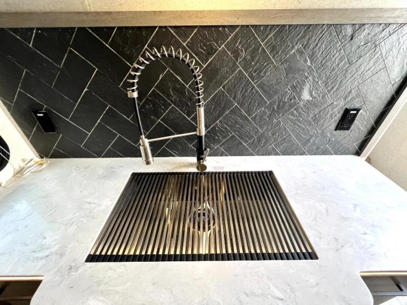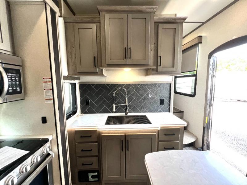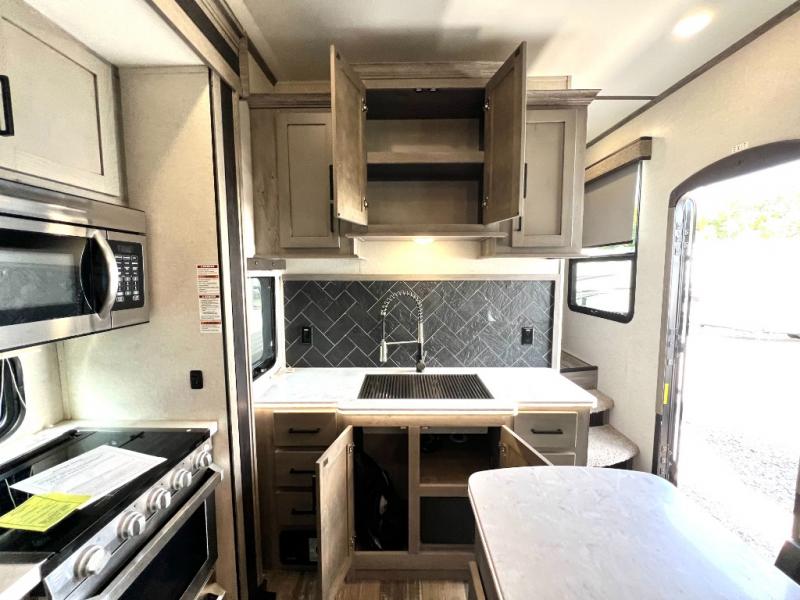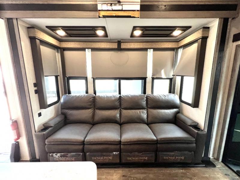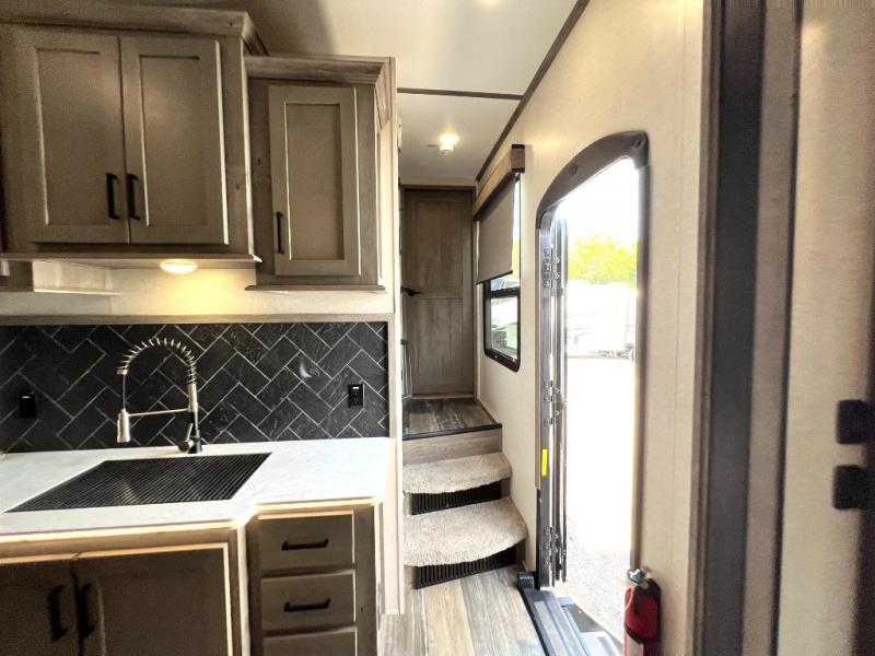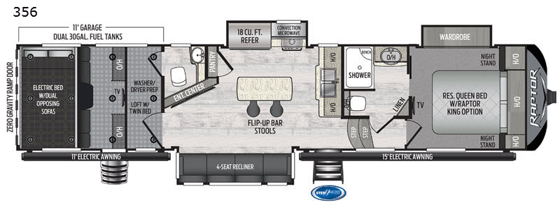 Each Raptor toy hauler fifth wheel by Keystone is built with the 6-point hydraulic auto-leveling, an on-board fuel station, the Ram air ventilation system in the garage, Equa-Flex Trailair suspension, frame-welded tie downs for your toys, and a heated and enclosed underbelly allowing you to travel 365 days if you like. Inside you will experience comfort, convenience and style with reclining furniture with heat, light and massage, USB ports in the sofa slide out box, wood crown molding, plus much more! Why limit yourself, choose the Raptor that fits your adventurous side and start your engines!