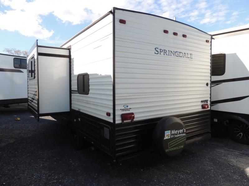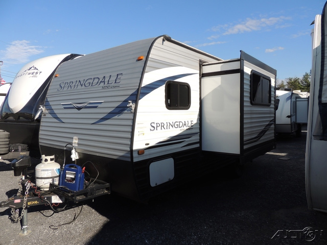Get ready for any camping trip whether near or far! You will want an easy to tow, lightweight Keystone Springdale Mini travel trailer or toy hauler. These models have tinted safety glass windows, a mega exterior pass through storage area, E-coated corrosion-resistant wheels for a smoother ride. Inside you will enjoy plenty of features such as the cable TV hookup with a booster, the sleek black Furrion microwave, plus there is LED lighting so that you can see clearly whether day or night. There is also a CD/Bluetooth radio and a reversible bedspread, plus so much more! So don't waste anymore time, come choose today the Keystone Springdale Mini travel trailer or toy hauler that best suits you!