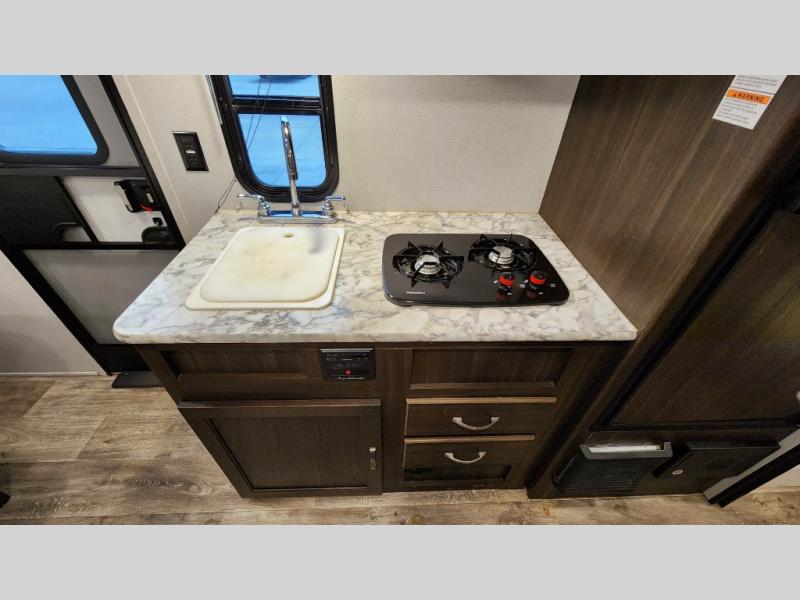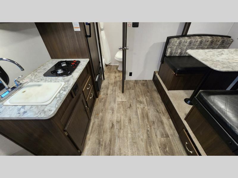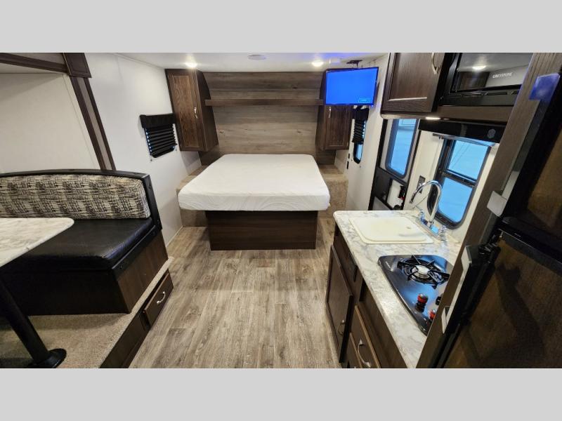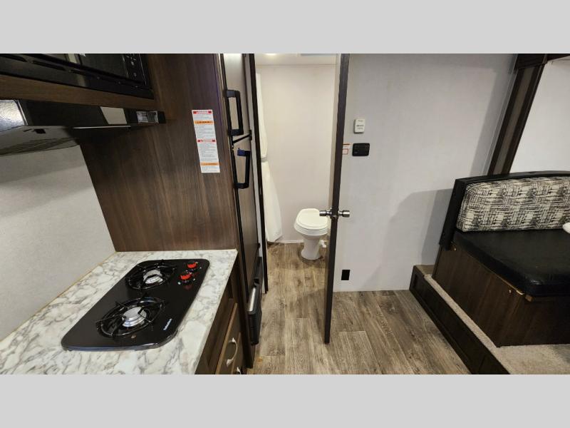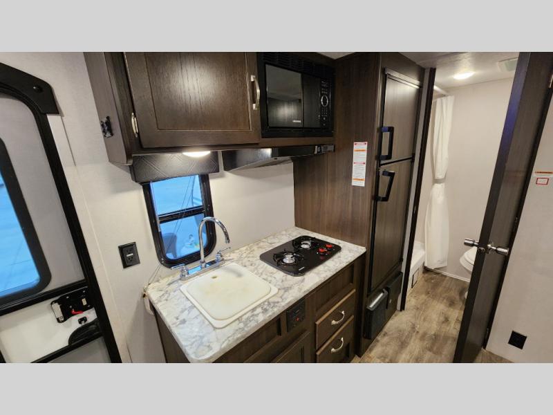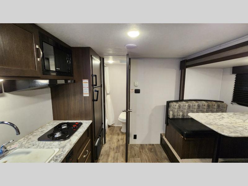 This Keystone Springdale Mini 1790FQ travel trailer will take you and your spouse or small family to new heights for your next camping trip! It features a full rear bath for your convenience, as well as for extra privacy. Cooking up your favorite meals will be a breeze inside the kitchen and if you have leftovers then you can enjoy them once again after storing them inside the refrigerator. Meal time will be even more comfortable and enjoyable when you dine at the booth dinette, which you can even transform into an extra sleeping space at night. When you're ready to hit the hay, then head up front and enjoy a good night's rest on the cozy queen bed with a reversible bedspread and it has nightstands on either side, as well as closets on either side and overhead cabinets above!