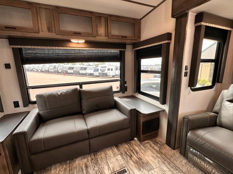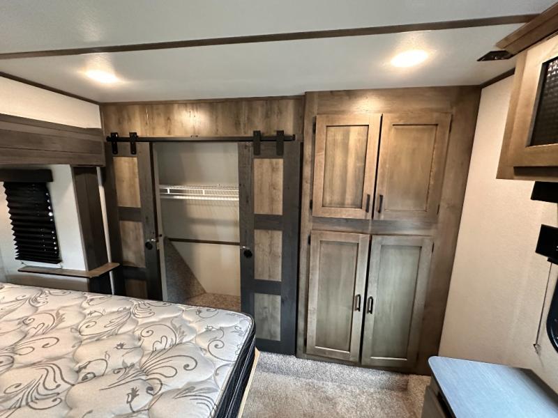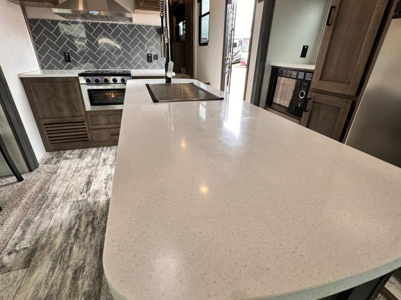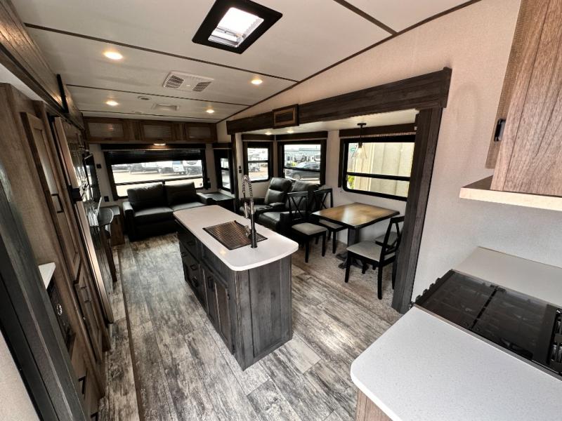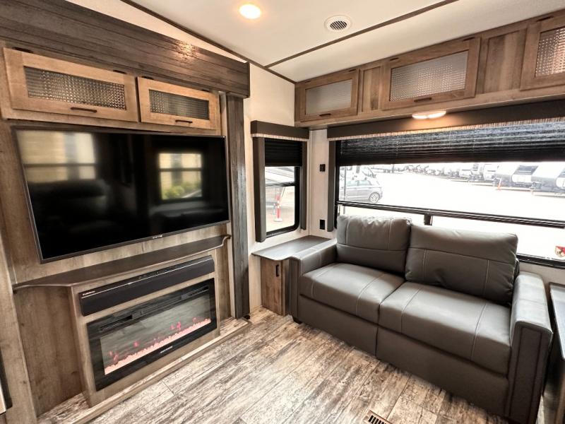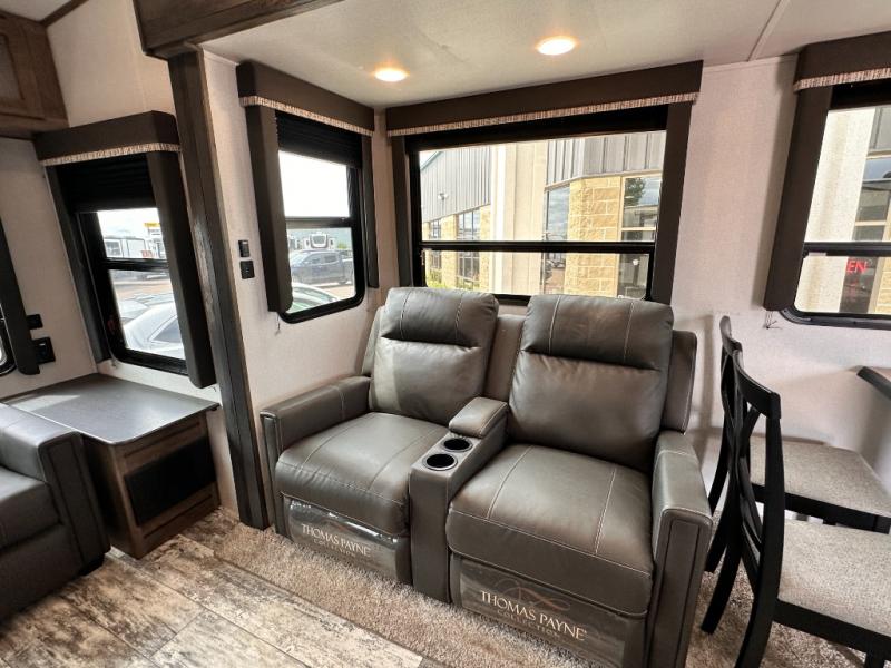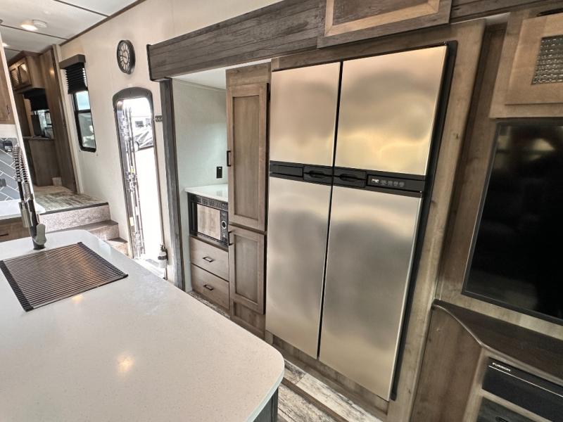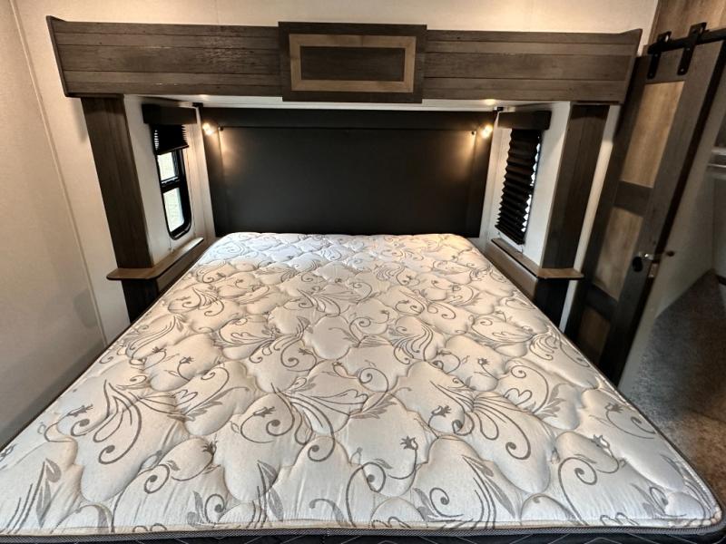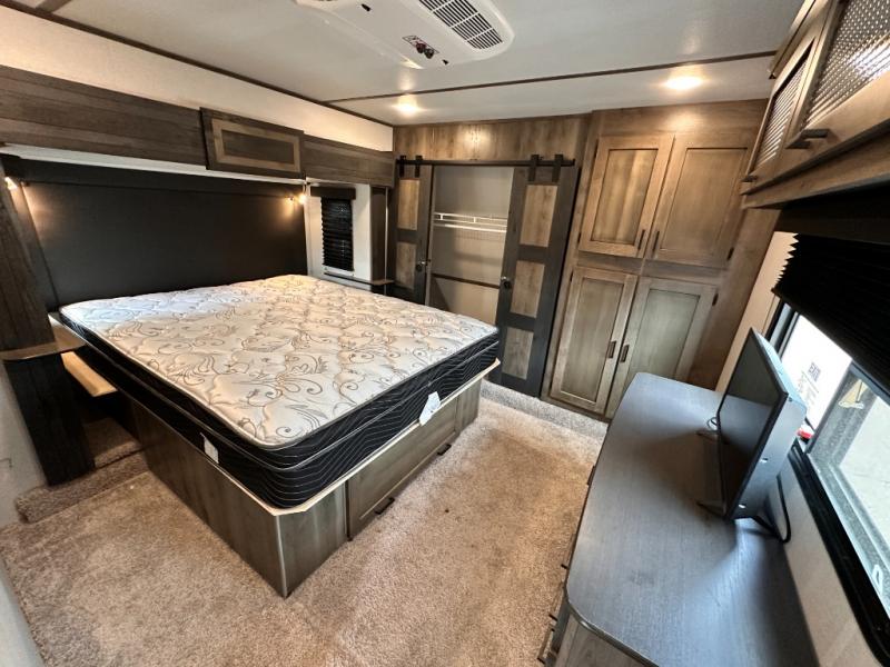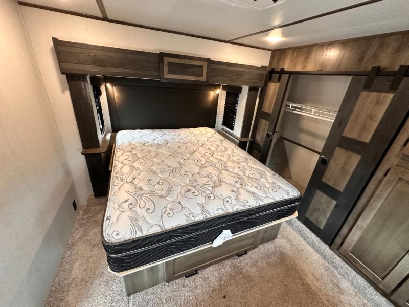 Whether you are going full-time RVing or just looking for a unit to camp with on the weekends, this fifth wheel is for you. You'll find dual opposing slides in the rear living area and plenty of comfortable seating space on the full reclining theater seating, the queen size tri-fold sofa, or at the booth dinette. The chef of the family can prepare a hearty breakfast on the residential range top and the kitchen island will provide extra counter space. Fill your day with hiking, biking, or canoeing and the full bath will be waiting for you to clean up just like at home. This model features a front private bedroom with a slide out king bed, a large wardrobe with barn doors, and there has even been a space prepped to add a washer and dryer if you choose that option.