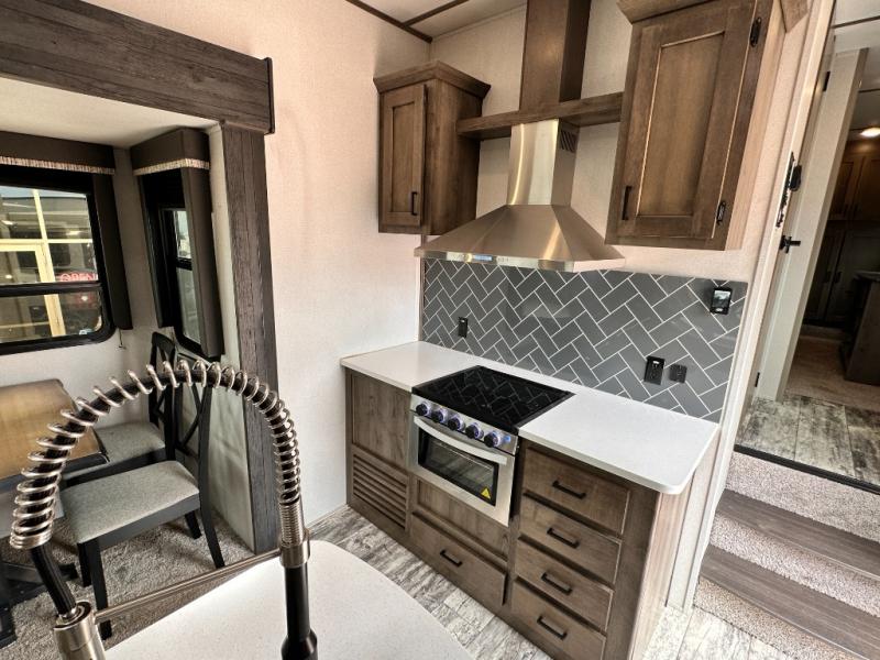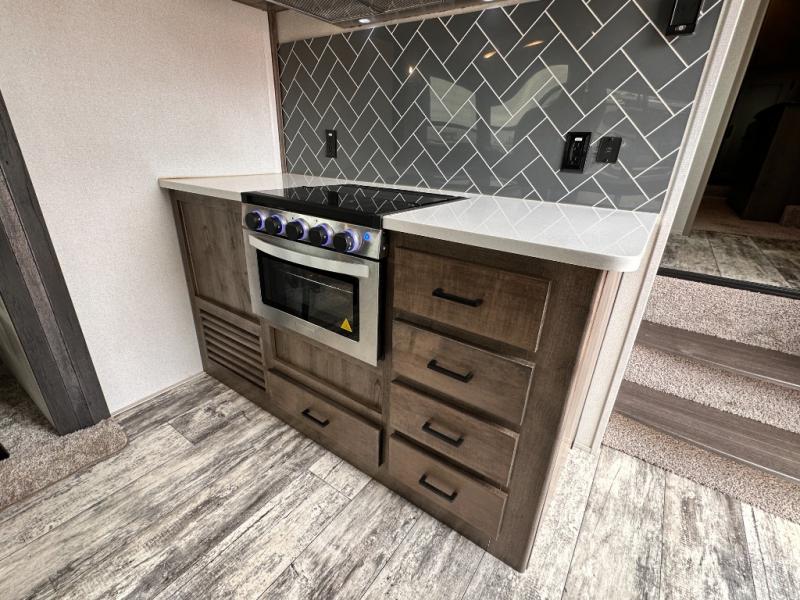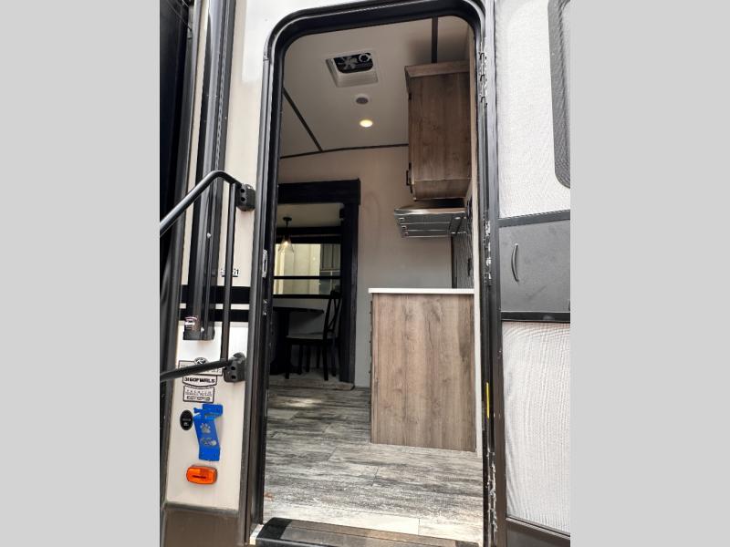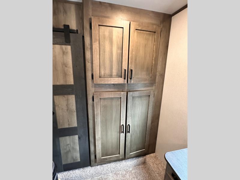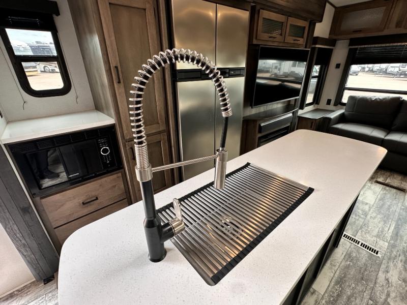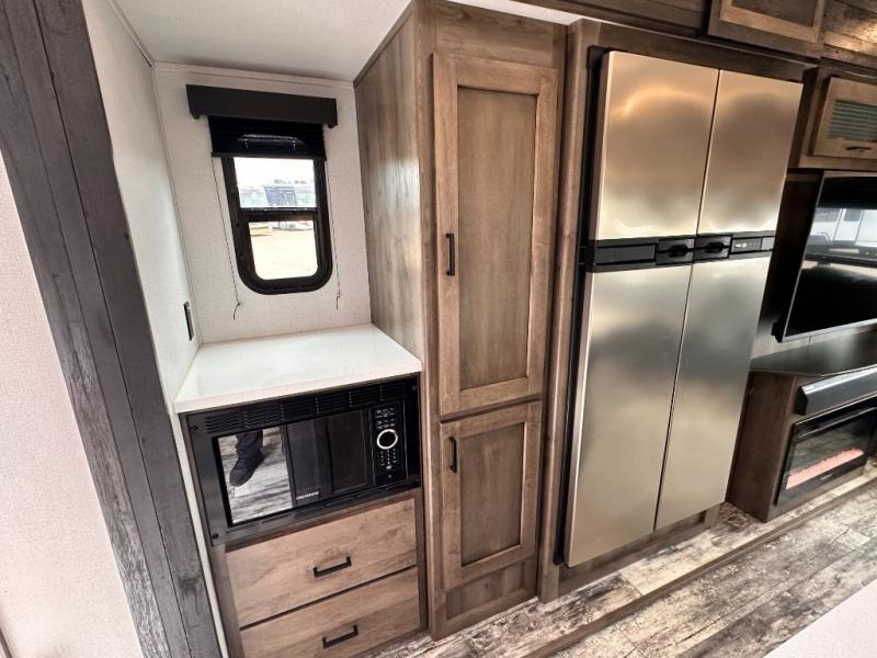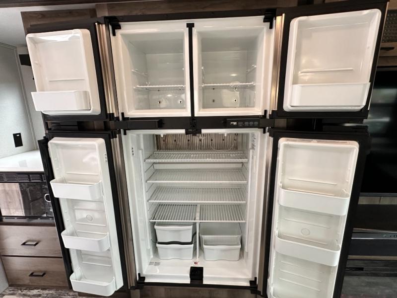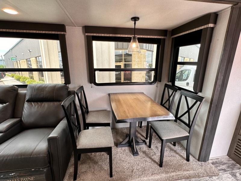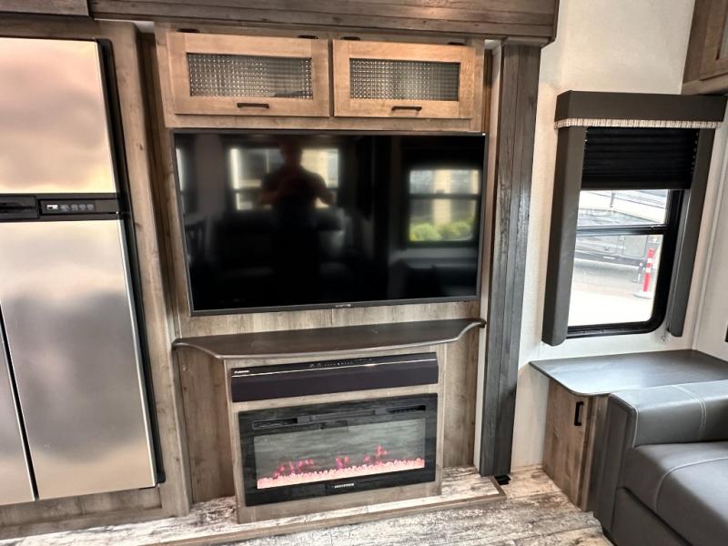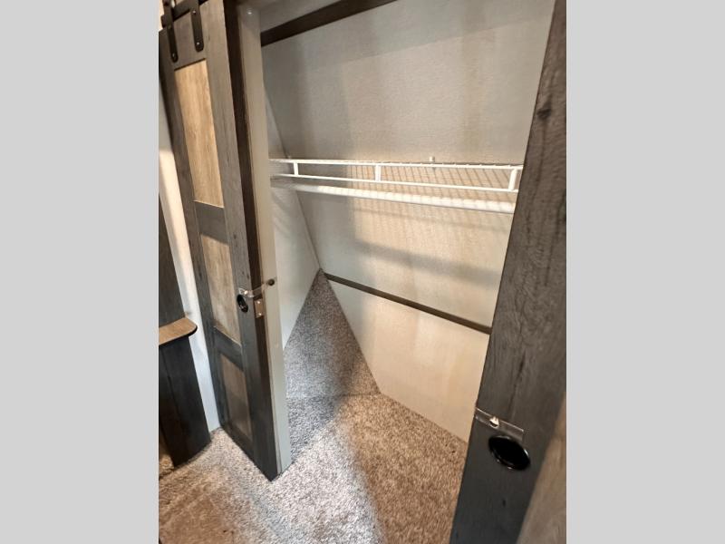 Whether you are going full-time RVing or just looking for a unit to camp with on the weekends, this fifth wheel is for you. You'll find dual opposing slides in the rear living area and plenty of comfortable seating space on the full reclining theater seating, the queen size tri-fold sofa, or at the booth dinette. The chef of the family can prepare a hearty breakfast on the residential range top and the kitchen island will provide extra counter space. Fill your day with hiking, biking, or canoeing and the full bath will be waiting for you to clean up just like at home. This model features a front private bedroom with a slide out king bed, a large wardrobe with barn doors, and there has even been a space prepped to add a washer and dryer if you choose that option.