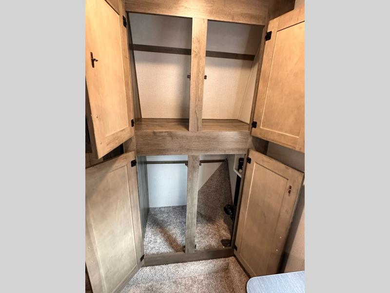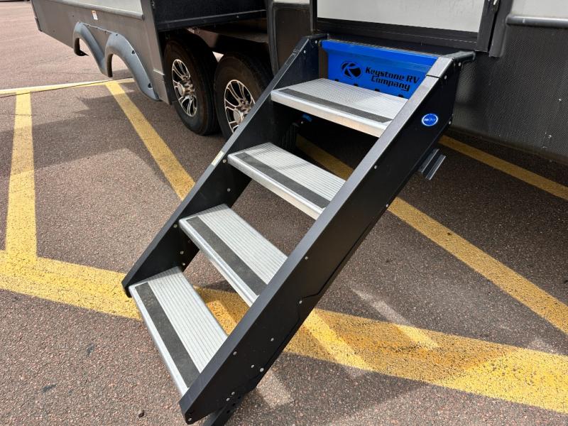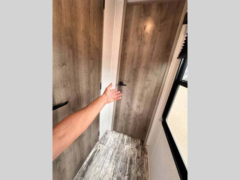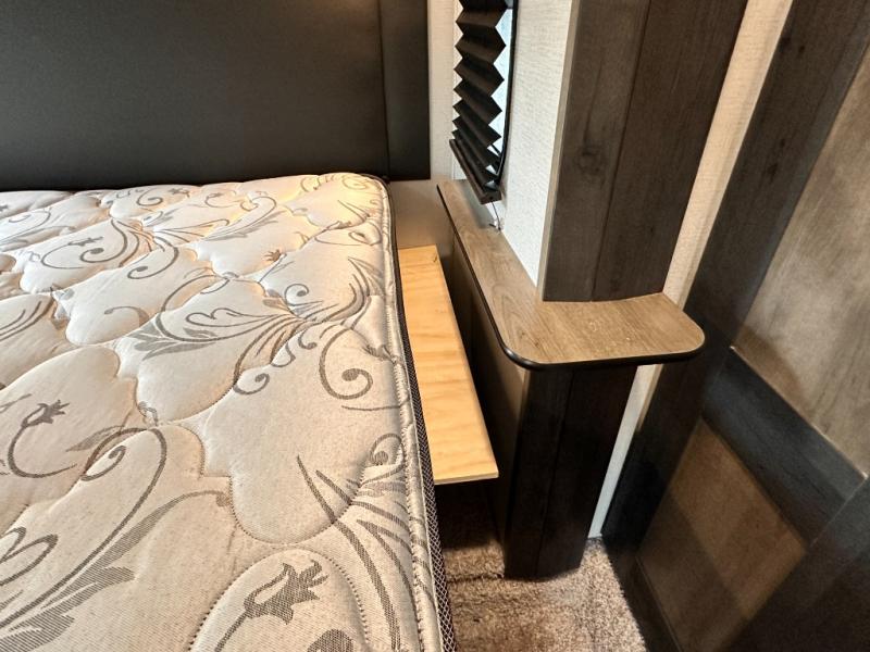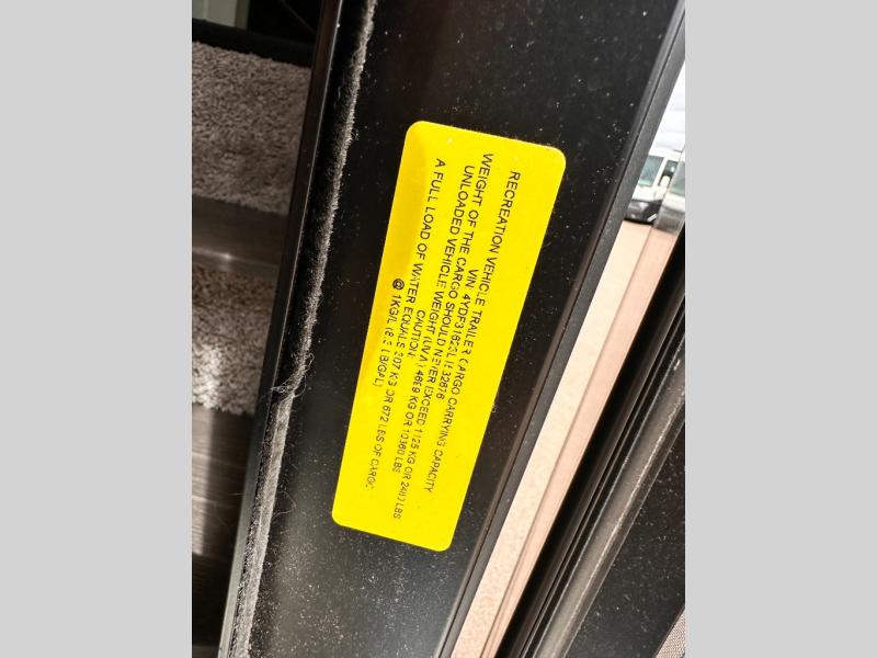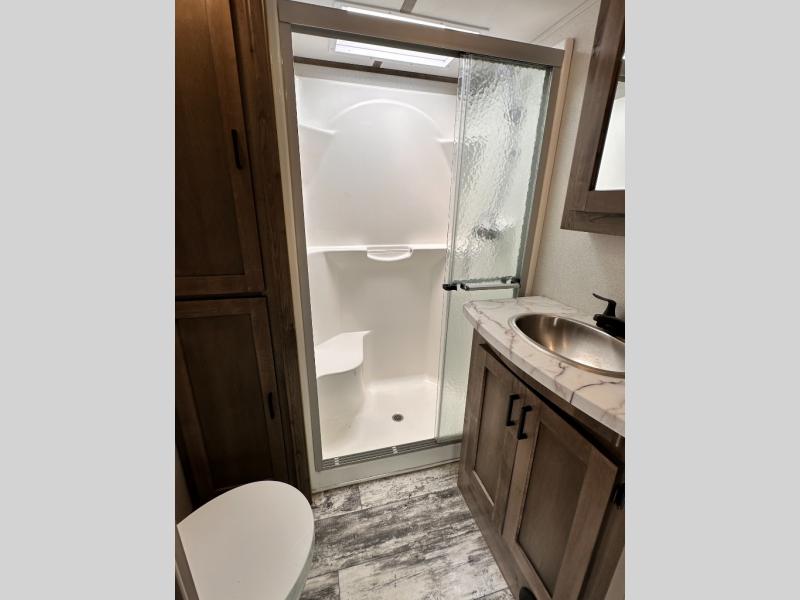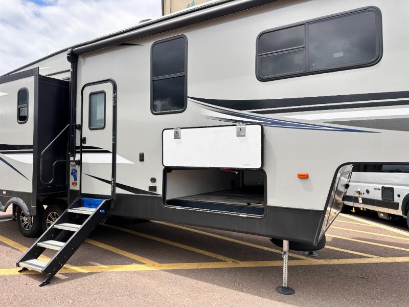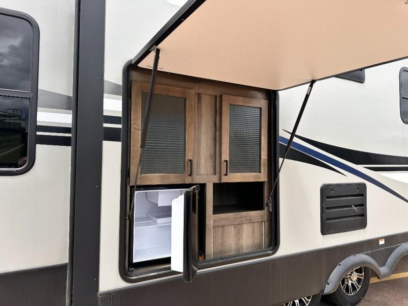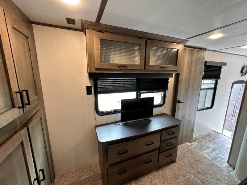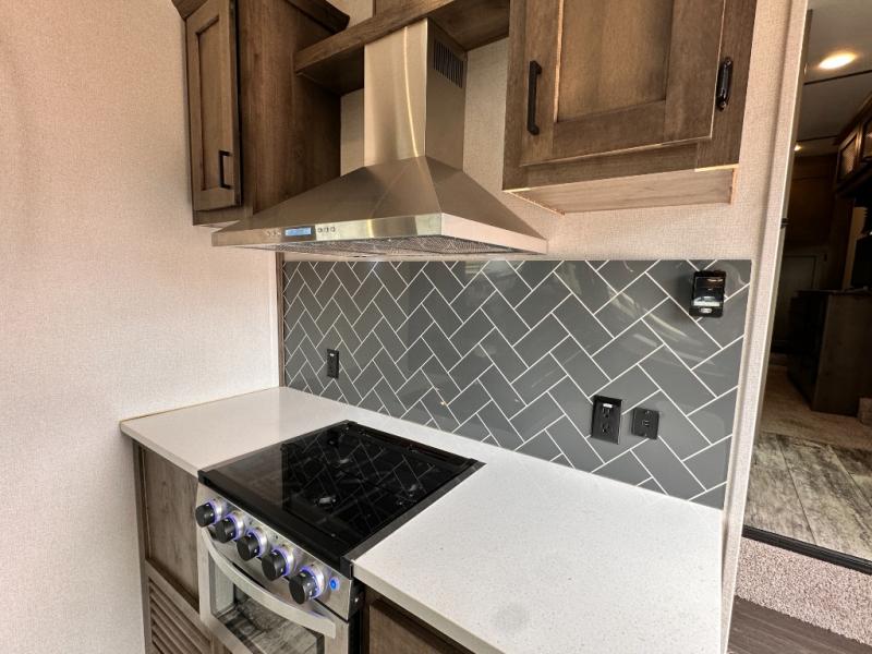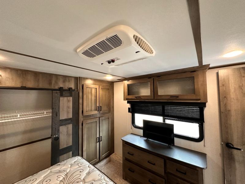 Whether you are going full-time RVing or just looking for a unit to camp with on the weekends, this fifth wheel is for you. You'll find dual opposing slides in the rear living area and plenty of comfortable seating space on the full reclining theater seating, the queen size tri-fold sofa, or at the booth dinette. The chef of the family can prepare a hearty breakfast on the residential range top and the kitchen island will provide extra counter space. Fill your day with hiking, biking, or canoeing and the full bath will be waiting for you to clean up just like at home. This model features a front private bedroom with a slide out king bed, a large wardrobe with barn doors, and there has even been a space prepped to add a washer and dryer if you choose that option.