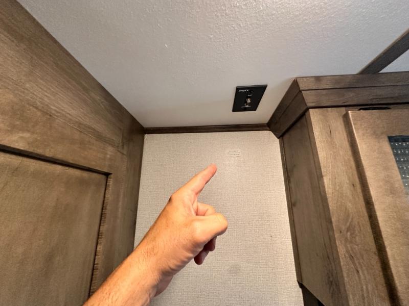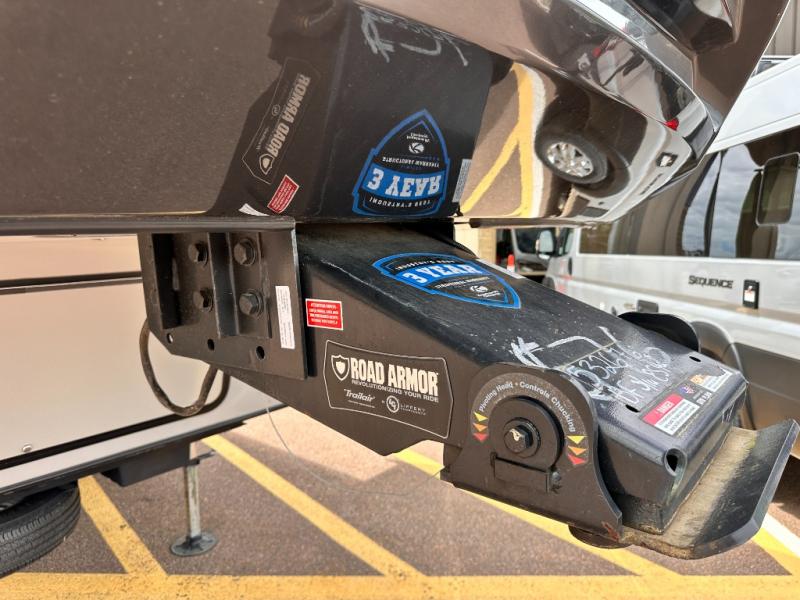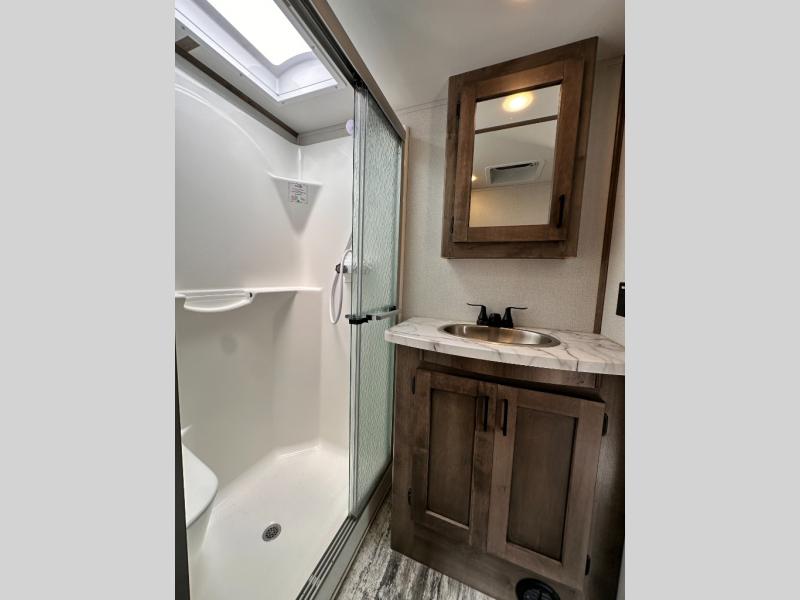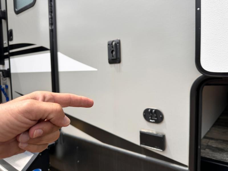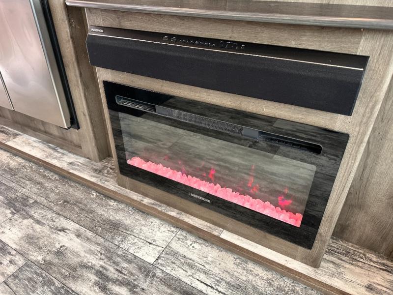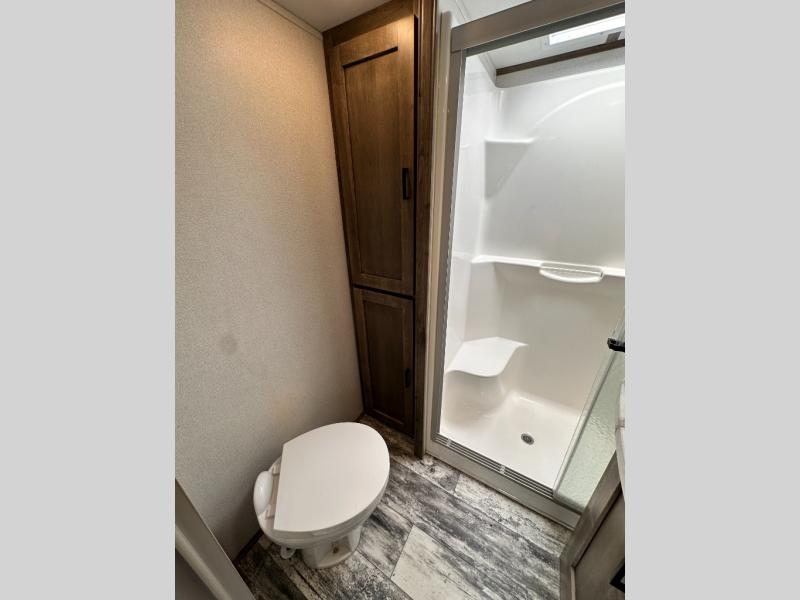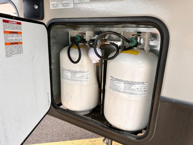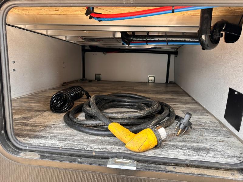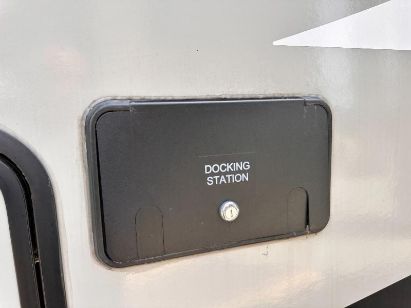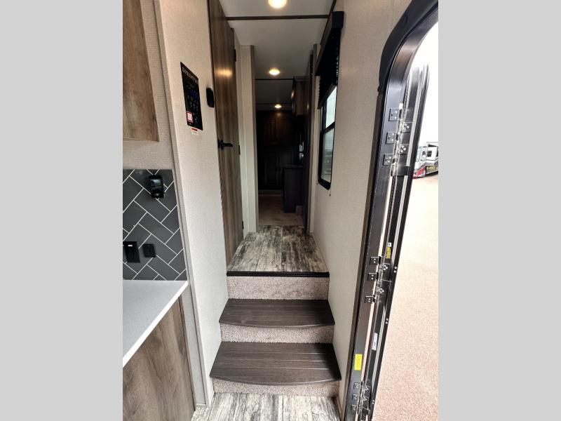Whether you are going full-time RVing or just looking for a unit to camp with on the weekends, this fifth wheel is for you. You'll find dual opposing slides in the rear living area and plenty of comfortable seating space on the full reclining theater seating, the queen size tri-fold sofa, or at the booth dinette. The chef of the family can prepare a hearty breakfast on the residential range top and the kitchen island will provide extra counter space. Fill your day with hiking, biking, or canoeing and the full bath will be waiting for you to clean up just like at home. This model features a front private bedroom with a slide out king bed, a large wardrobe with barn doors, and there has even been a space prepped to add a washer and dryer if you choose that option.