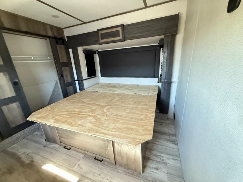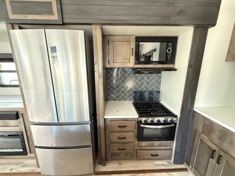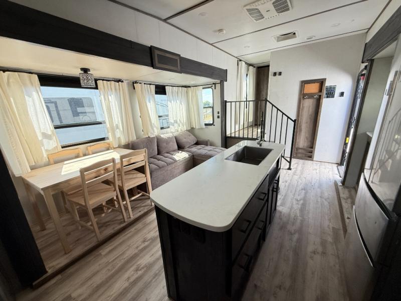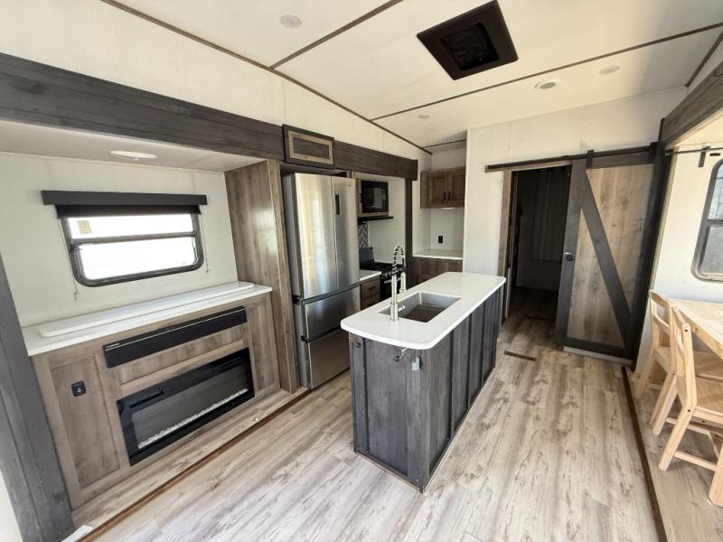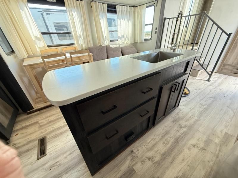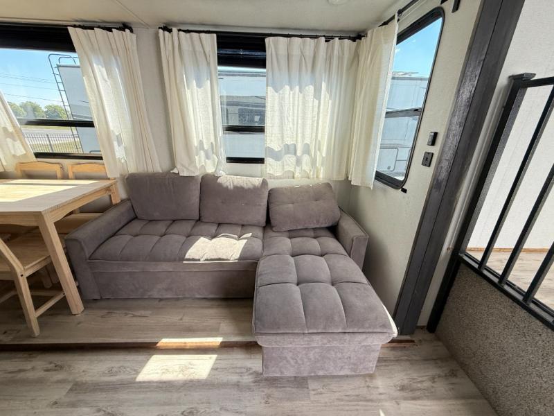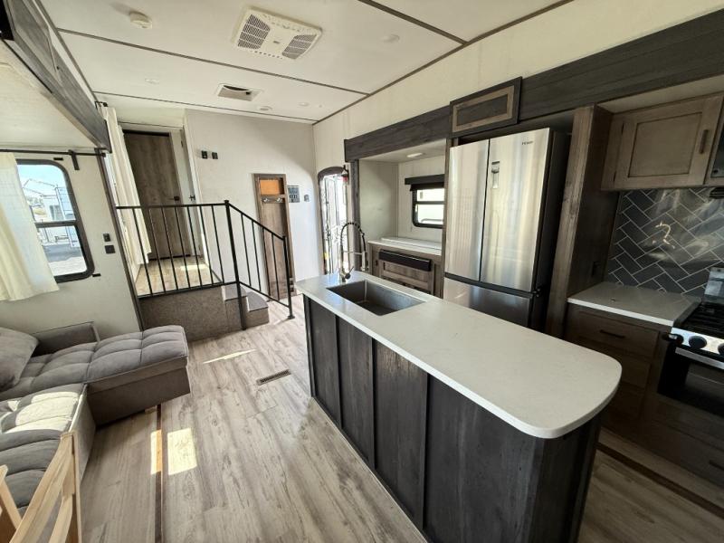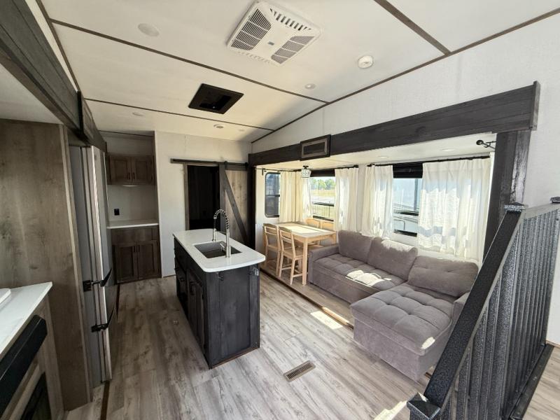 The grandkids are going to love this fifth wheel that features a rear private bunkhouse they can call their own. There is a sleeper sofa with a bunk above and a second bunk with storage below on the other side of the bunkhouse and the slide out allows the kids to play a game on the floor. Prepare all your meals on the three burner range and the kitchen island with solid surface countertops will provide additional counter space. While the chef of the family is preparing dinner, you can enjoy a show on the pop-up 50" HDTV that is directly across from the full reclining theater seating for easy viewing. When it's time to call it a night, head up the stairs to the full bath to freshen up and the king bed slide out will provide a great night's rest. This model also includes plenty of storage, including pot/pan drawers in the kitchen, a large wardrobe with barn doors in the bedroom, and storage in the bunkhouse for the kids' toys.