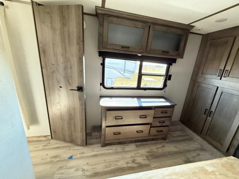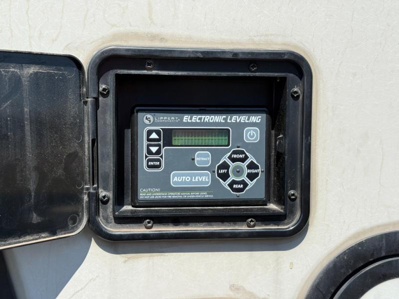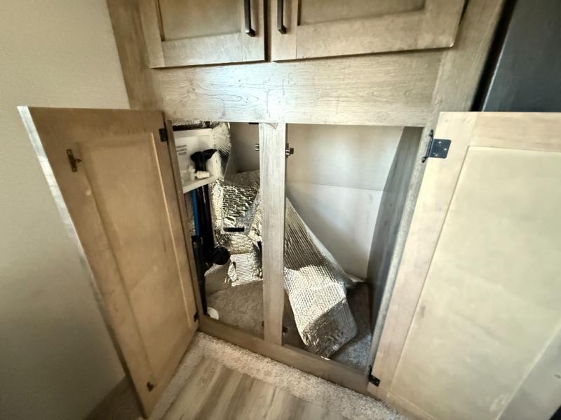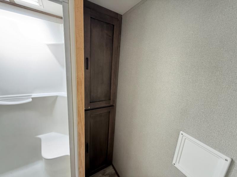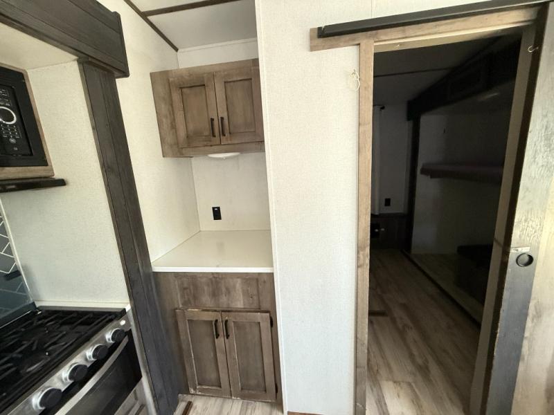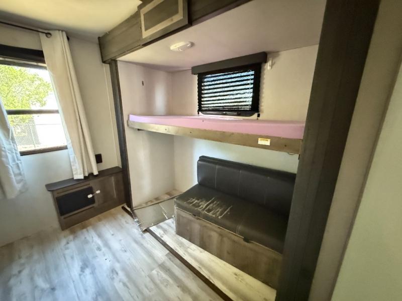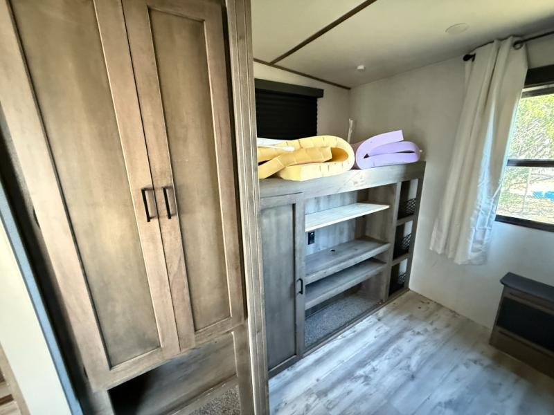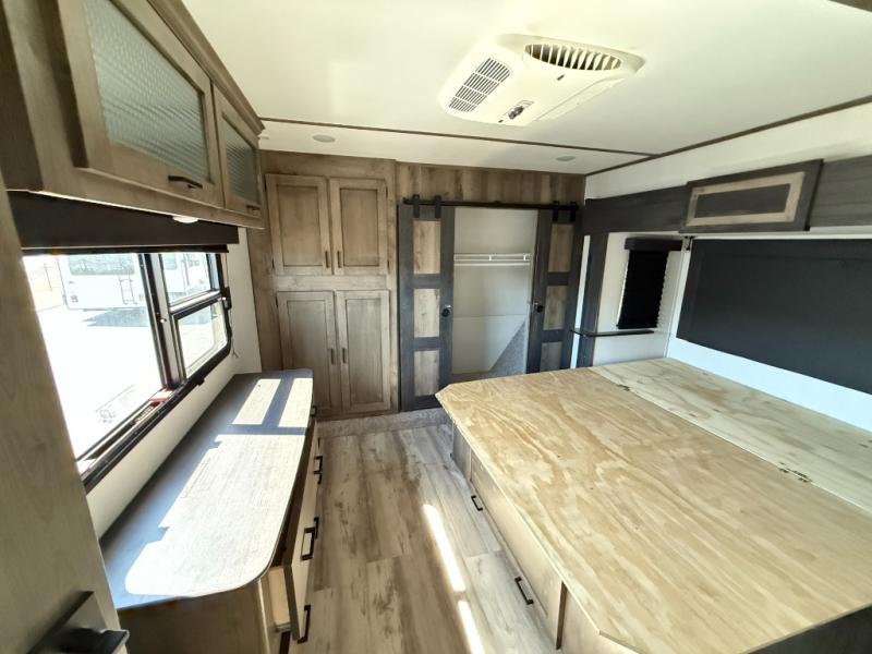 The grandkids are going to love this fifth wheel that features a rear private bunkhouse they can call their own. There is a sleeper sofa with a bunk above and a second bunk with storage below on the other side of the bunkhouse and the slide out allows the kids to play a game on the floor. Prepare all your meals on the three burner range and the kitchen island with solid surface countertops will provide additional counter space. While the chef of the family is preparing dinner, you can enjoy a show on the pop-up 50" HDTV that is directly across from the full reclining theater seating for easy viewing. When it's time to call it a night, head up the stairs to the full bath to freshen up and the king bed slide out will provide a great night's rest. This model also includes plenty of storage, including pot/pan drawers in the kitchen, a large wardrobe with barn doors in the bedroom, and storage in the bunkhouse for the kids' toys.