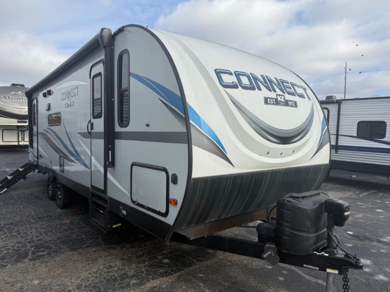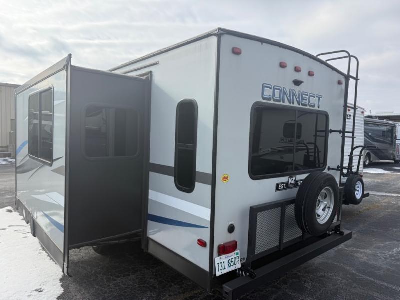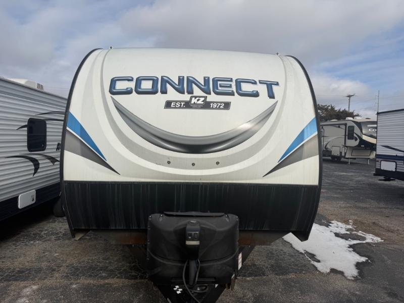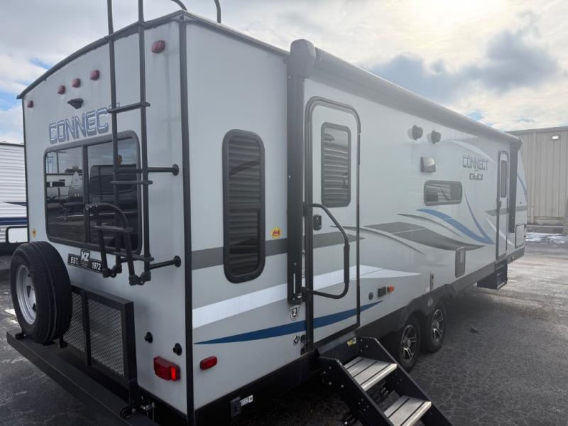 The KZ Connect travel trailer lets you connect your modern life to your explorative spirit! While you journey to your favorite locations, you will still be able to enjoy all of the many conveniences you love about your own home. The Connect is reliable and sturdy with its one-piece seamless roof with SuperFlex roofing material, its 3/8" fully walk-on roof decking, and its protective front diamond plate. Each Connect comes with extra-large baggage doors with magnetic catches so that your gear also has a comfortable place to call home, and the 71" flip-down storage rack on the back of the Connect will be amazingly helpful as you tow your bikes to the campsite. Not only is the exterior enticing, but so is the interior with its multimedia sound bar stereo, motion-sensor lighting, and color-accented shower walls.